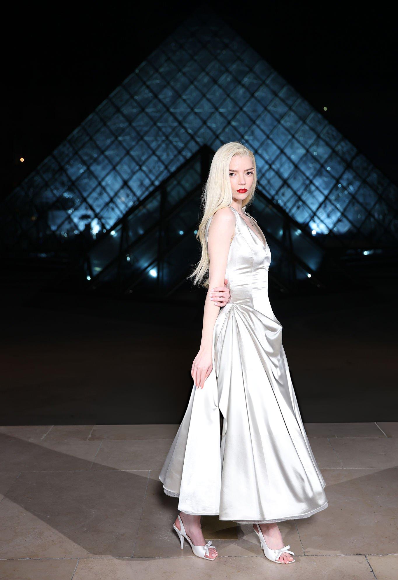 Photos and pictures of Anya Taylor-Joy taken at the 2026 Grand Diner Du Louvre. Anya wears silk and satin at the Musee du Louvre event. She is seen in a satin dress and silk heels.