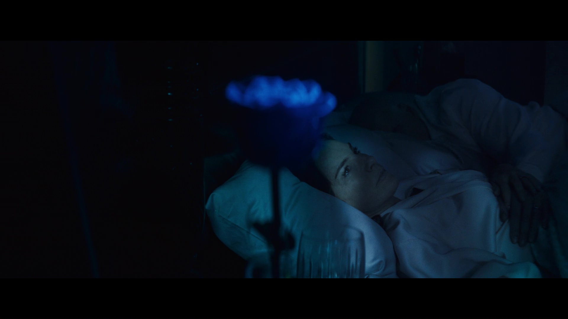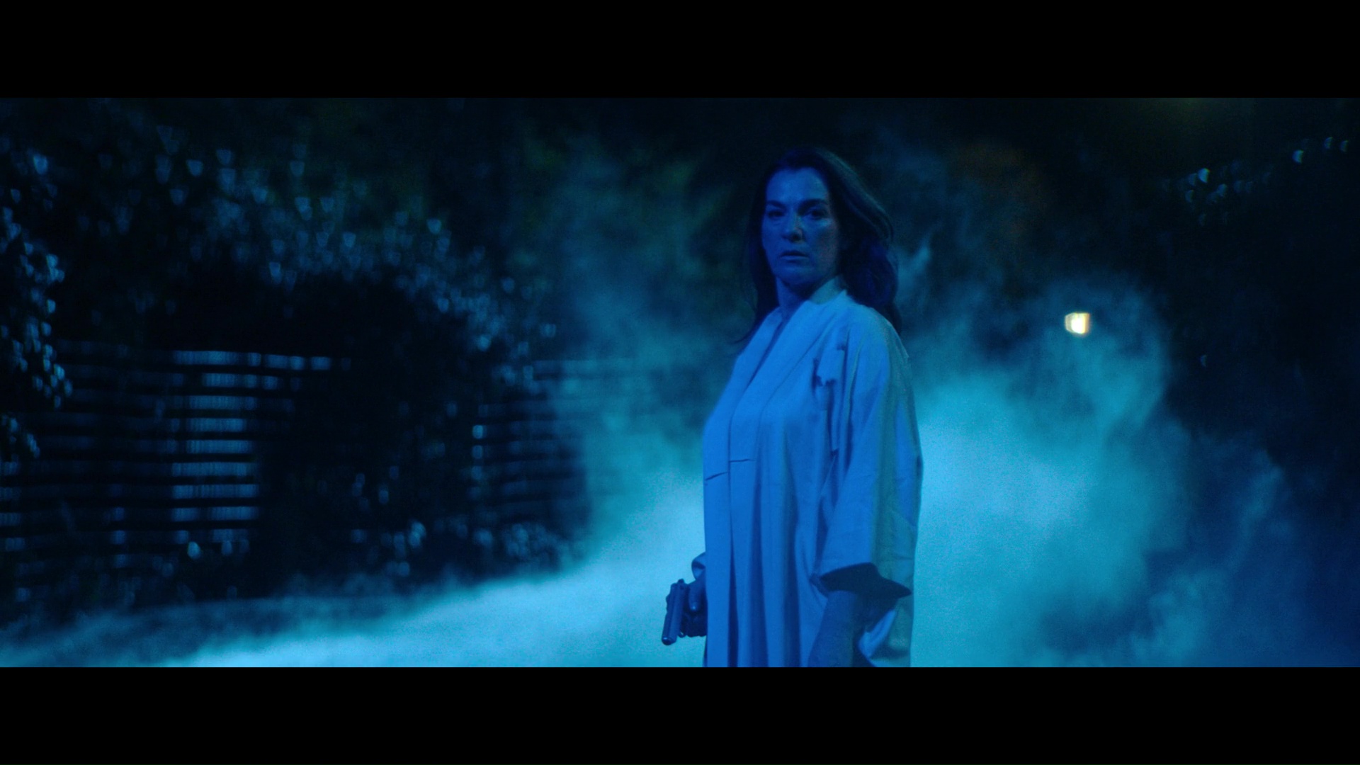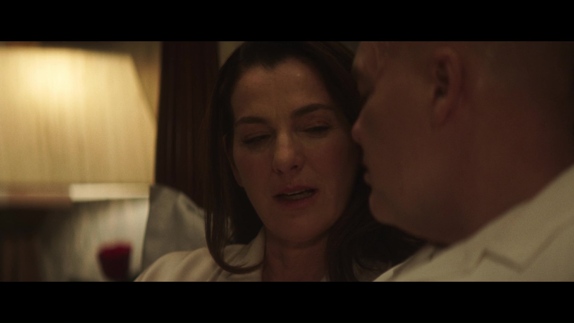 Daredevil: Born Again screencaps from the second season of the Disney+ Marvel series. Ayelet Zurer wears a long satin dressing gown over a silk nightie. She appears as the character Vanessa Fisk.