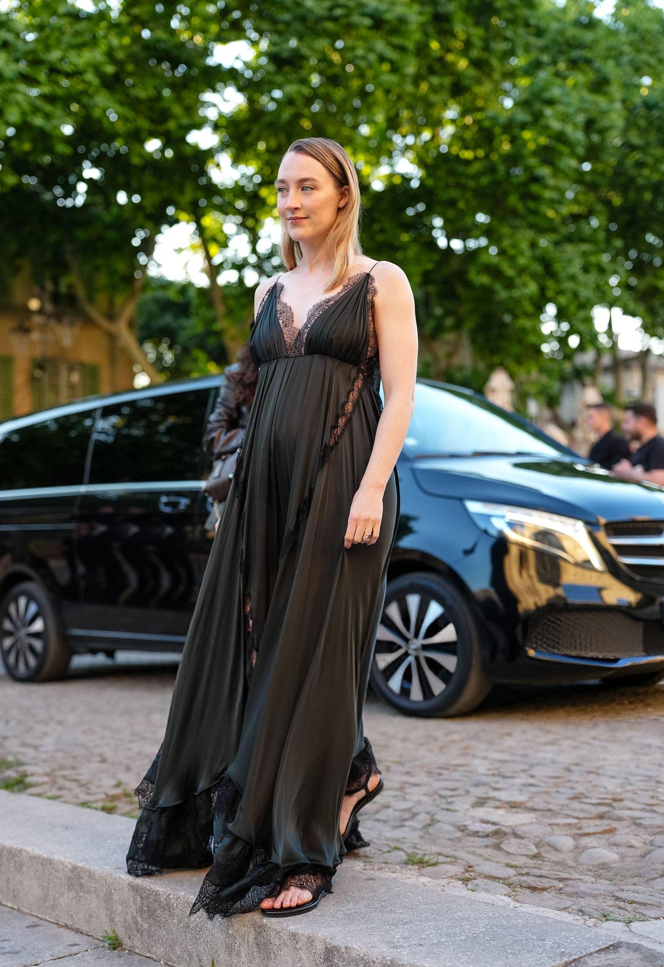 Pictures and images of Saoirse Ronan at the Louis Vuitton Cruise event in Avignon. Saoirse appears in satin at Palais Des Papes. She wears a long pleated satin and lace trim gown.