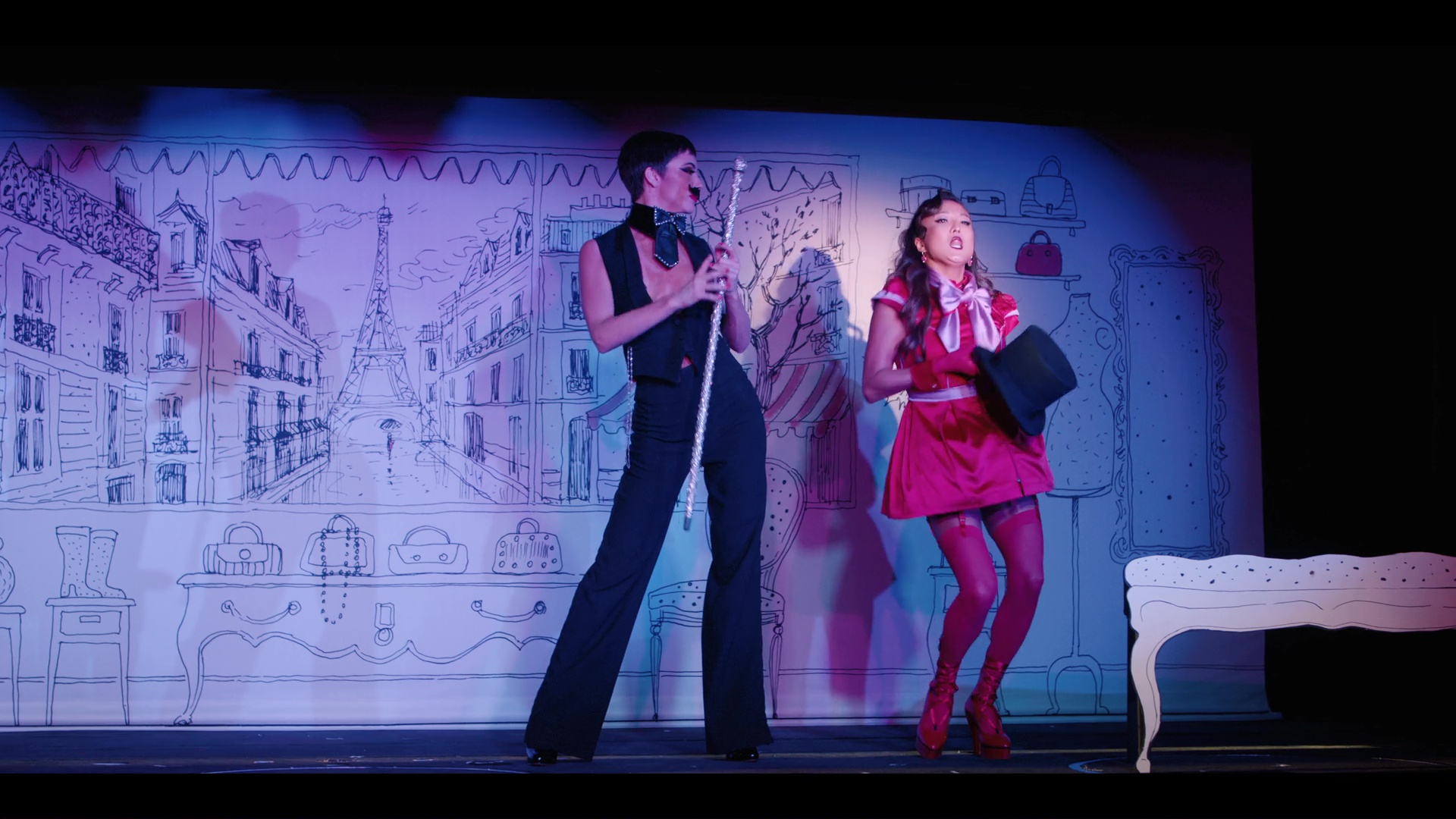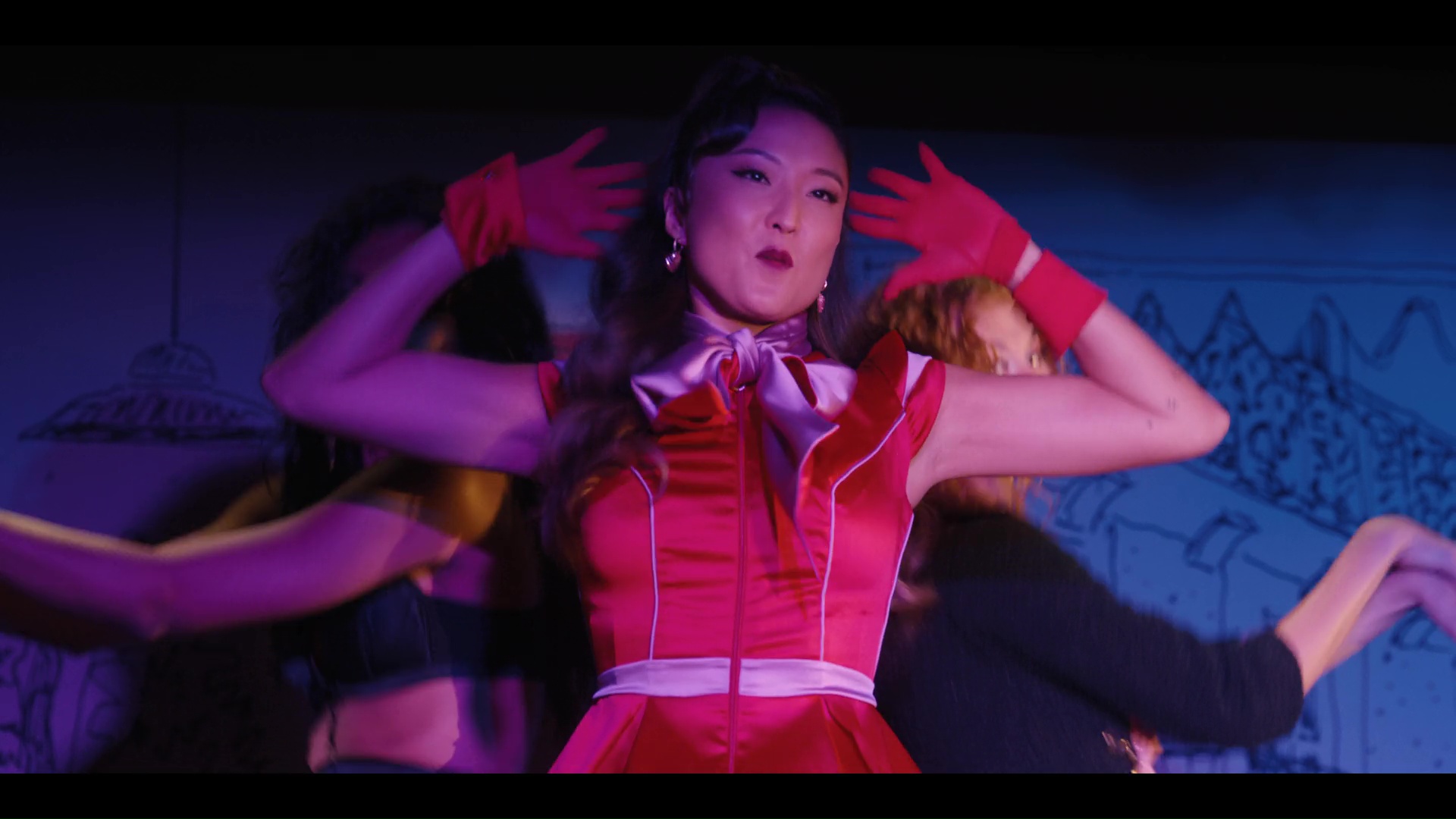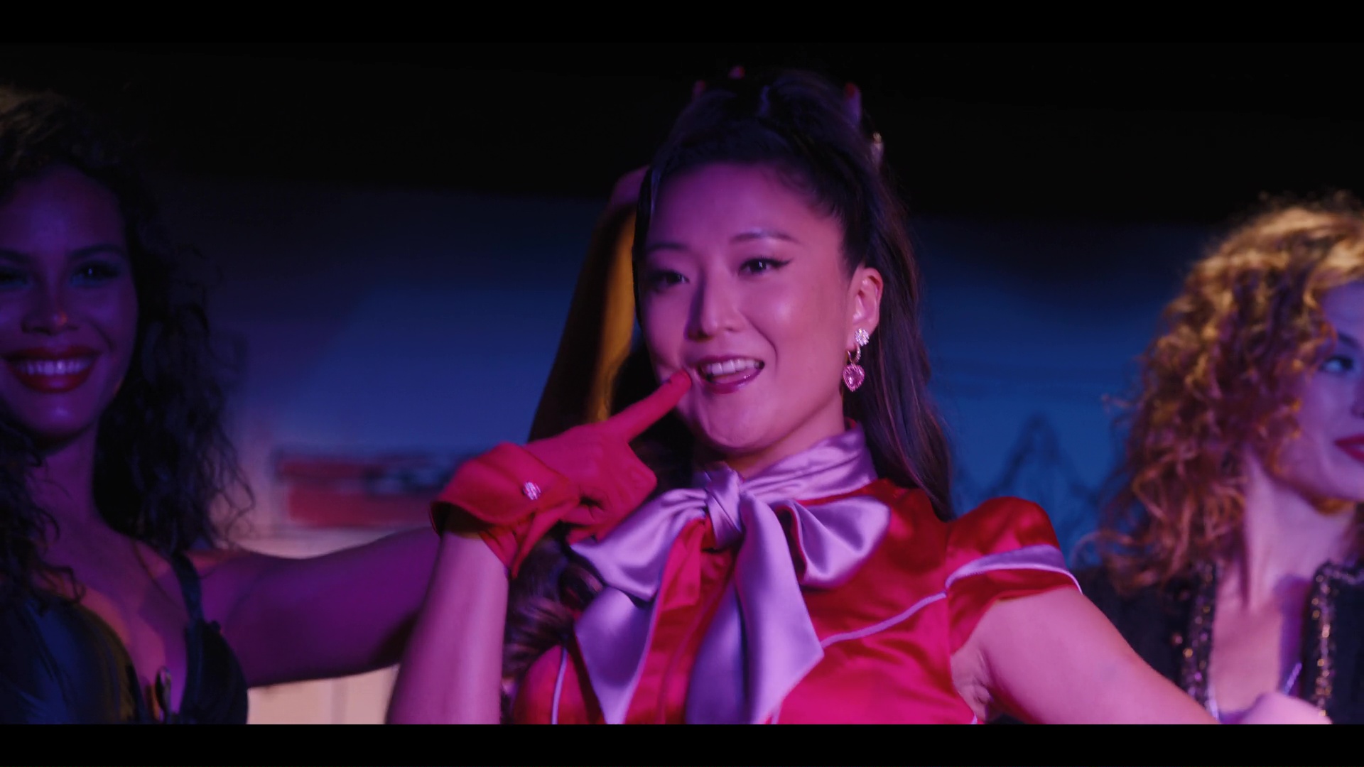 Emily In Paris screencaps from the fifth season of the Netflix television show. Ashley Park is seen in a short satin dress and a silk scarf. She appears as the character Mindy Chen in the romantic comedy series.