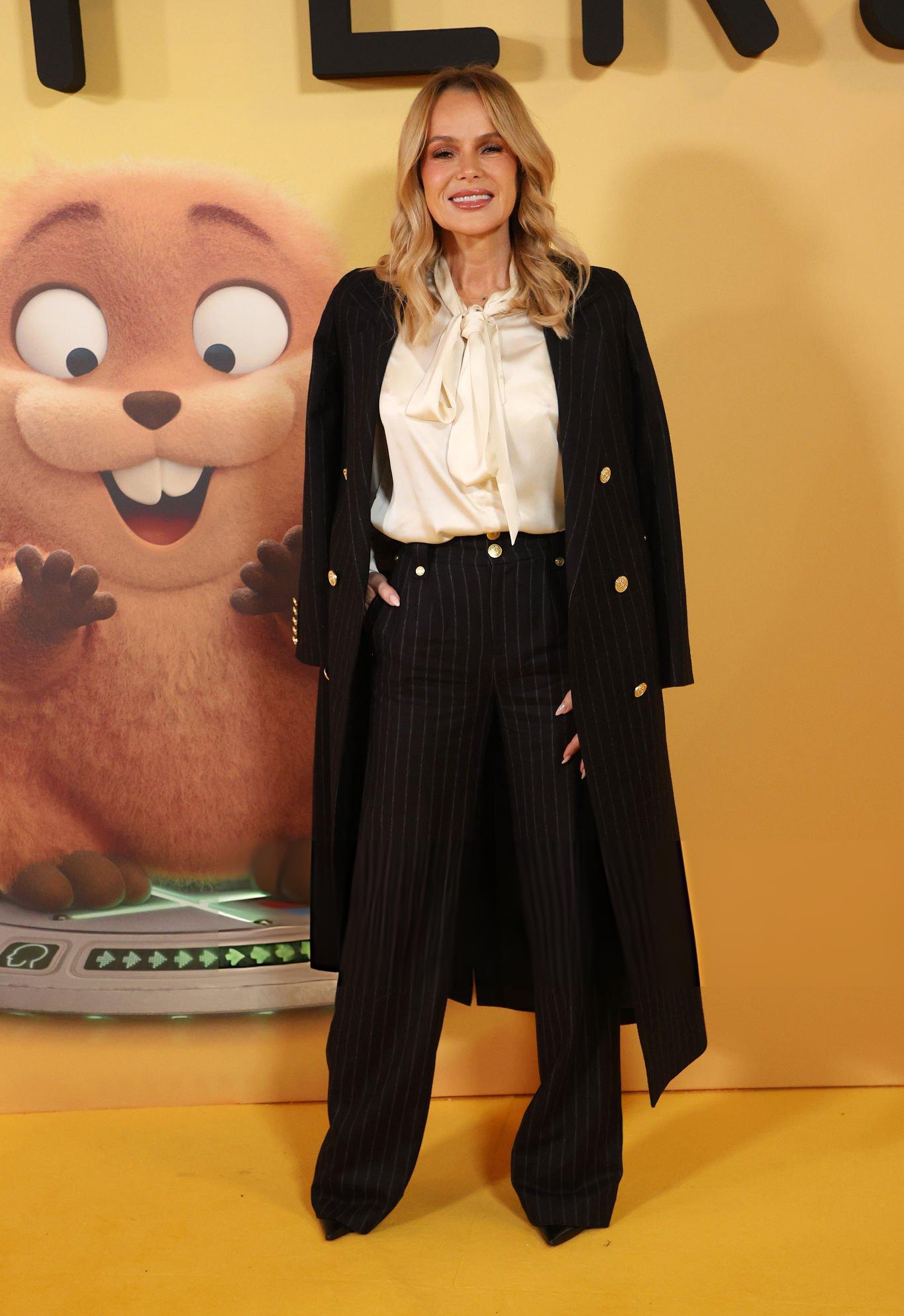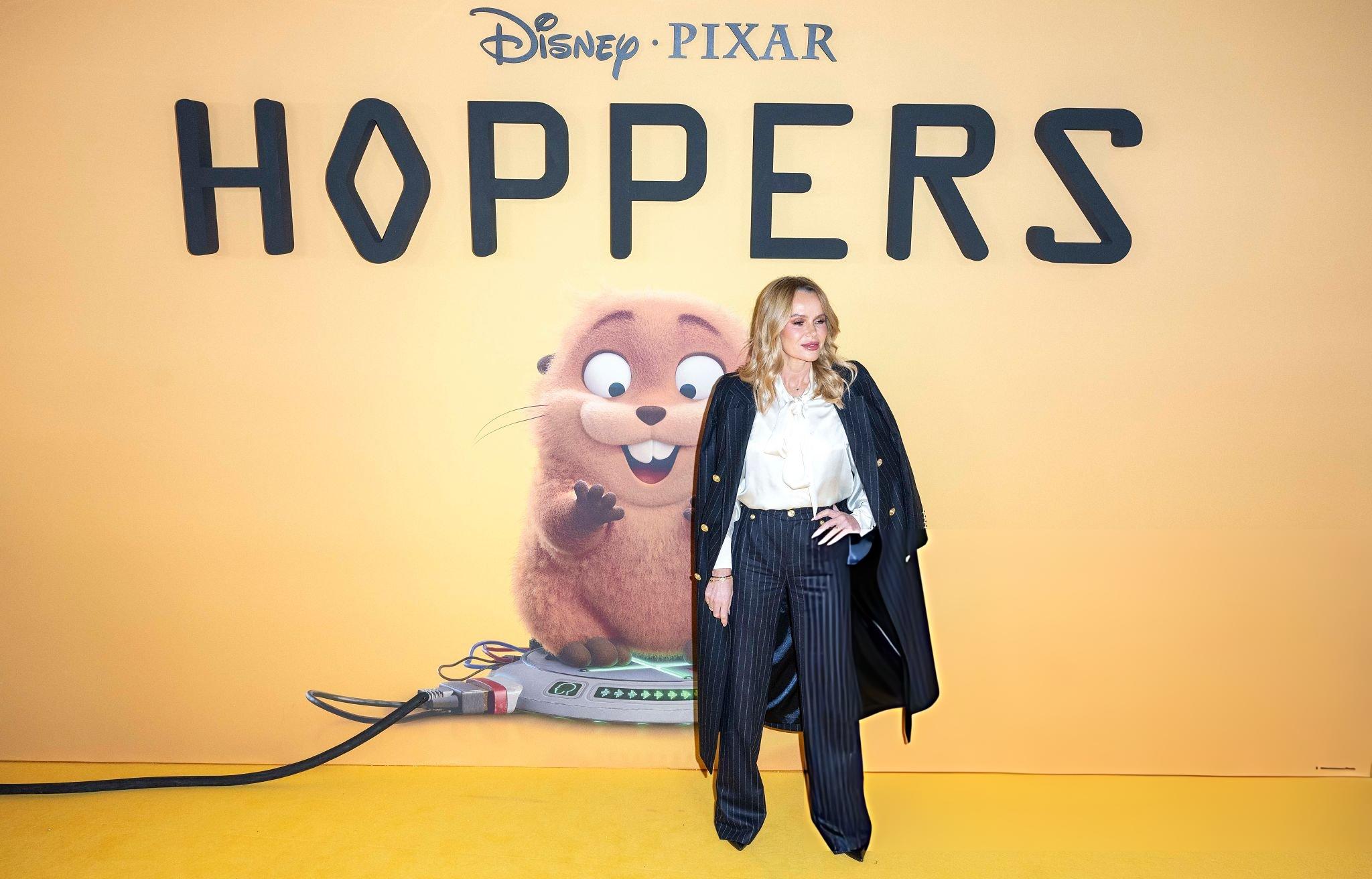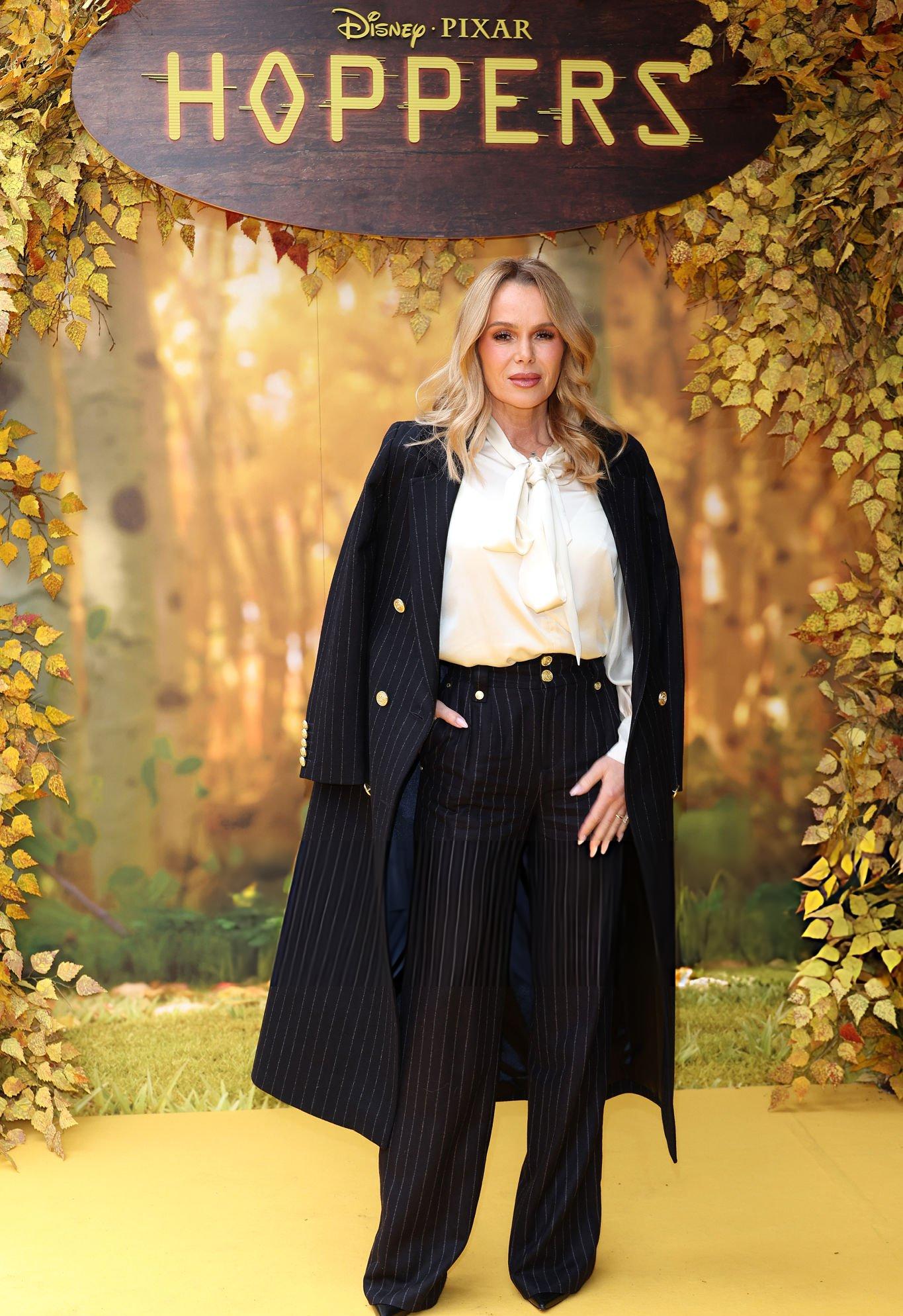 Amanda Holden photos and images taken at the premiere of Hoppers. Amanda wears a white satin and silk bow blouse. She is seen in satin at Vue West End on the 1st March 2026.