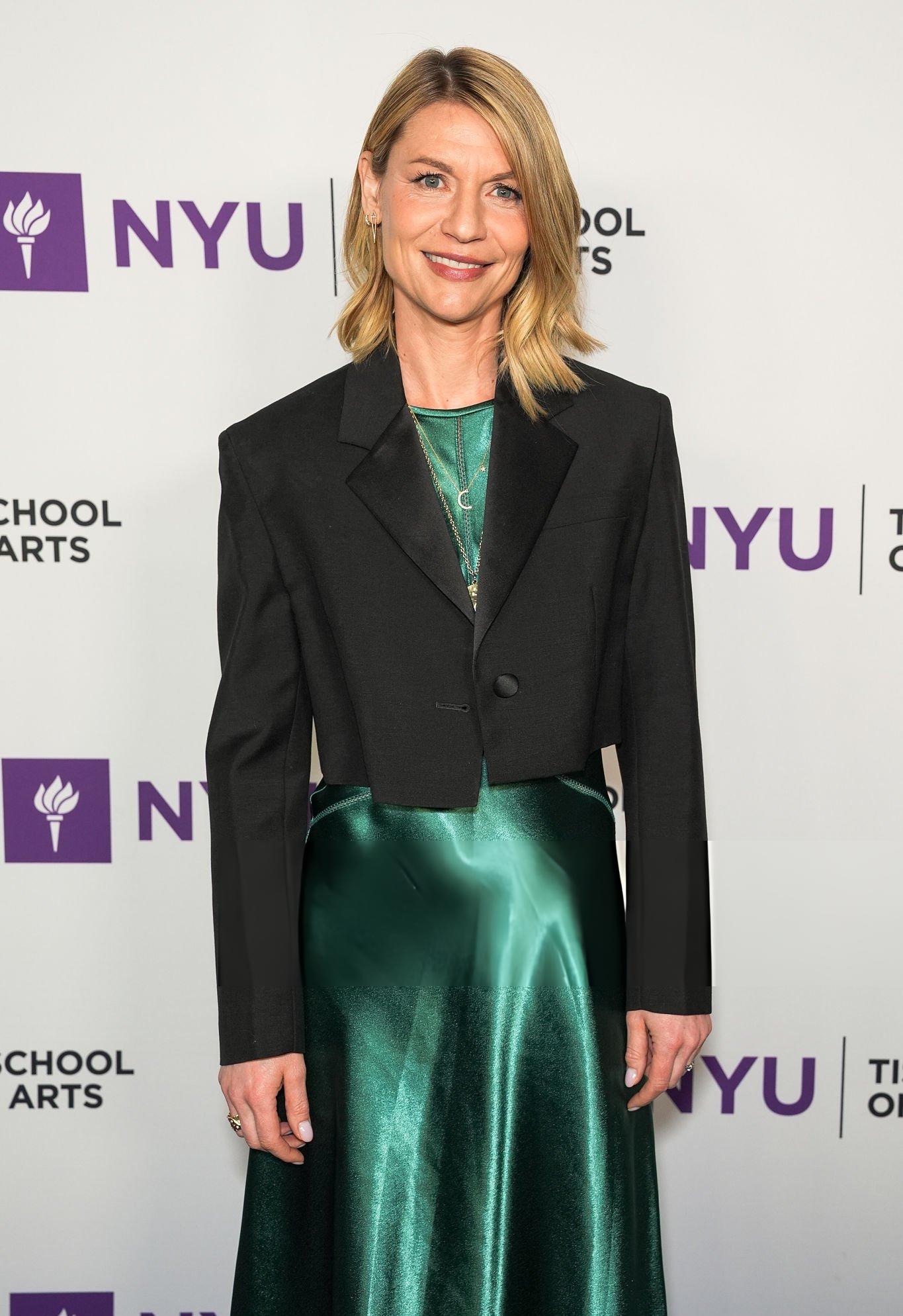 Claire Danes images and pictures taken at the Tisch Gala for 2025. Claire is seen in a green satin dress and a cropped black blazer. She wears satin at Cipriani South Street on the 7th April 2025.