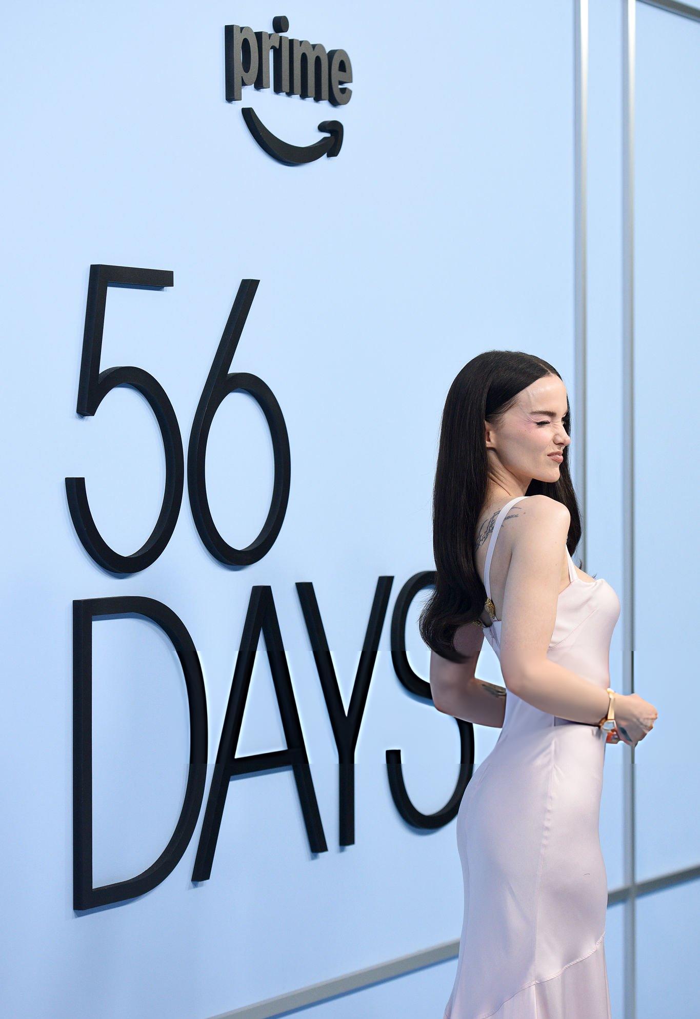 Photos and images of Dove Cameron at the premiere of 56 Days. Dove wears a light pink satin dress. She appears in silk and satin at Hammer Museum in Los Angeles on the 11th February 2026.
