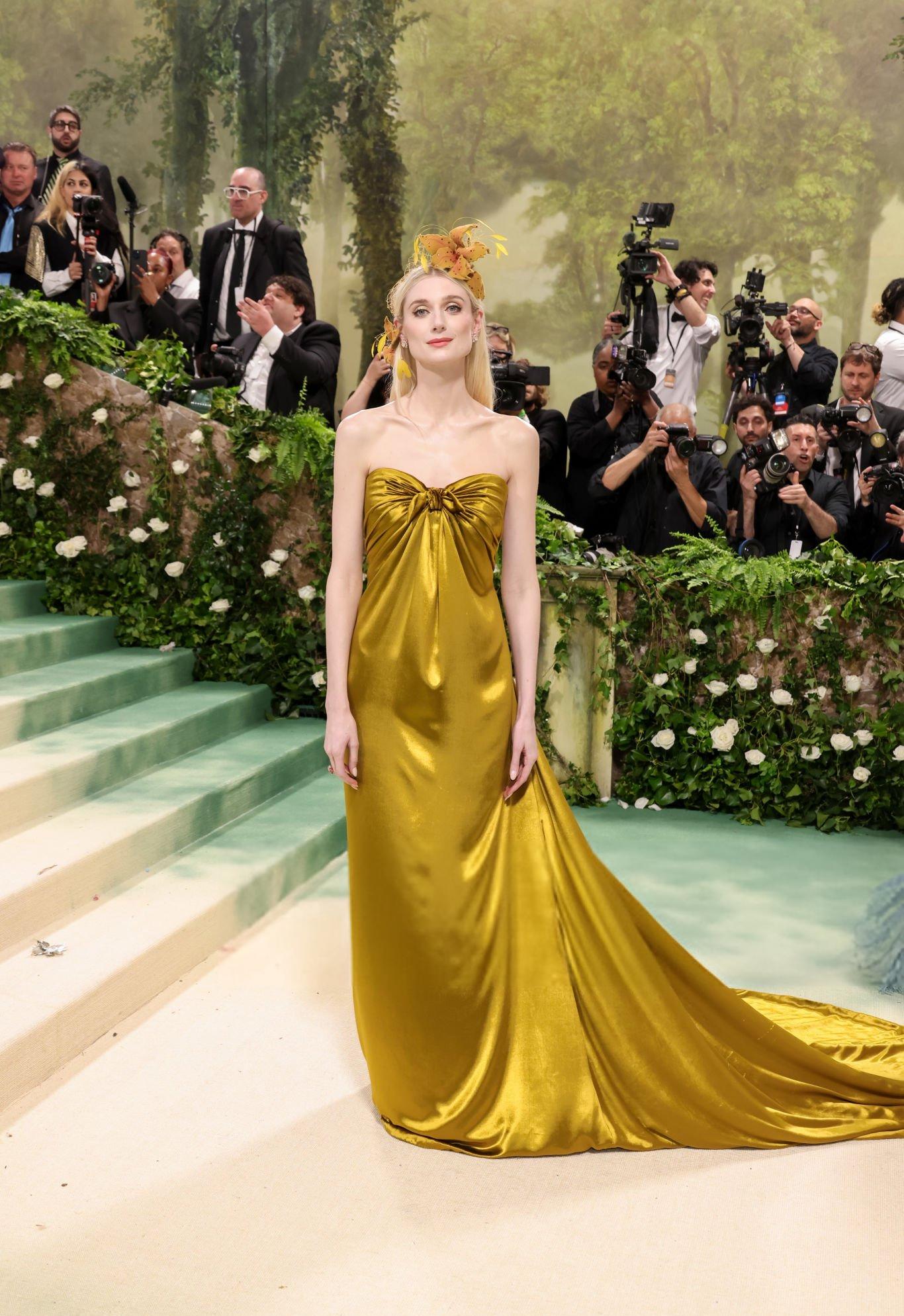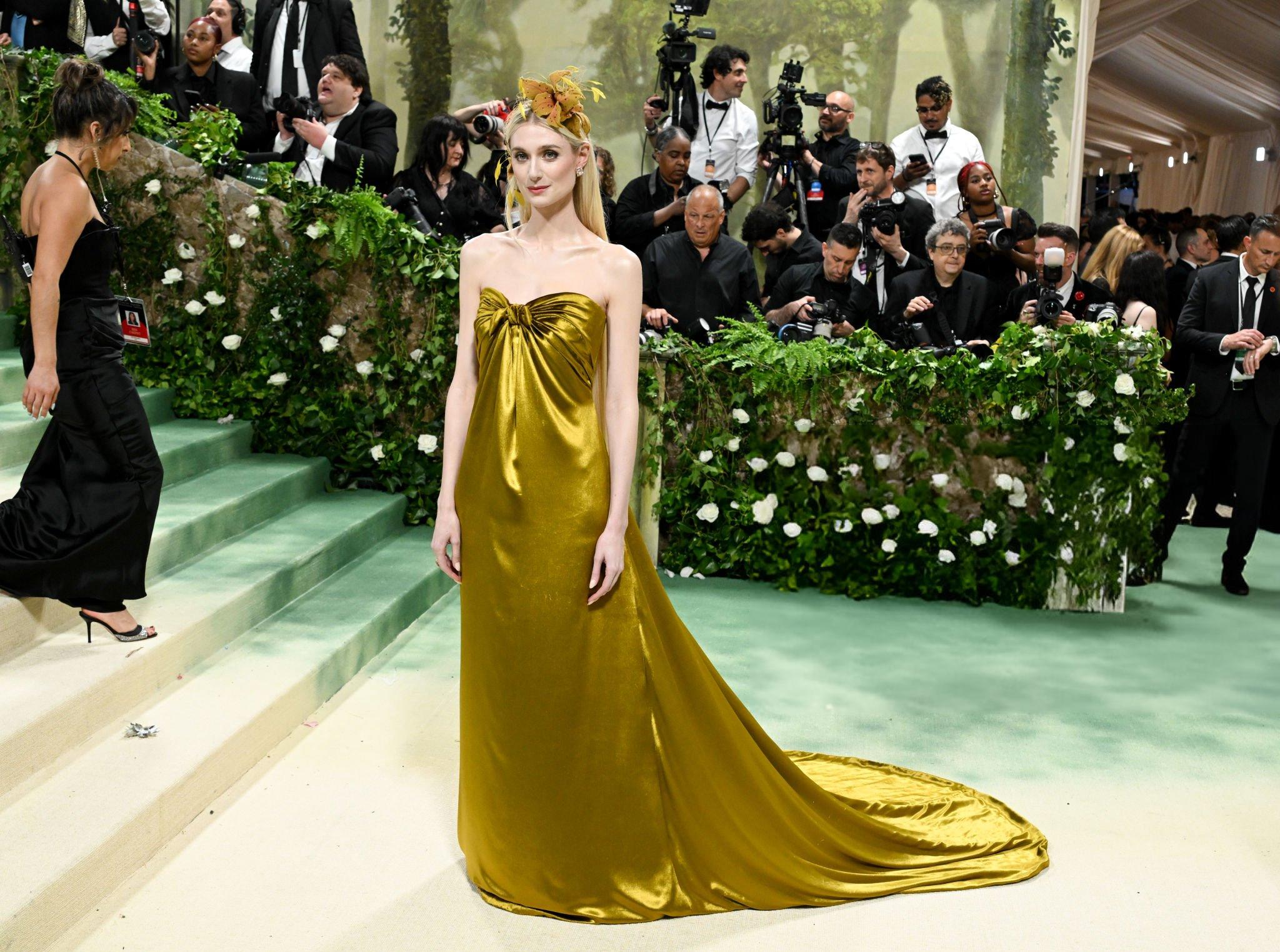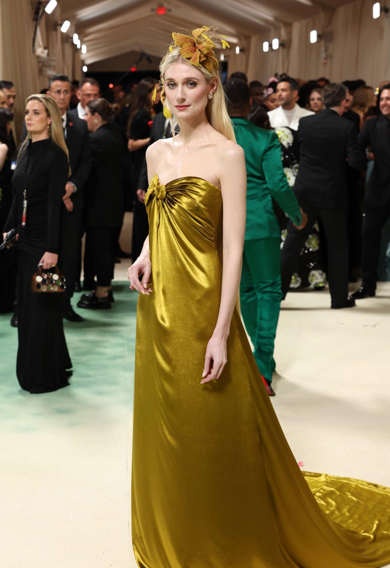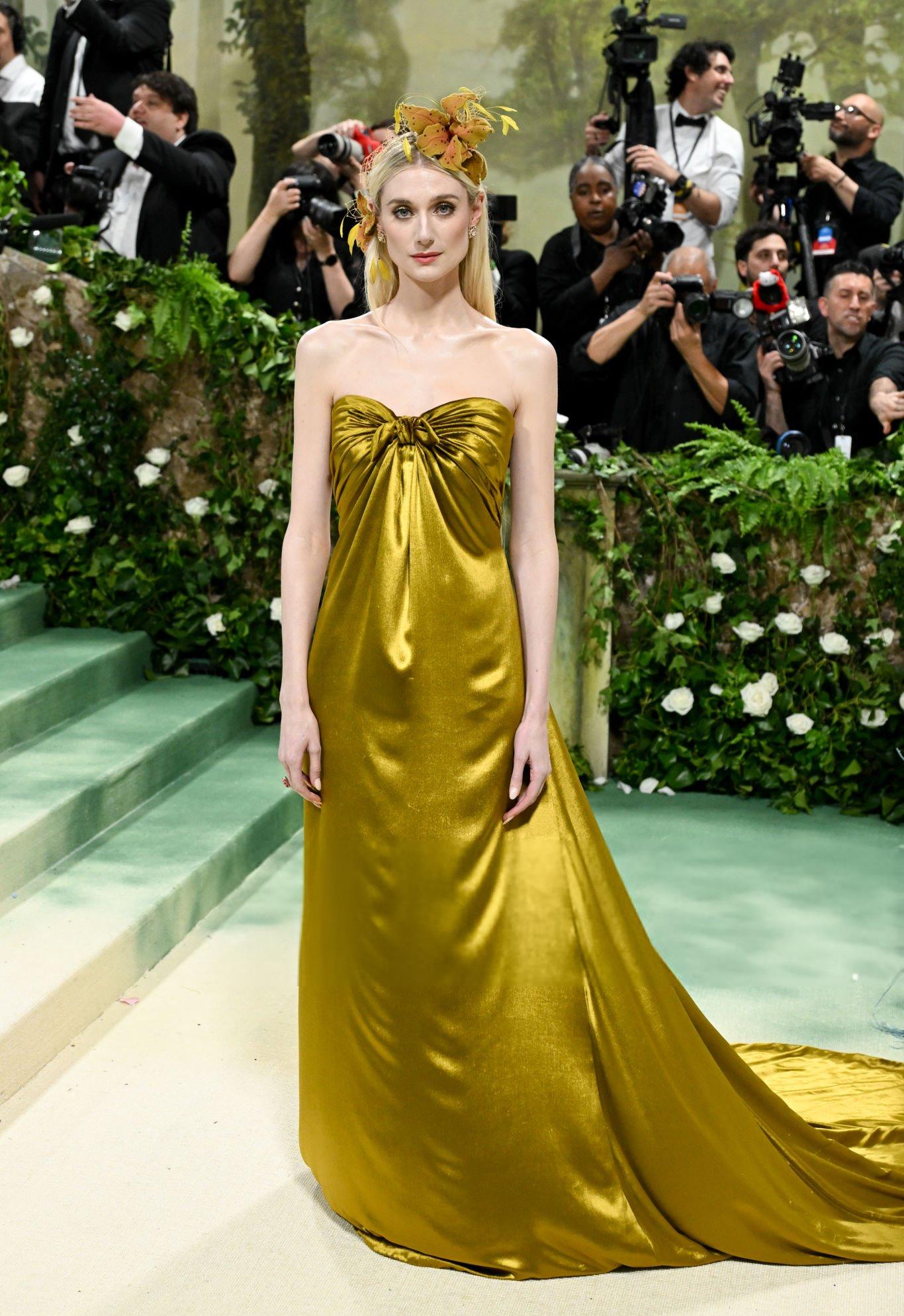 Elizabeth Debicki 2024 Met Gala images and pictures. Elizabeth is seen in a dark gold strapless satin gown. She stars in satin at The Metropolitan Museum Of Art on the 6th May 2024.