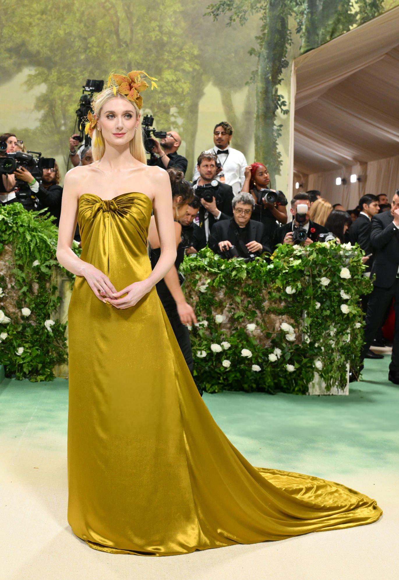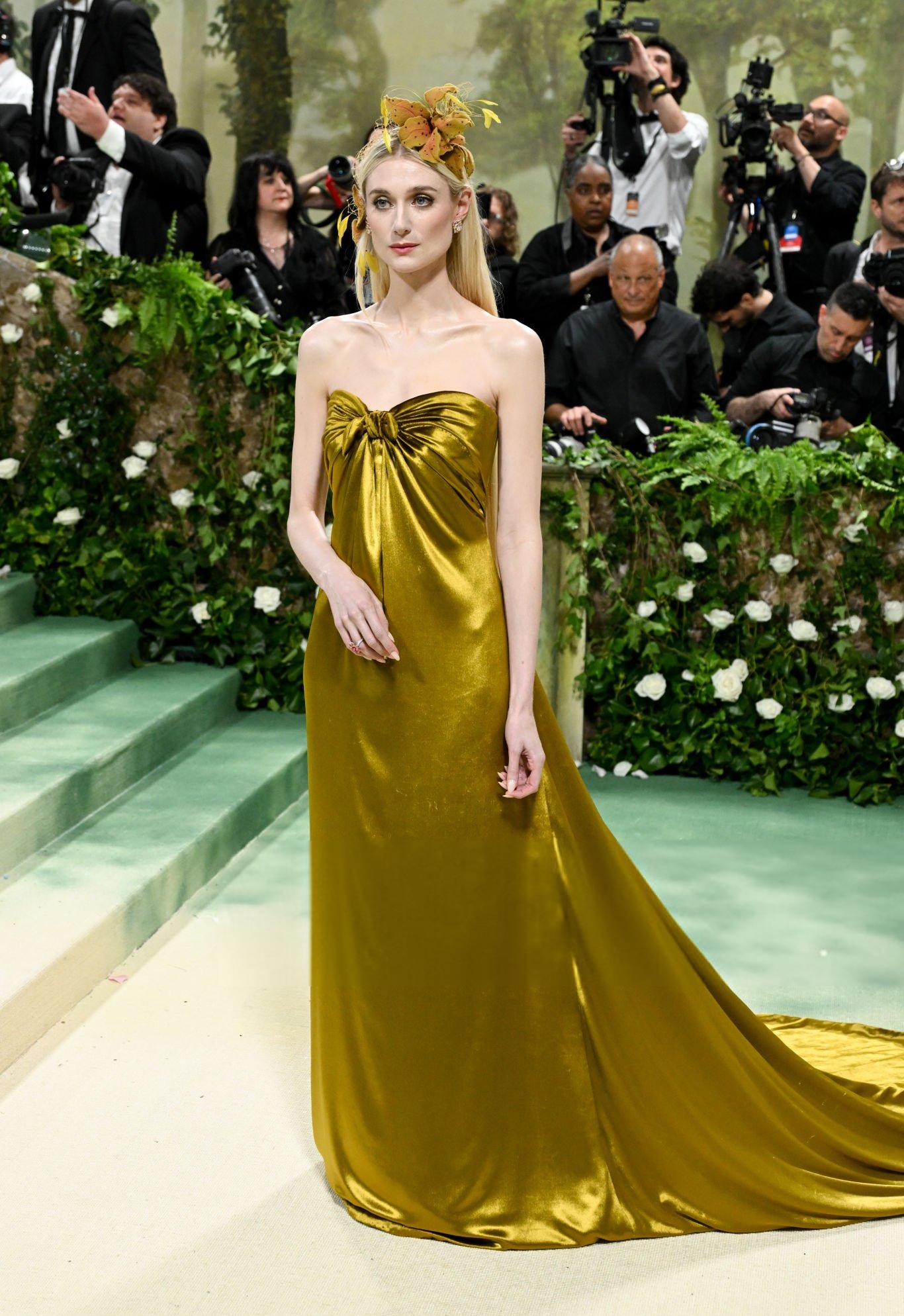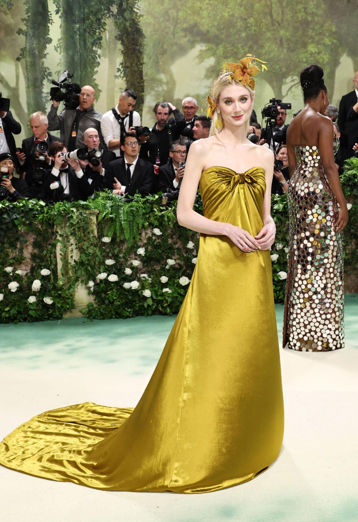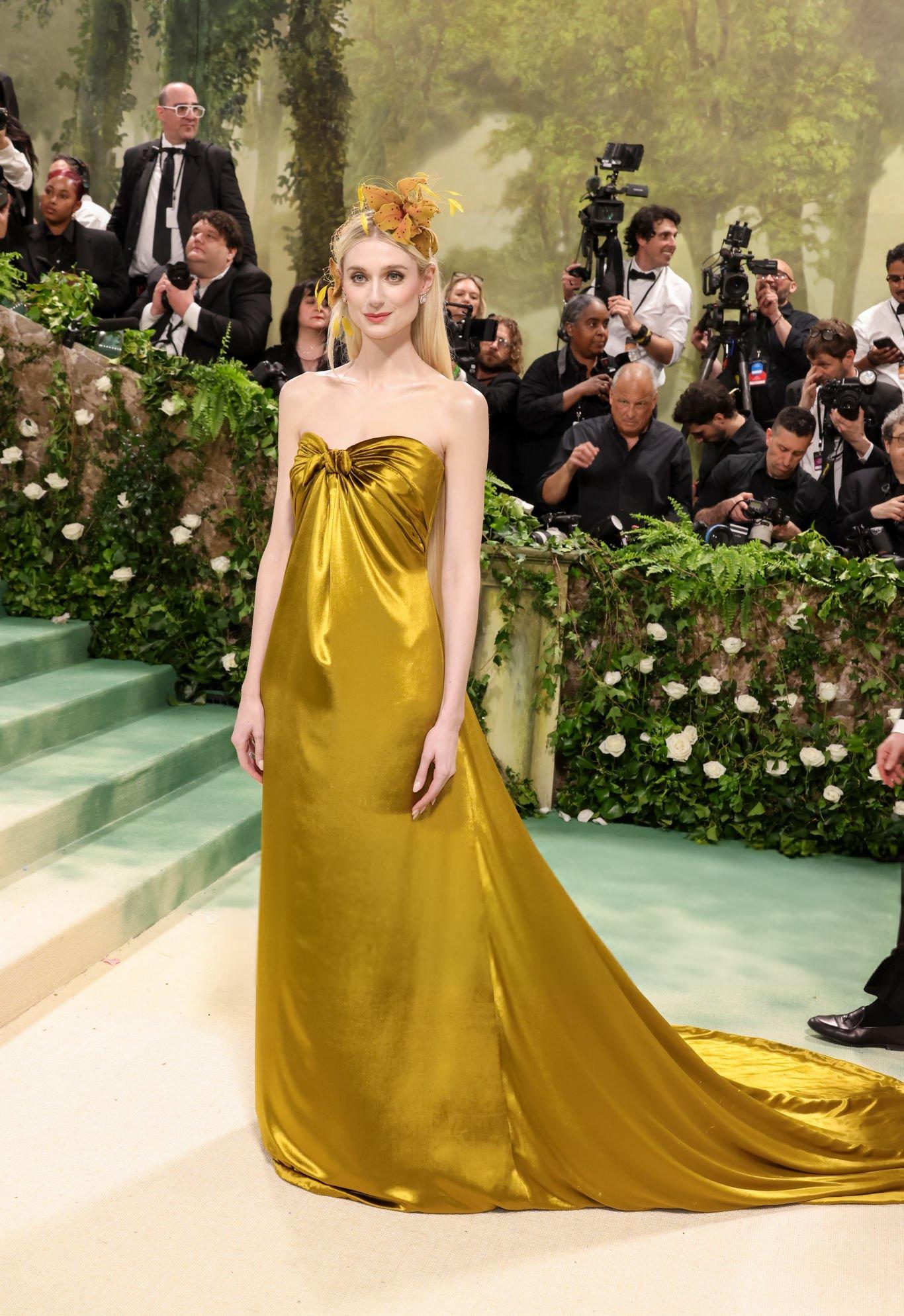 Elizabeth Debicki 2024 Met Gala images and pictures. Elizabeth is seen in a dark gold strapless satin gown. She stars in satin at The Metropolitan Museum Of Art on the 6th May 2024.