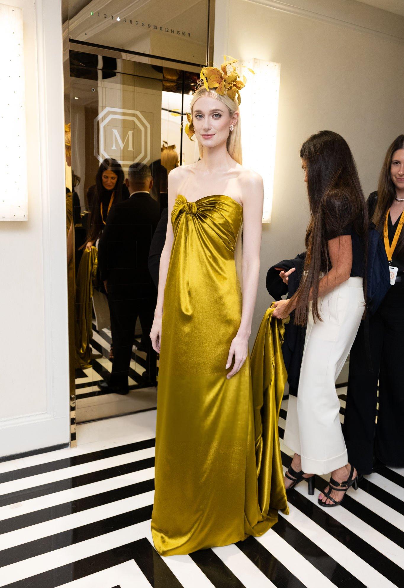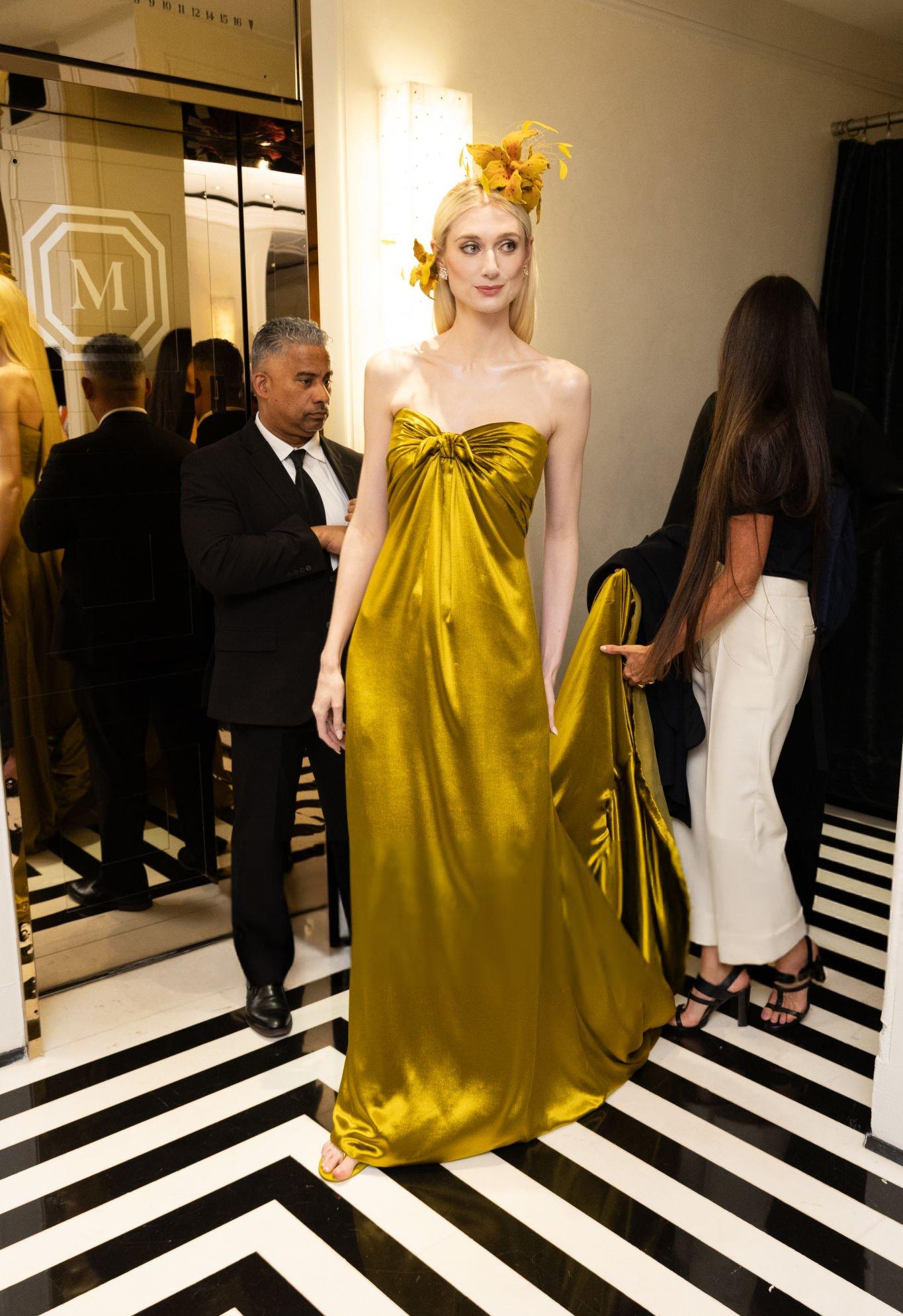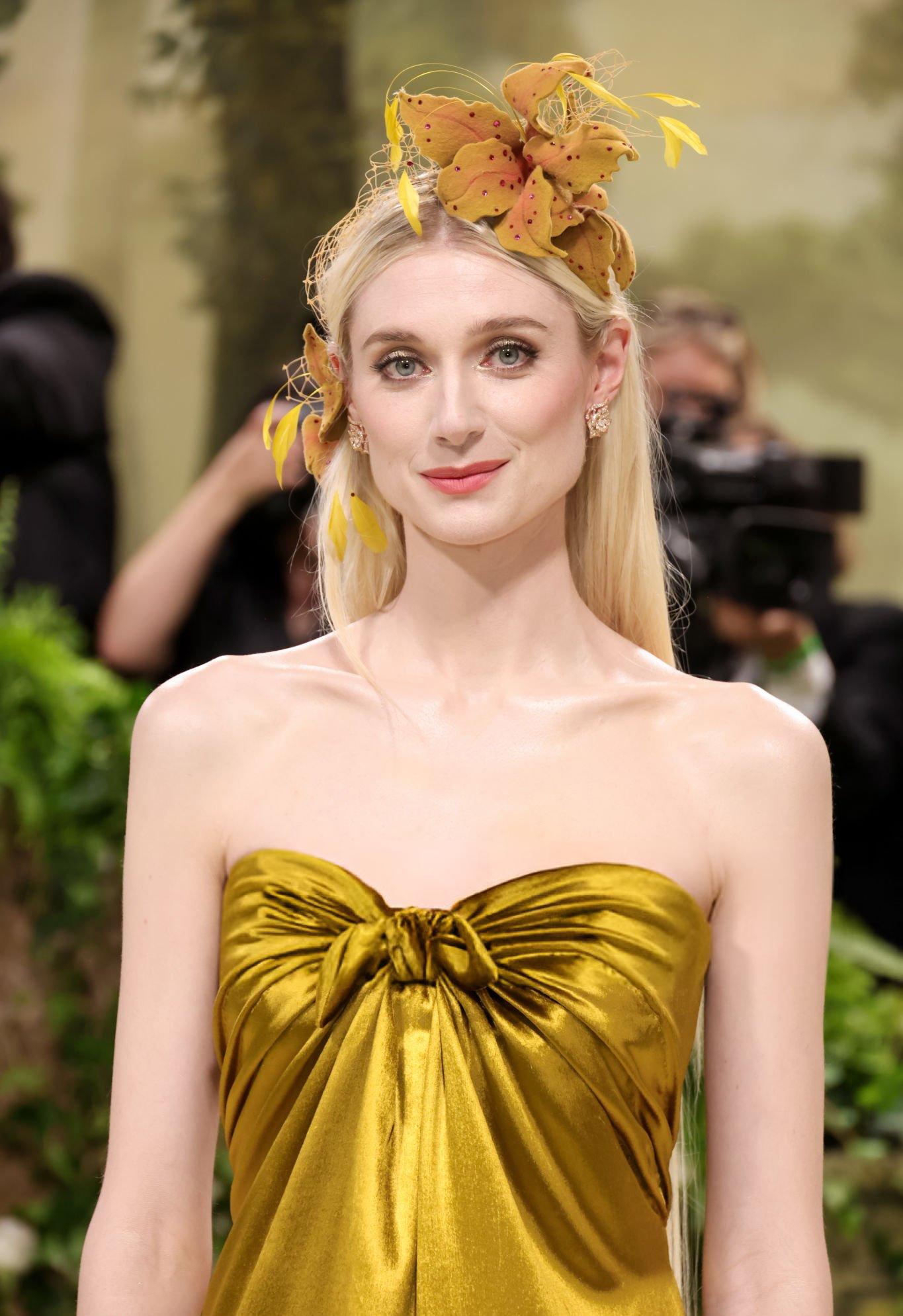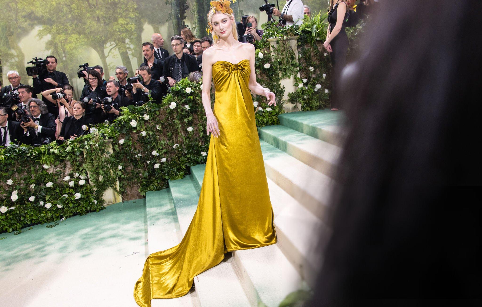 Elizabeth Debicki 2024 Met Gala images and pictures. Elizabeth is seen in a dark gold strapless satin gown. She stars in satin at The Metropolitan Museum Of Art on the 6th May 2024.