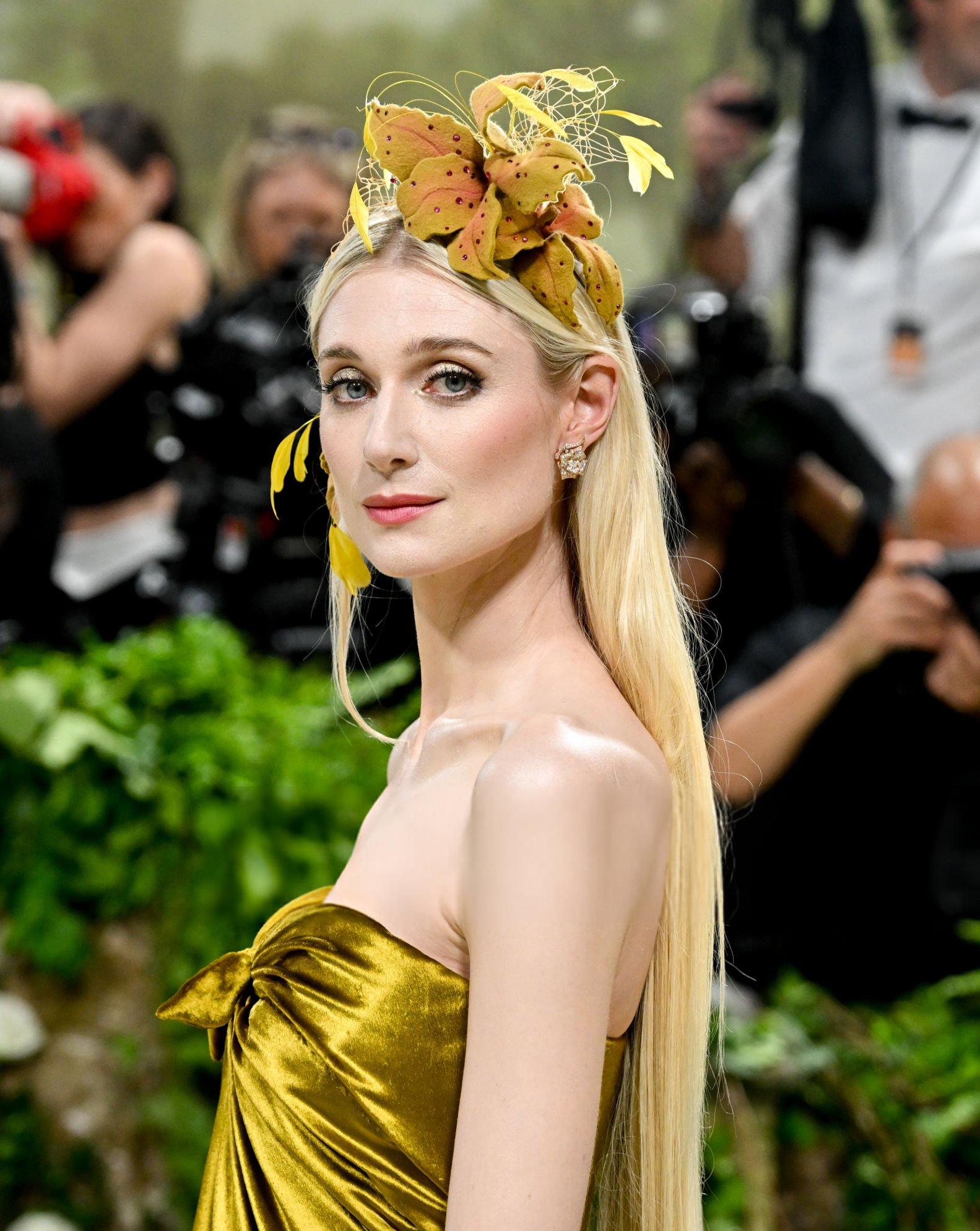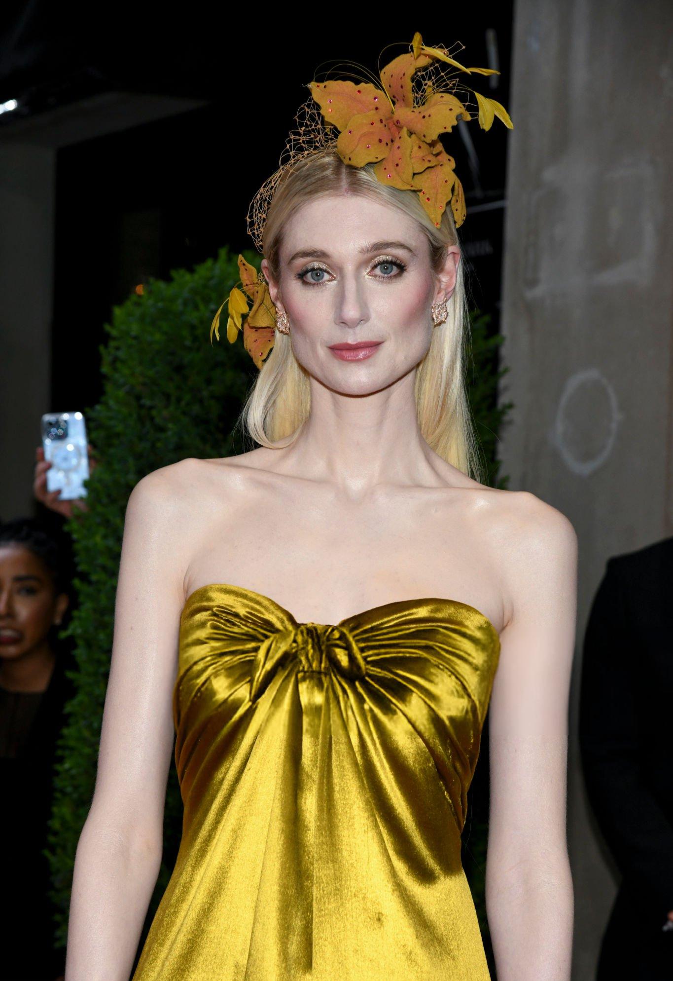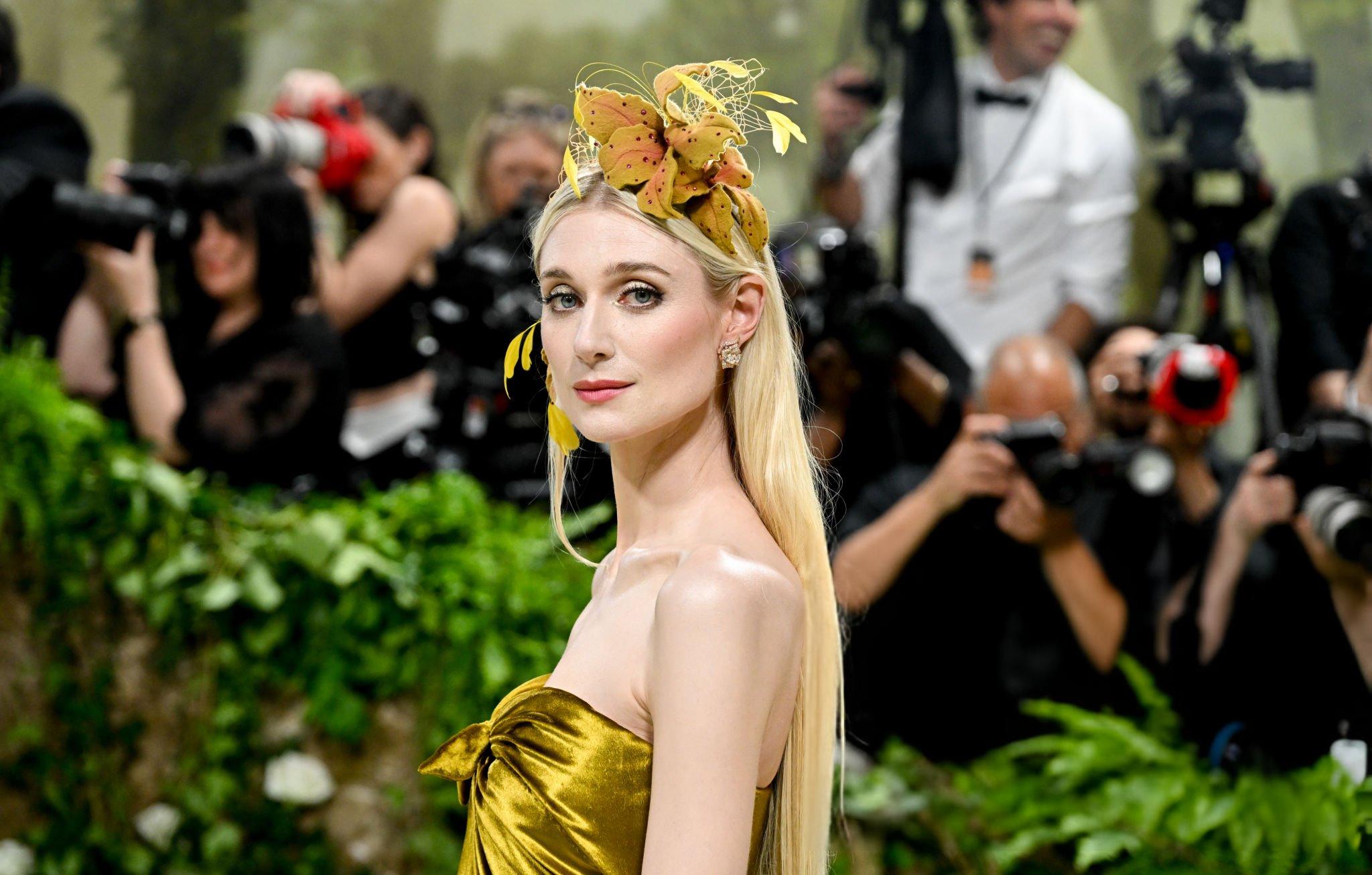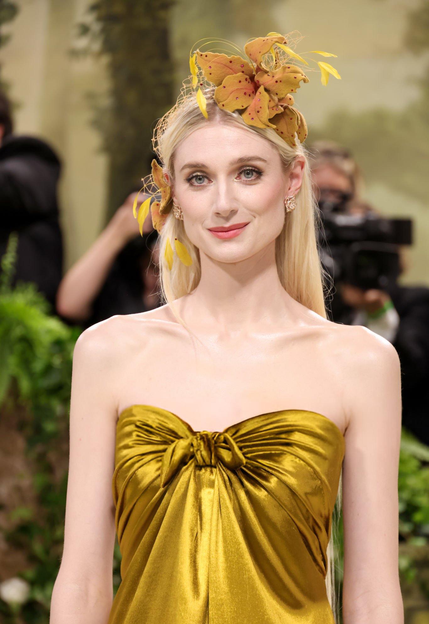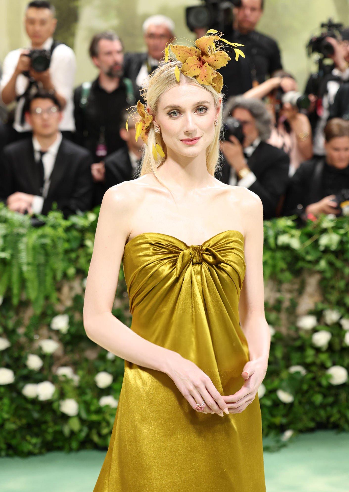 Elizabeth Debicki 2024 Met Gala images and pictures. Elizabeth is seen in a dark gold strapless satin gown. She stars in satin at The Metropolitan Museum Of Art on the 6th May 2024.