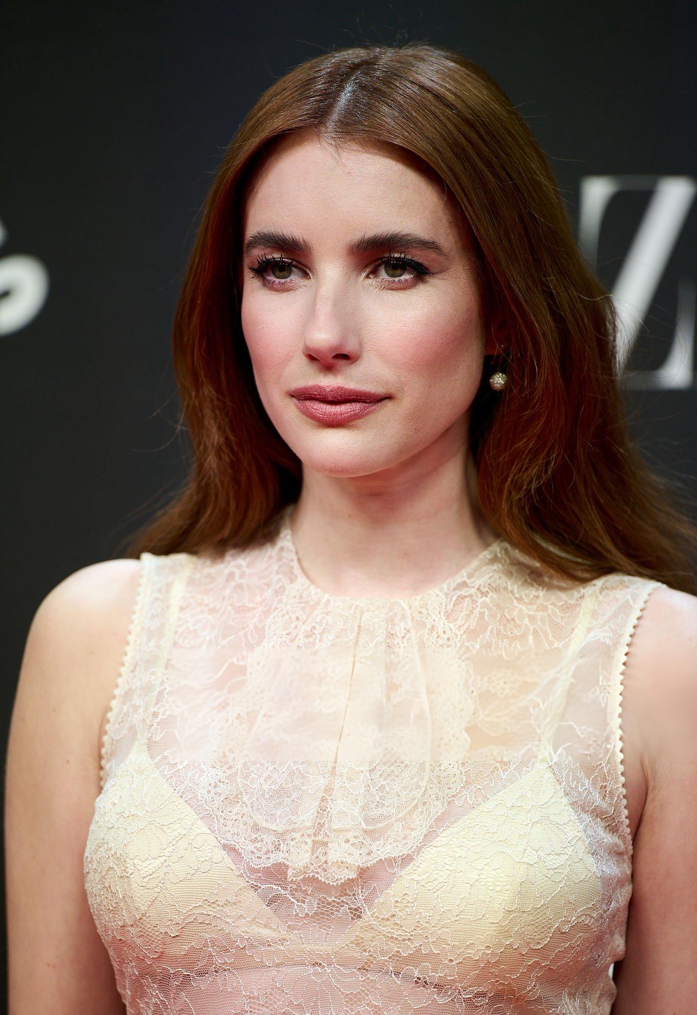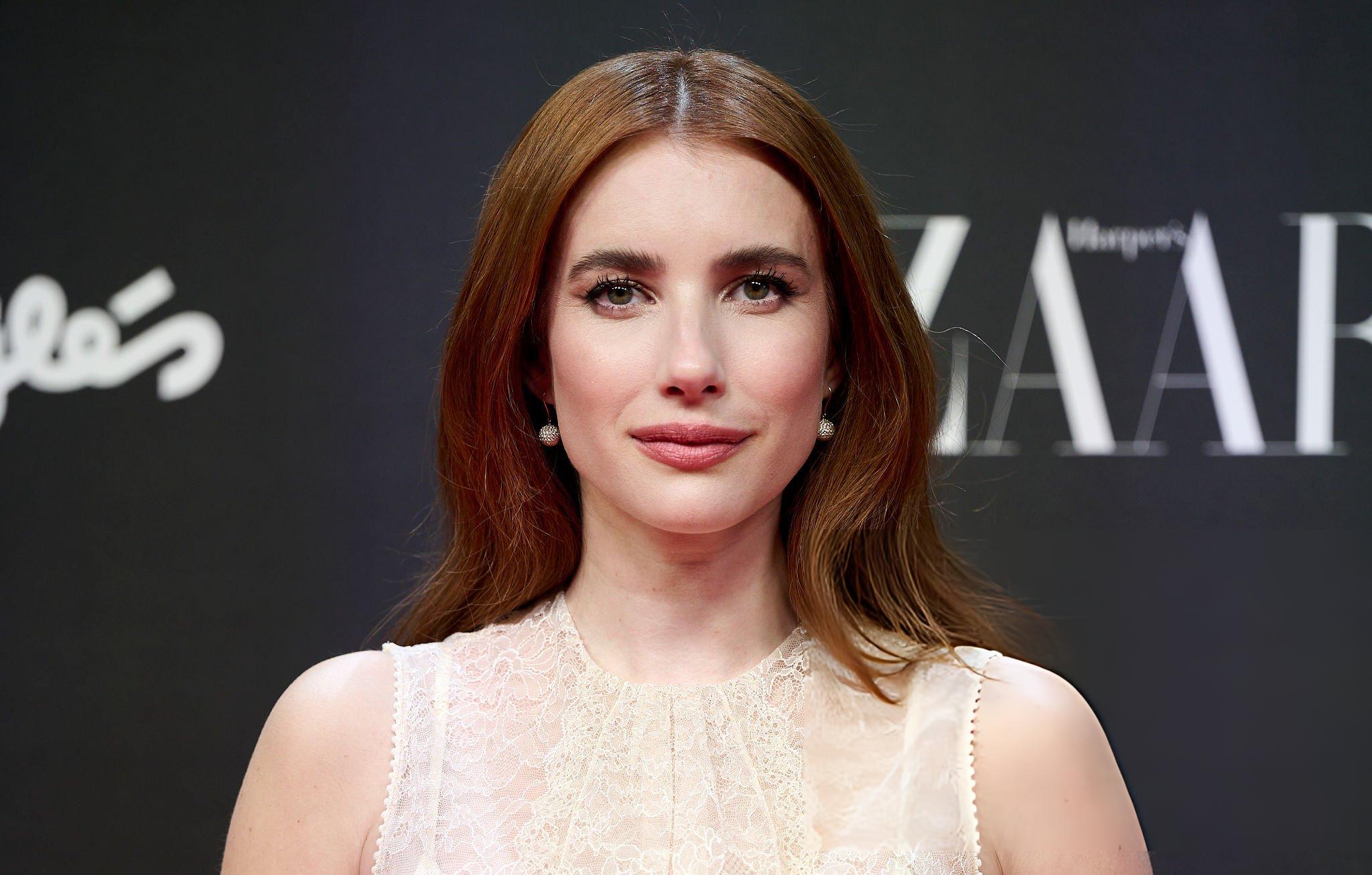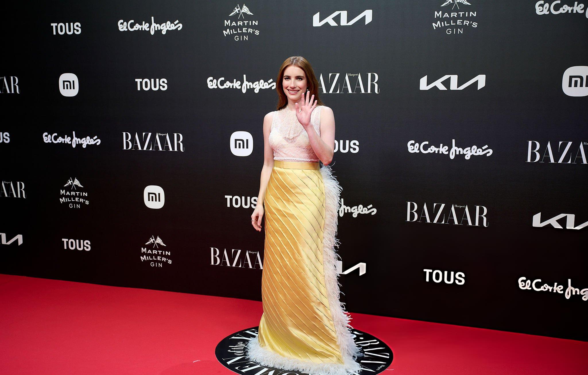 Images of Emma Roberts at the Harpers Bazaar Women Of The Year Photocall for 2025. Emma wears a satin bralette and a long satin skirt. She appears in satin in Madrid on the 28th October 2025.