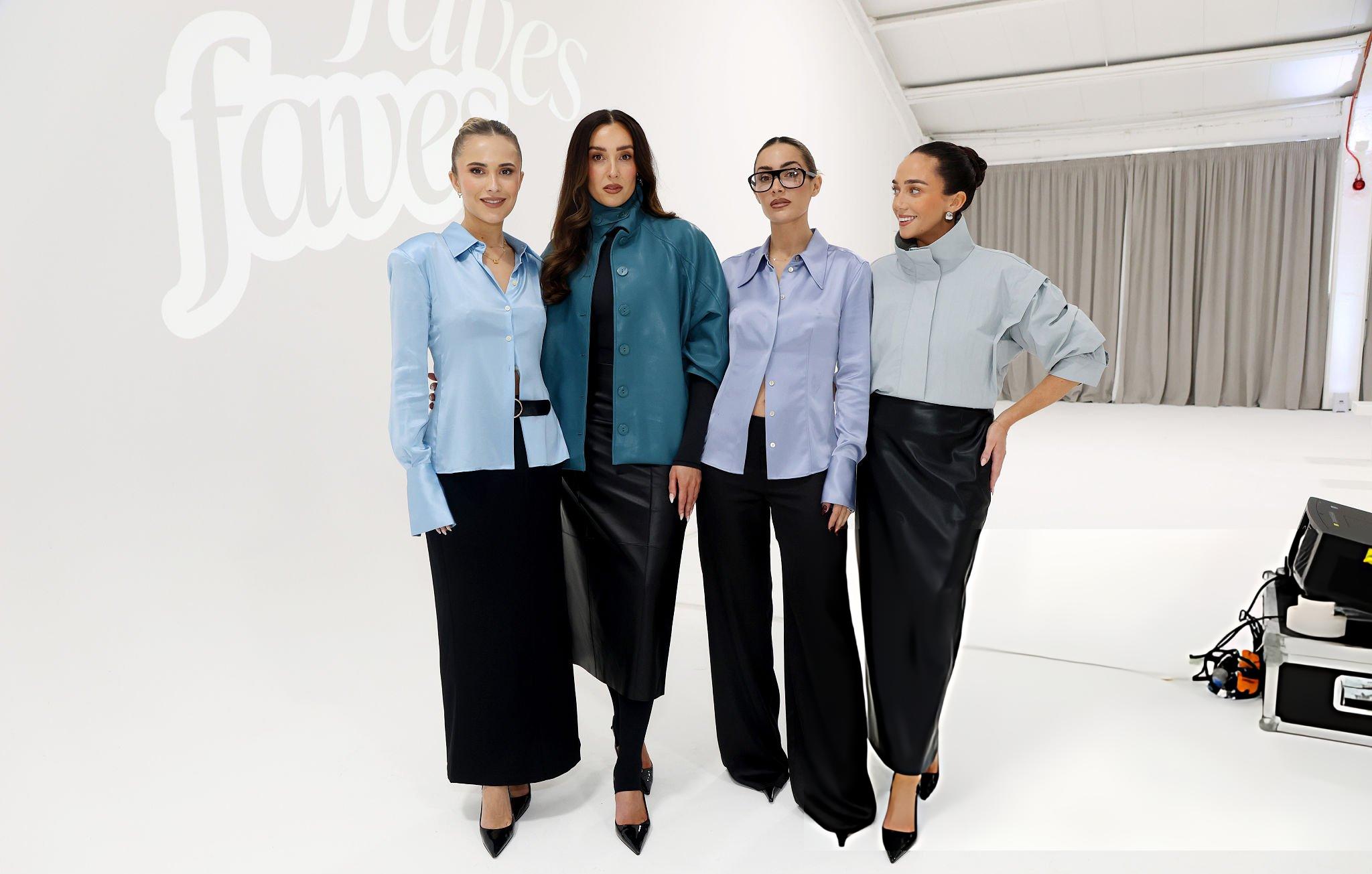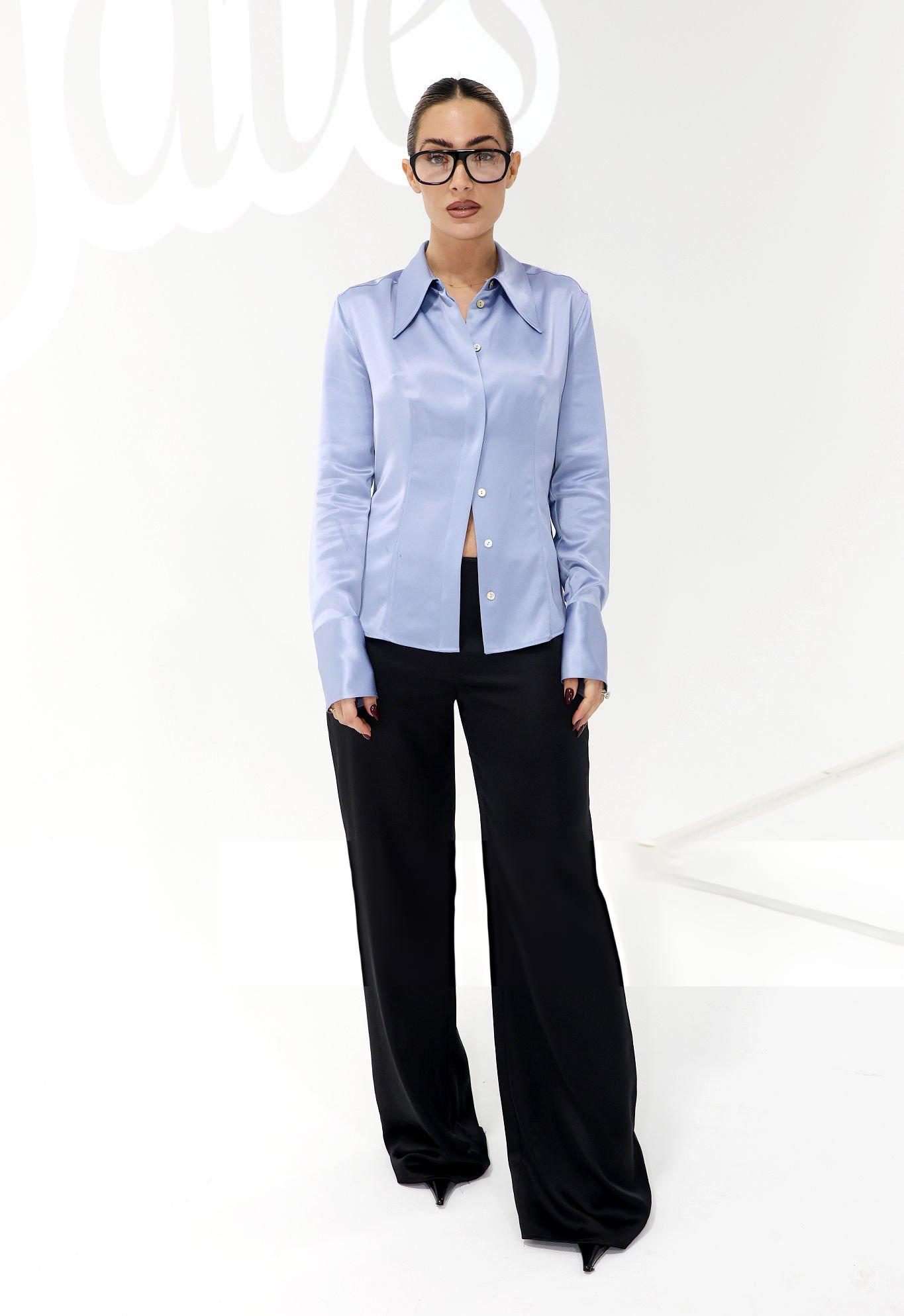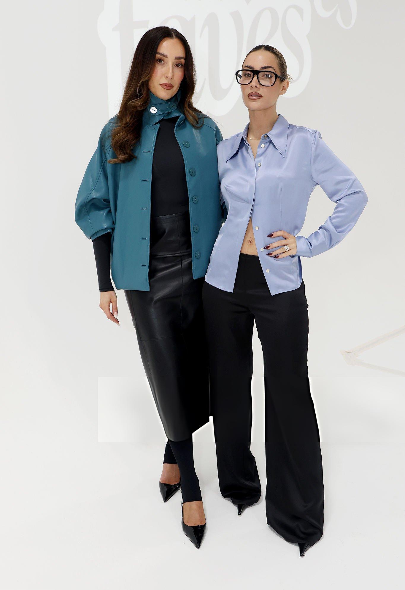 Images and pictures of Frankie Bridge at the Faves Live The Runway. Frankie is seen in a light blue long sleeve satin blouse. She stars in satin in London on the 21st February 2026.