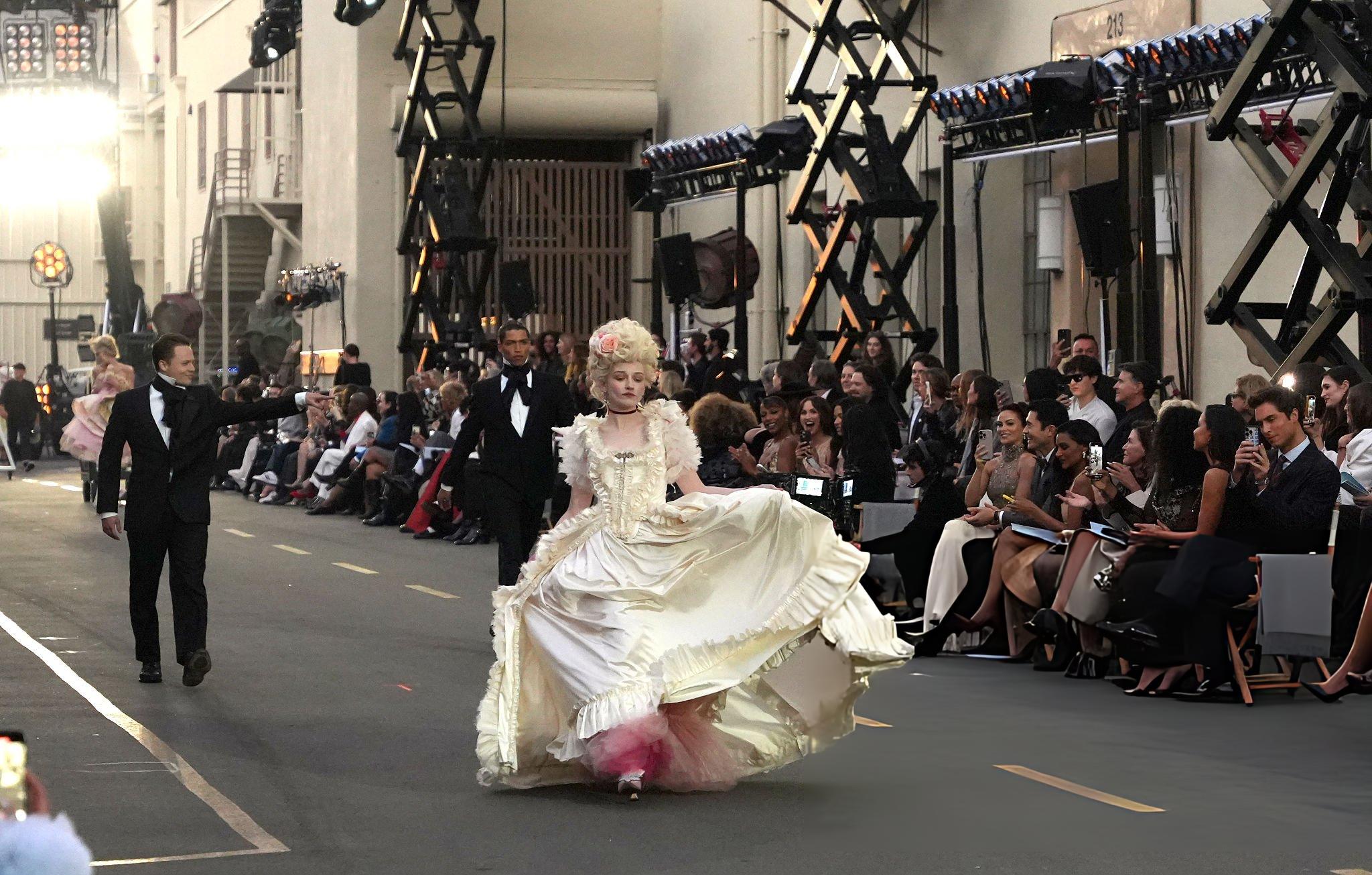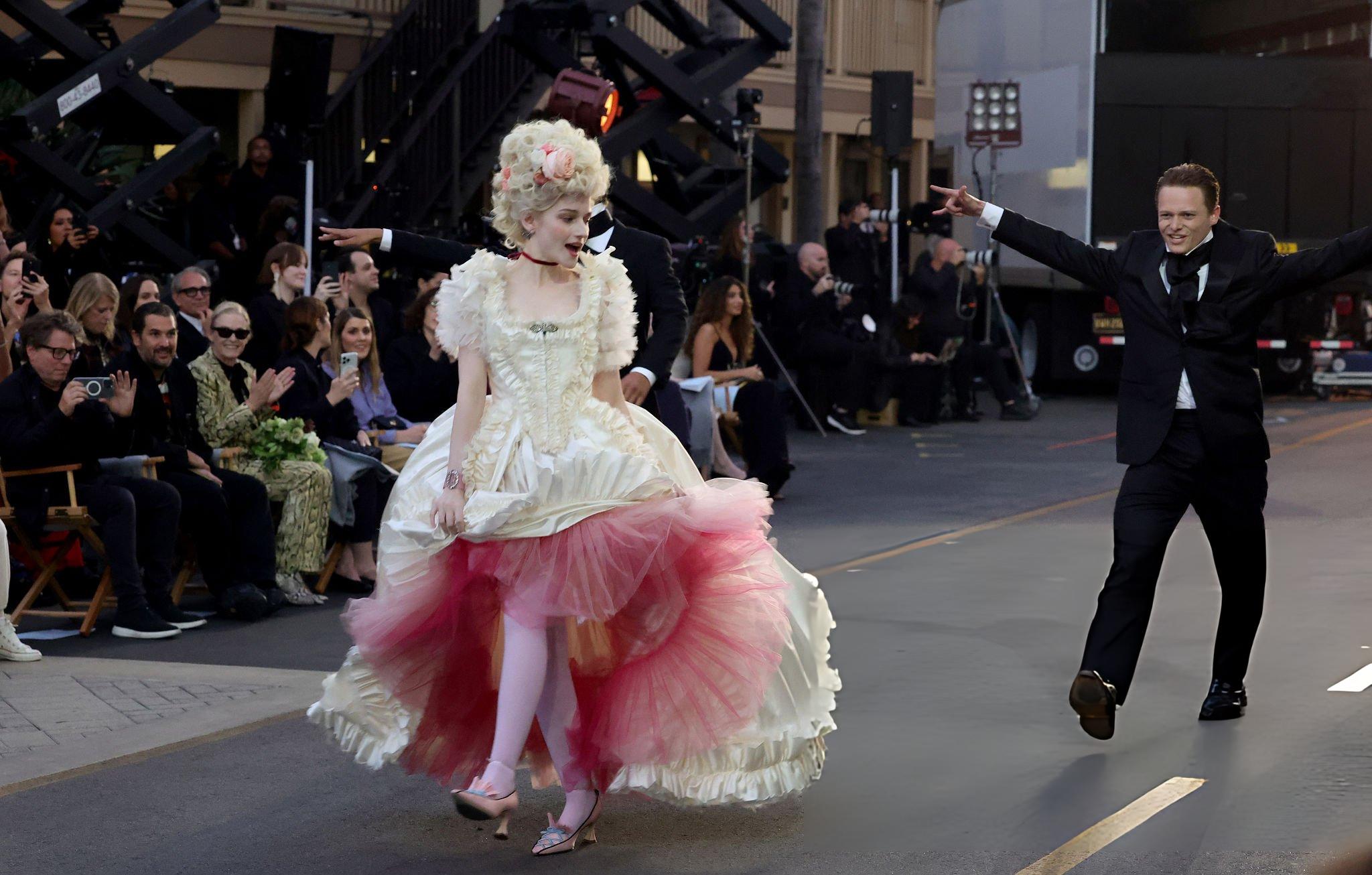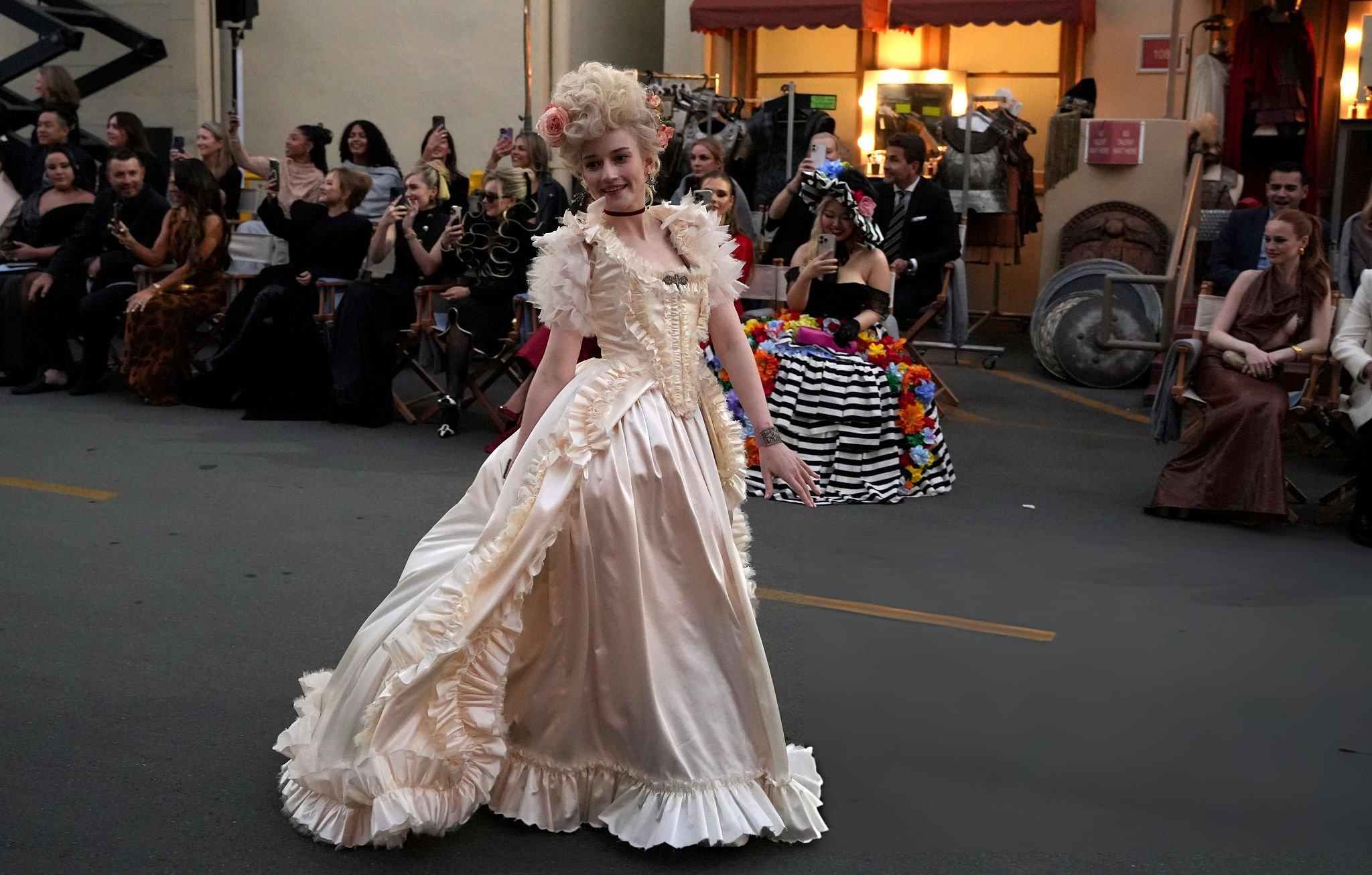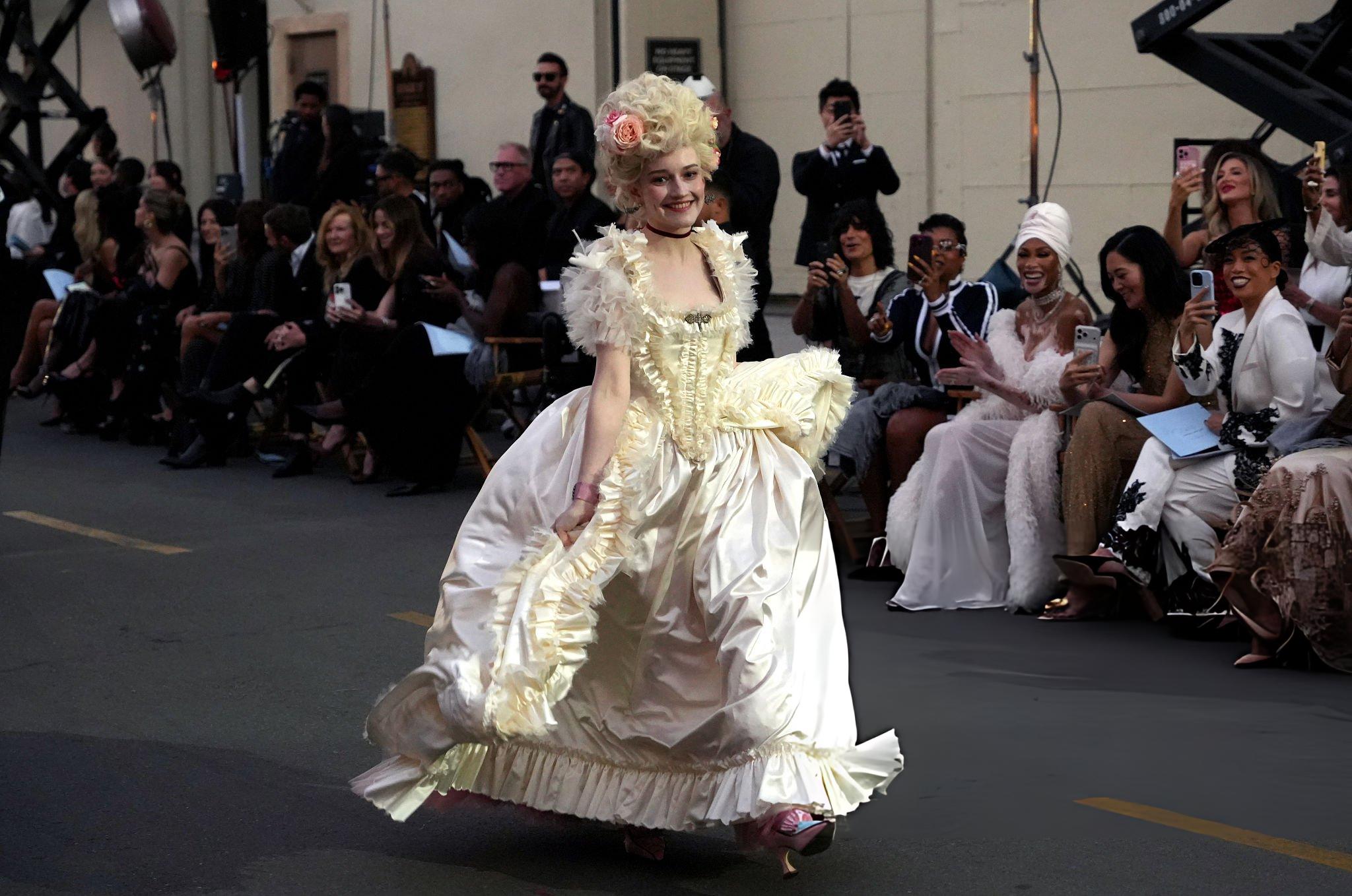 Julia Garner 2025 Vogue World: Hollywood pictures and images. Julia models in silk and satin on the runway at the fashion event. She is seen in a white satin costume at Paramount Studios on the 26th October 2025.