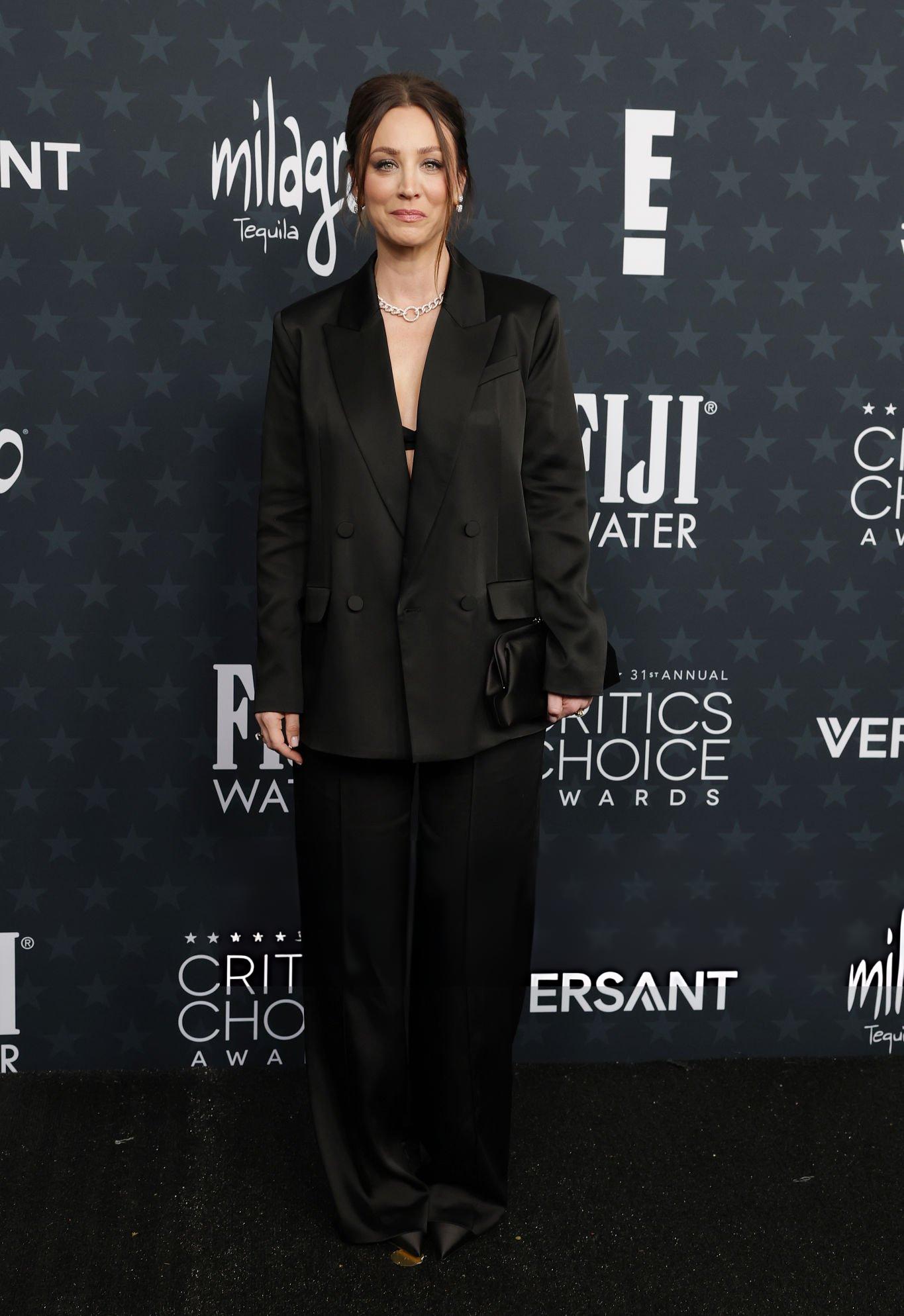 Images and pictures showing Kaley Cuoco 31st Critics Choice Awards. Kaley appears in a black oversized satin suit. She stars in satin and silk at Barker Hangar on the 4th January 2026.