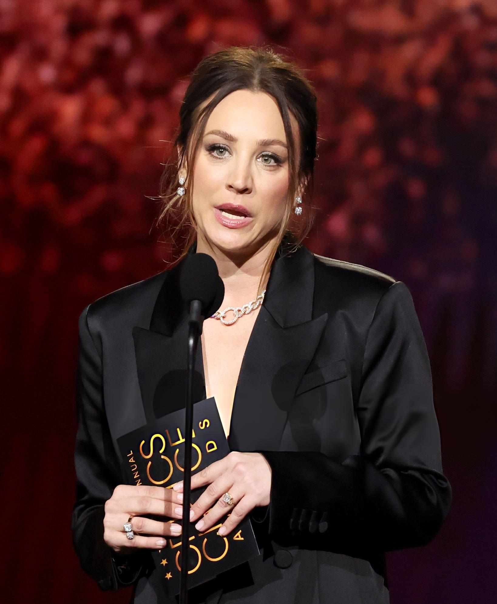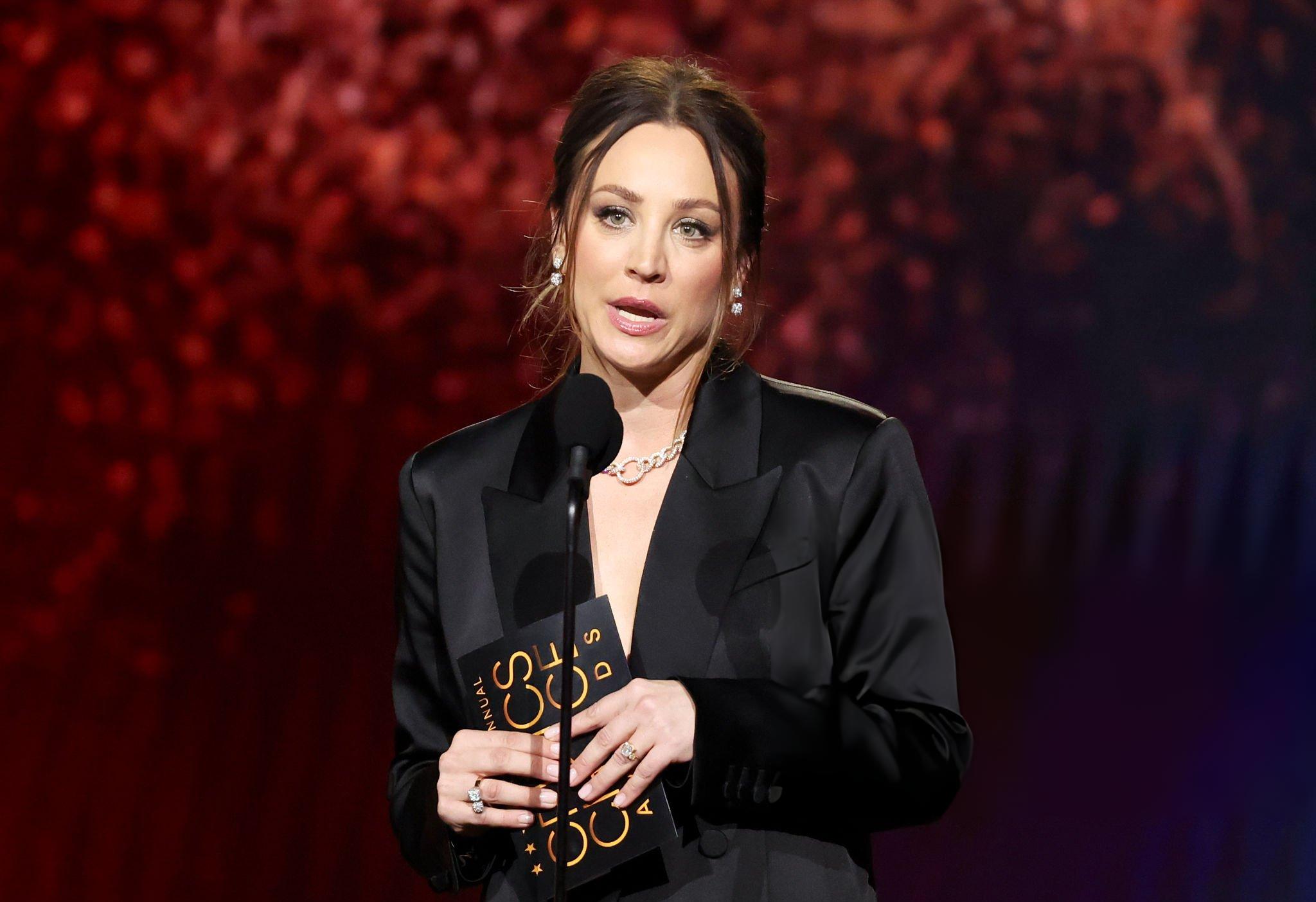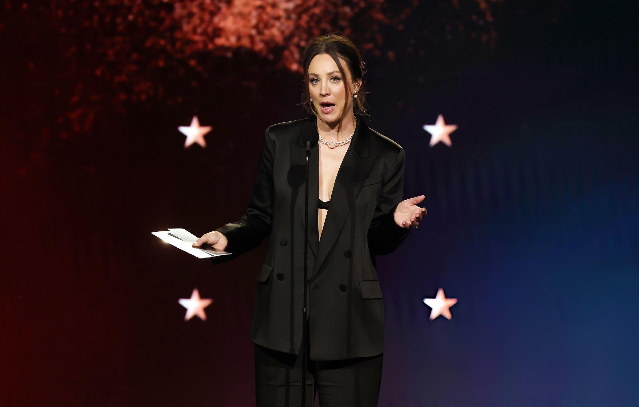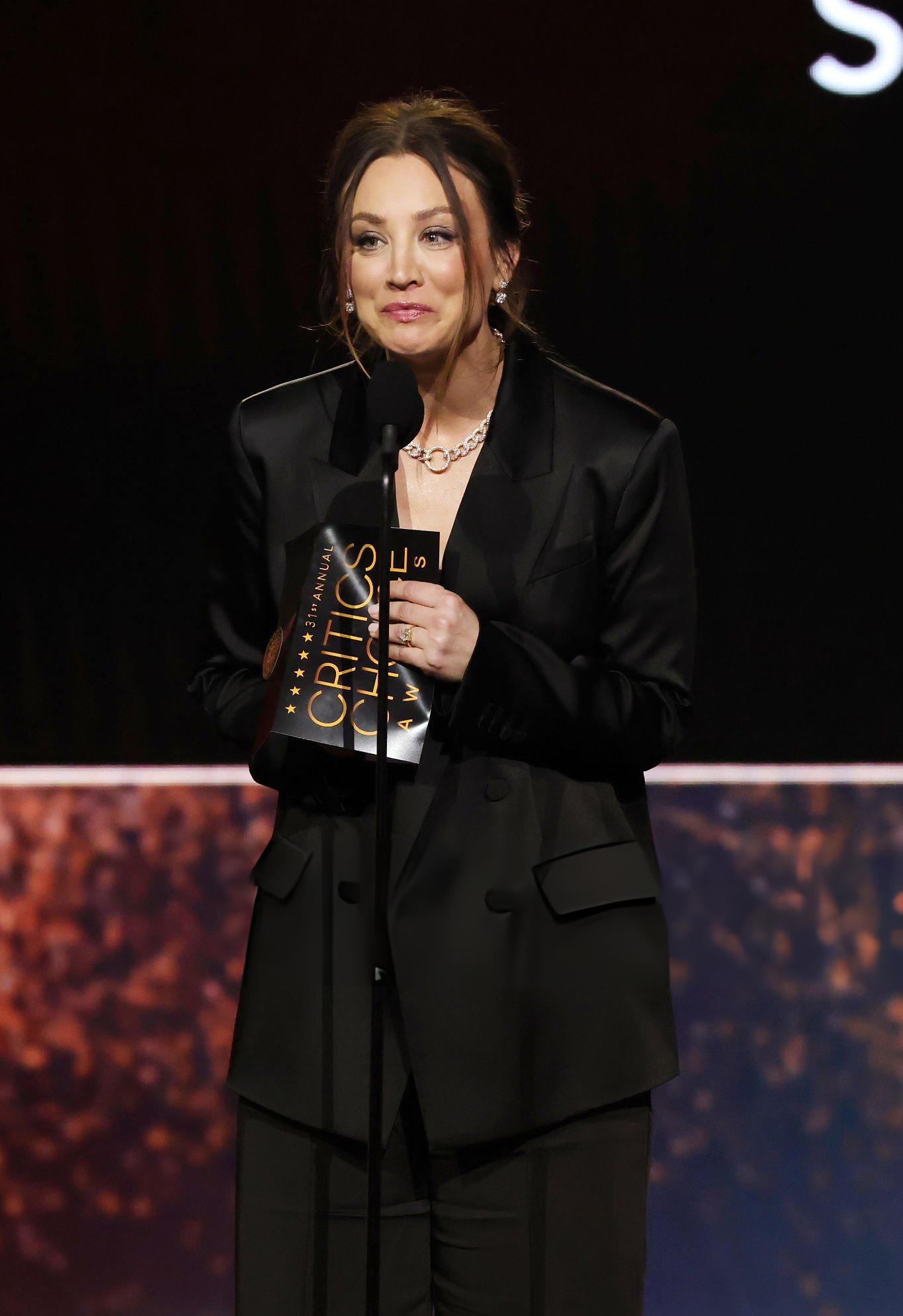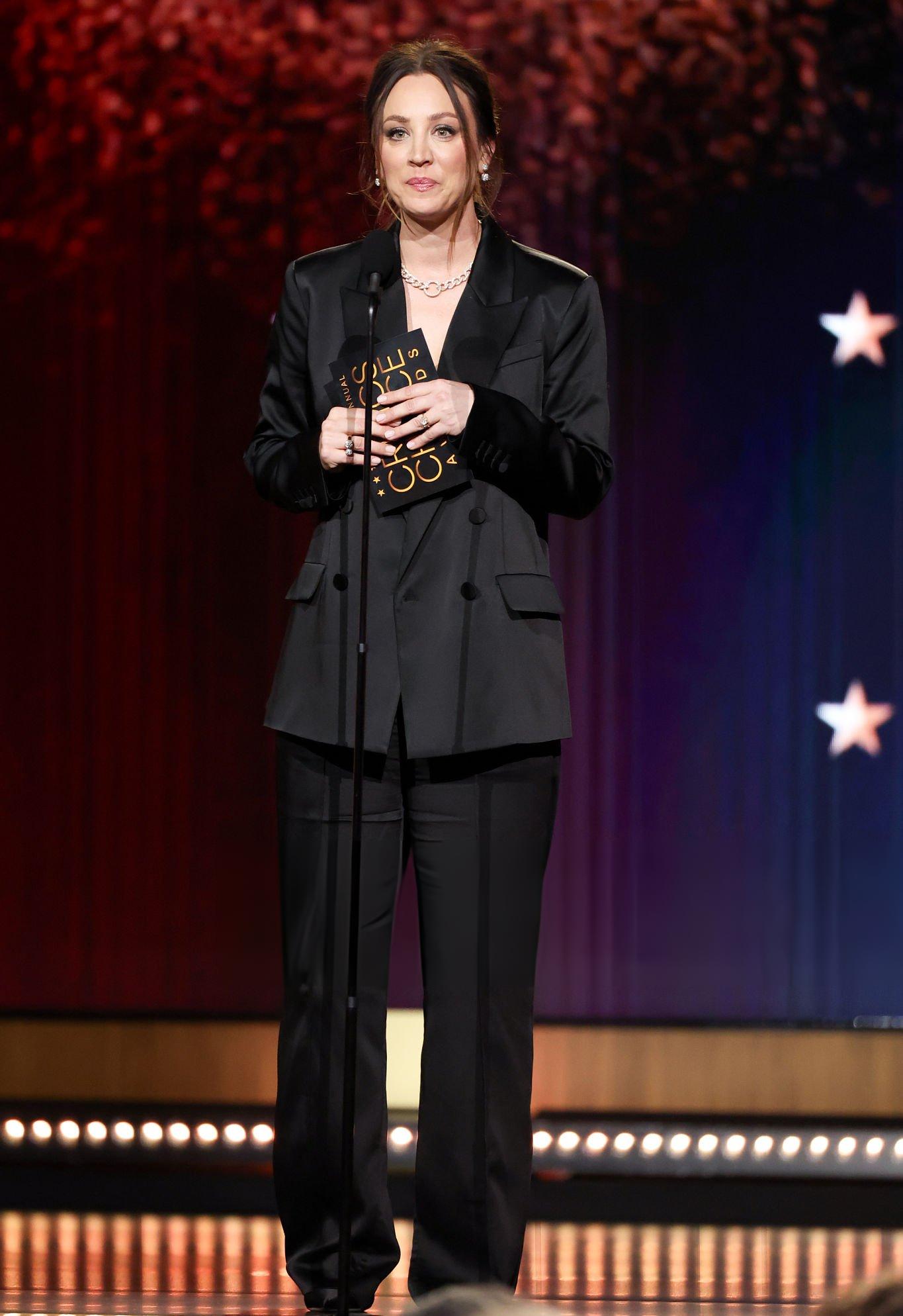Images and pictures showing Kaley Cuoco 31st Critics Choice Awards. Kaley appears in a black oversized satin suit. She stars in satin and silk at Barker Hangar on the 4th January 2026.