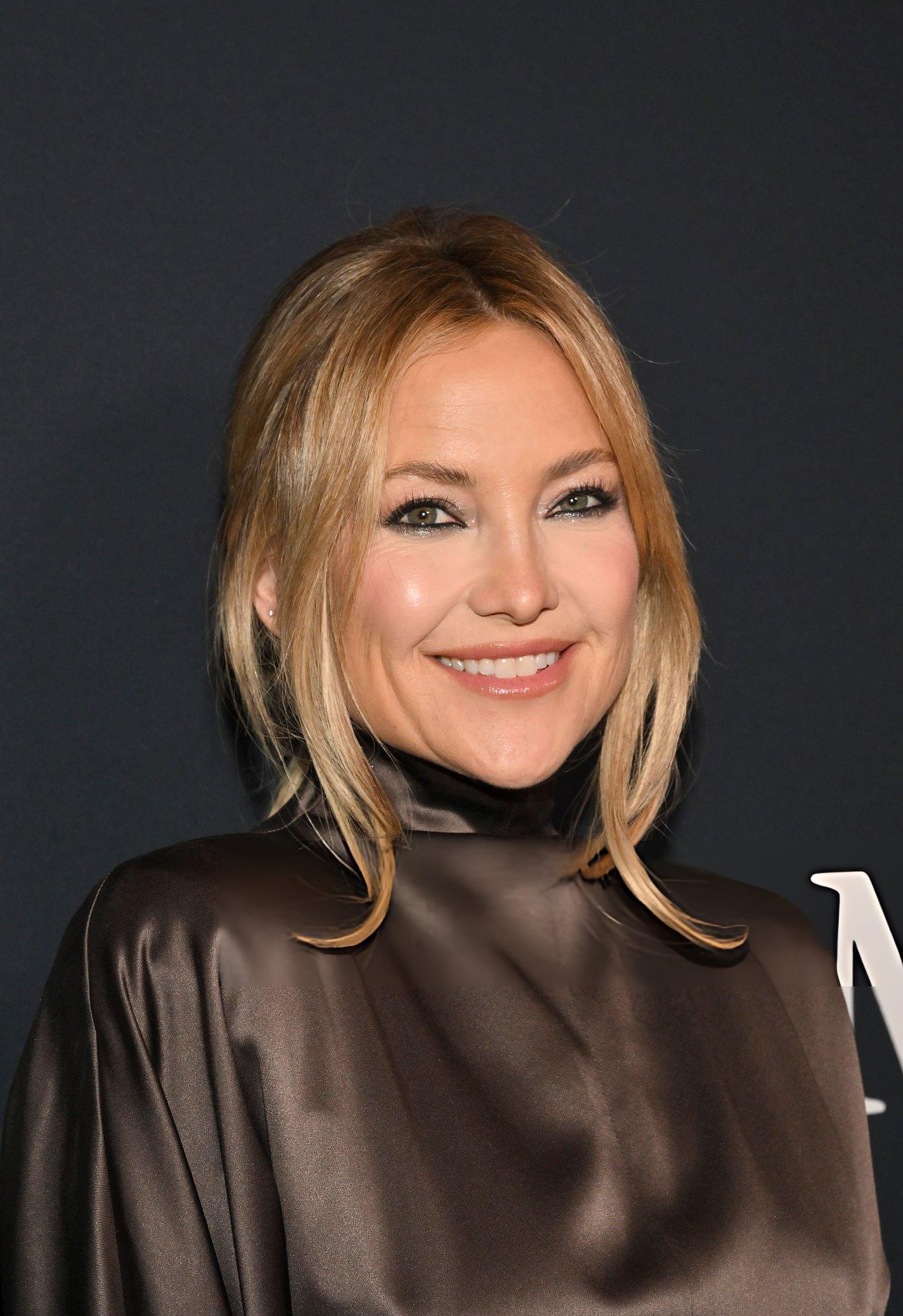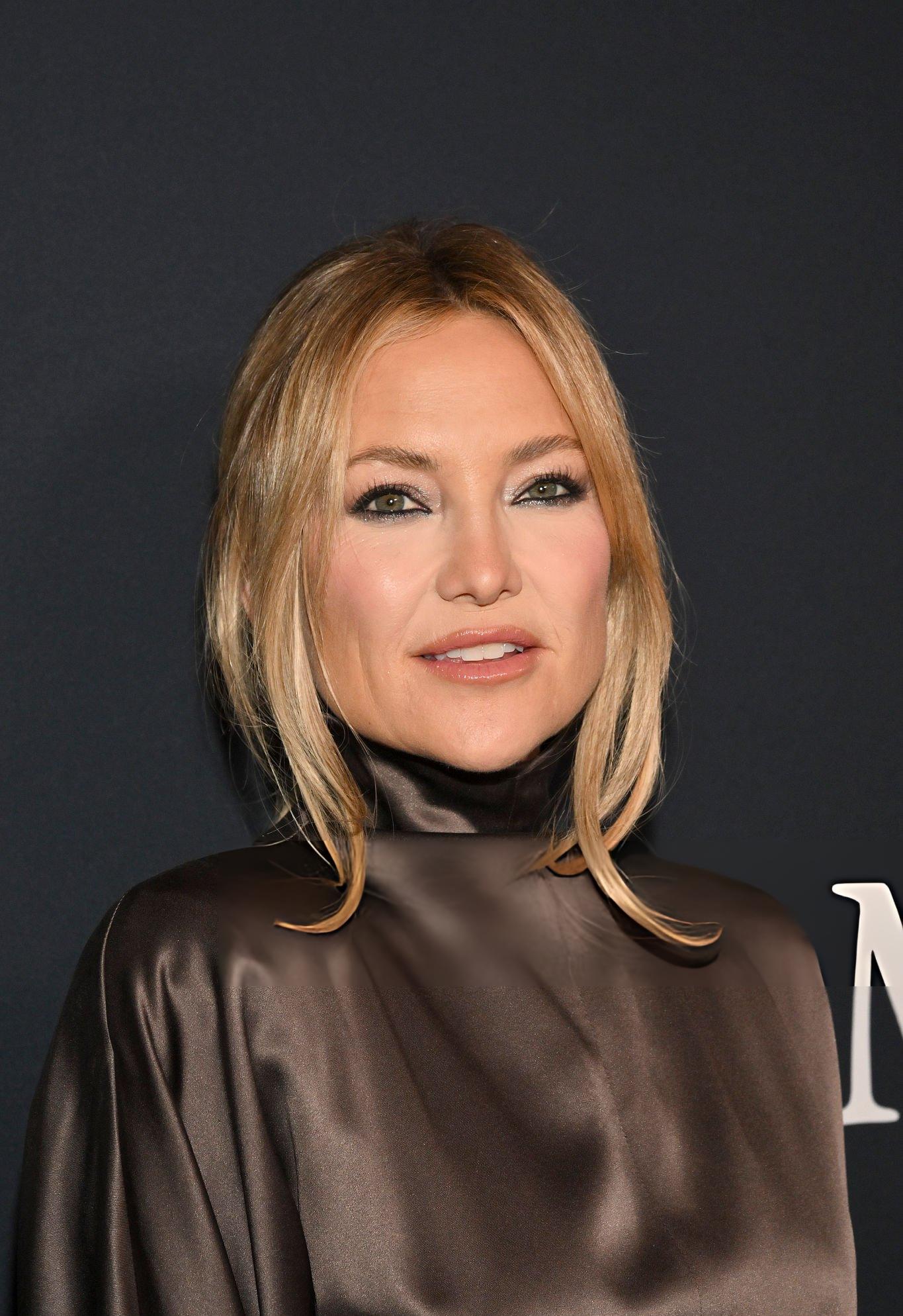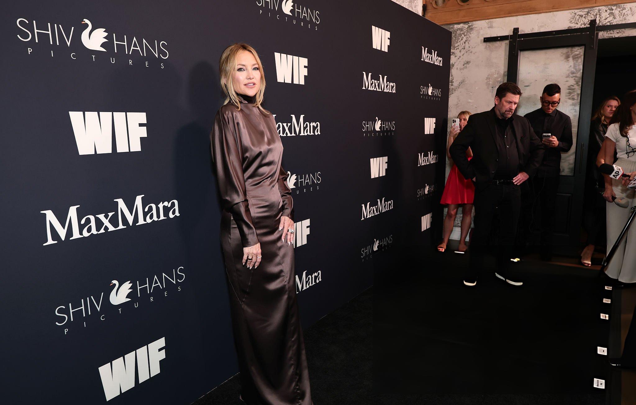 Kate Hudson images and photos from the 19th WIF Oscar Nominees Celebration. Kate wears a long sleeve rich brown satin dress. She stars in satin at Wheelhouse on the 13th March 2026.