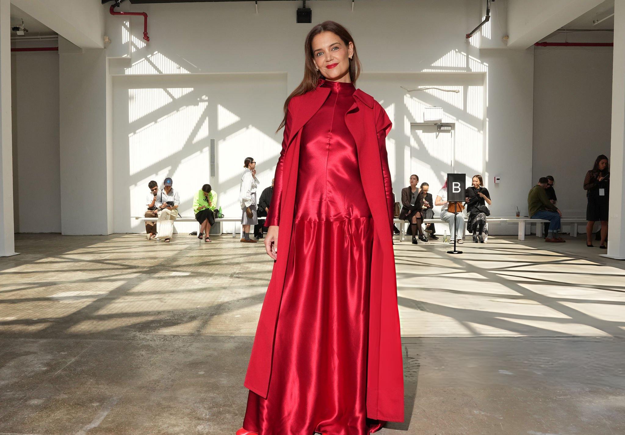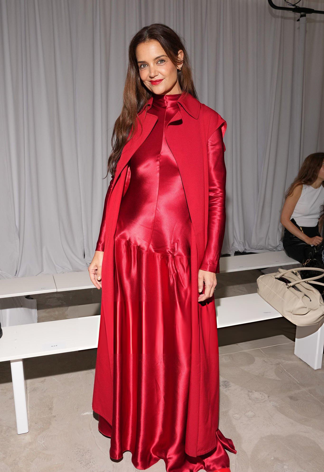 Photos and pictures of Katie Holmes at the FFORME Show for Spring and Summer 2026. Katie wears a red silky long sleeve dress. She stars in satin in New York City on the 12th September 2025.
