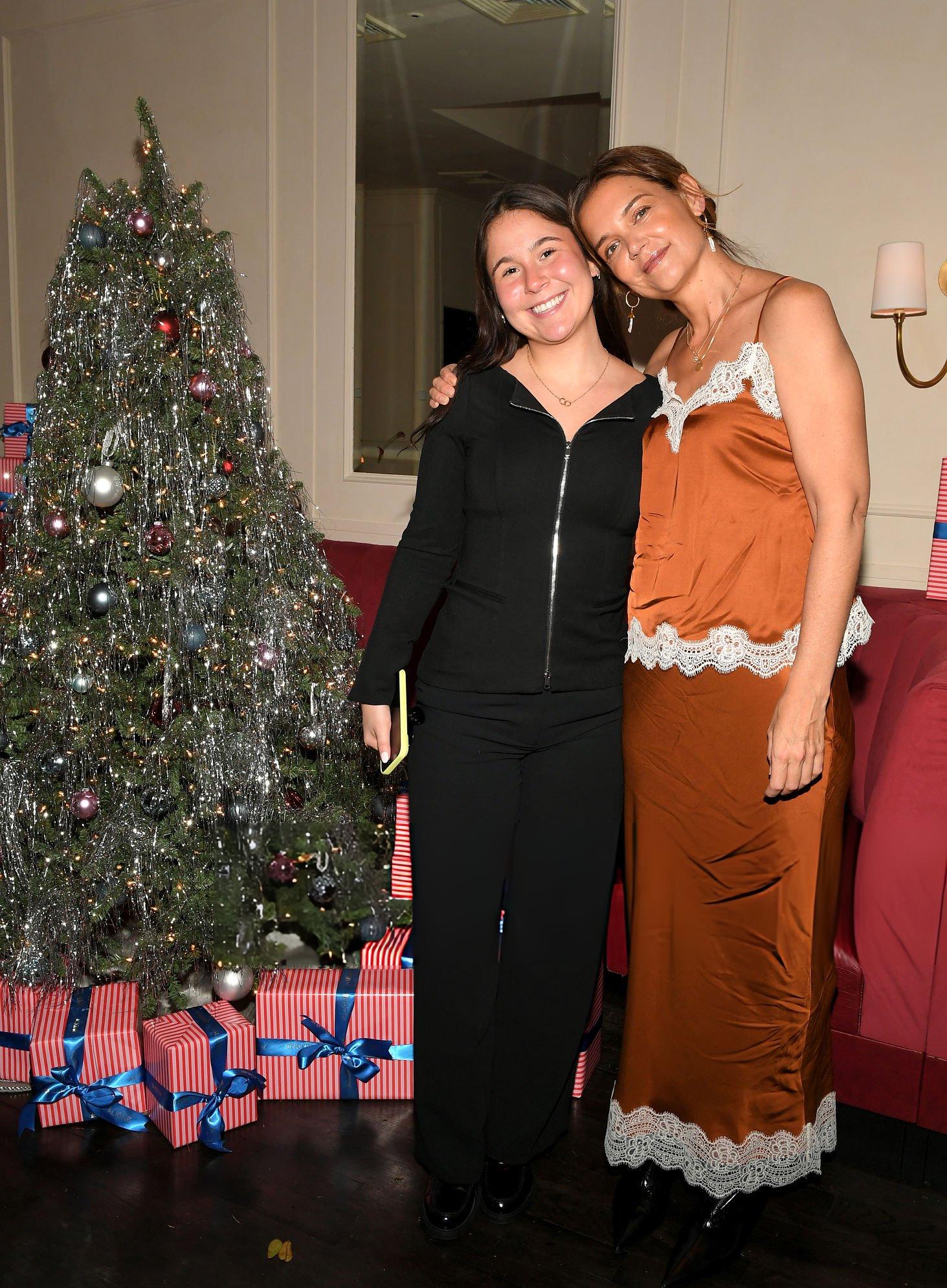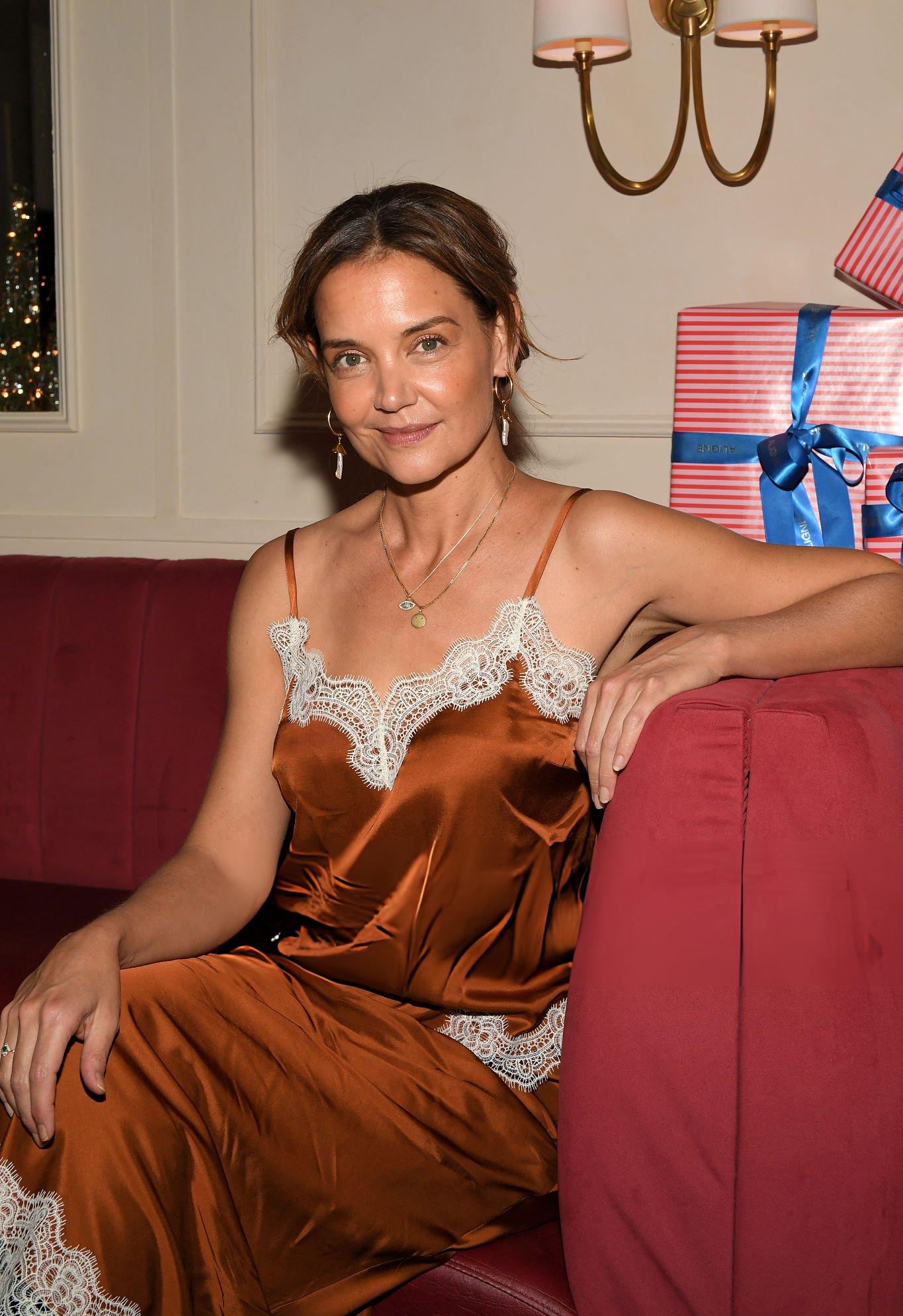 Photos and pictures of Katie Holmes at the ALIGNE Giving Tuesday Holiday Dinner. Katie wears a satin and lace satin top and skirt. She stars in satin at Chateau Royale on the 2nd December 2025.
