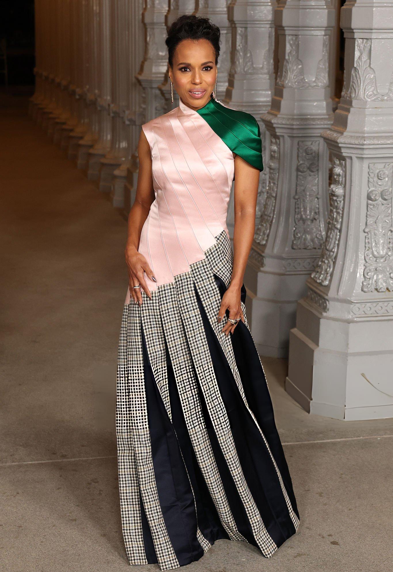 Kerry Washington LACMA Art+Film Gala images and pictures. Kerry is seen in a pink and green satin section outfit. She appears in satin at the Los Angeles event on the 1st November 2025.