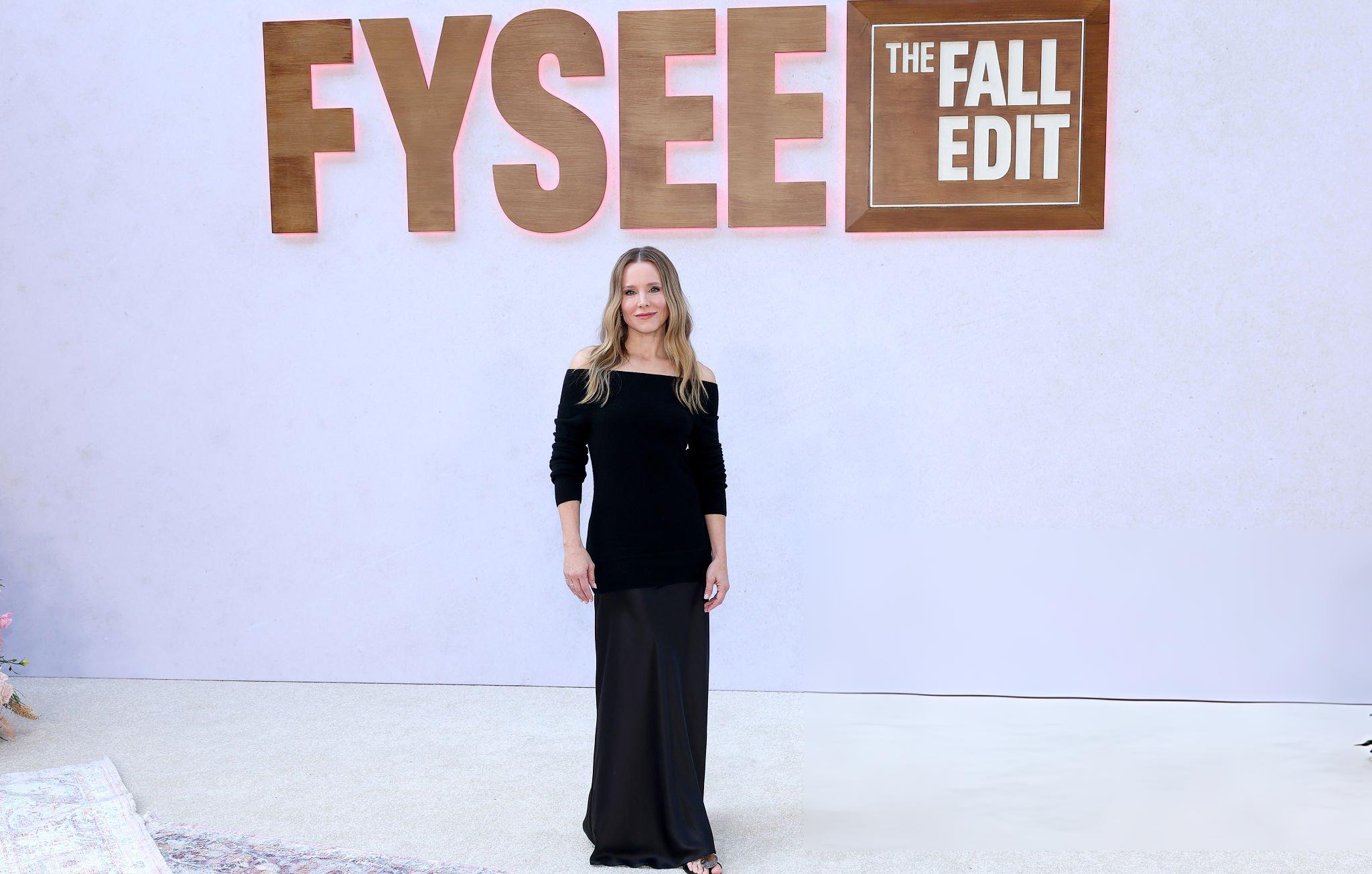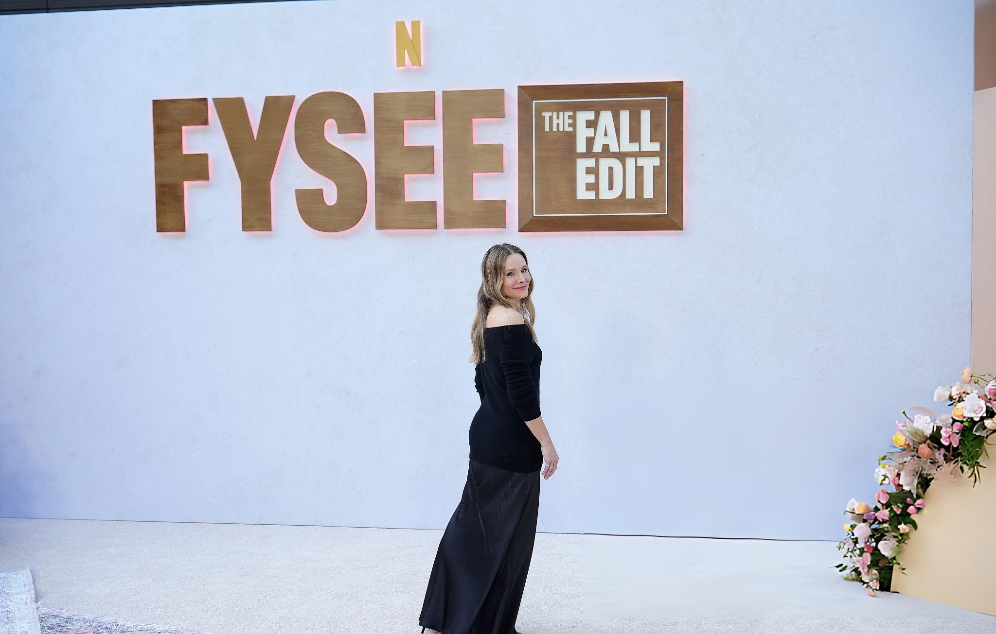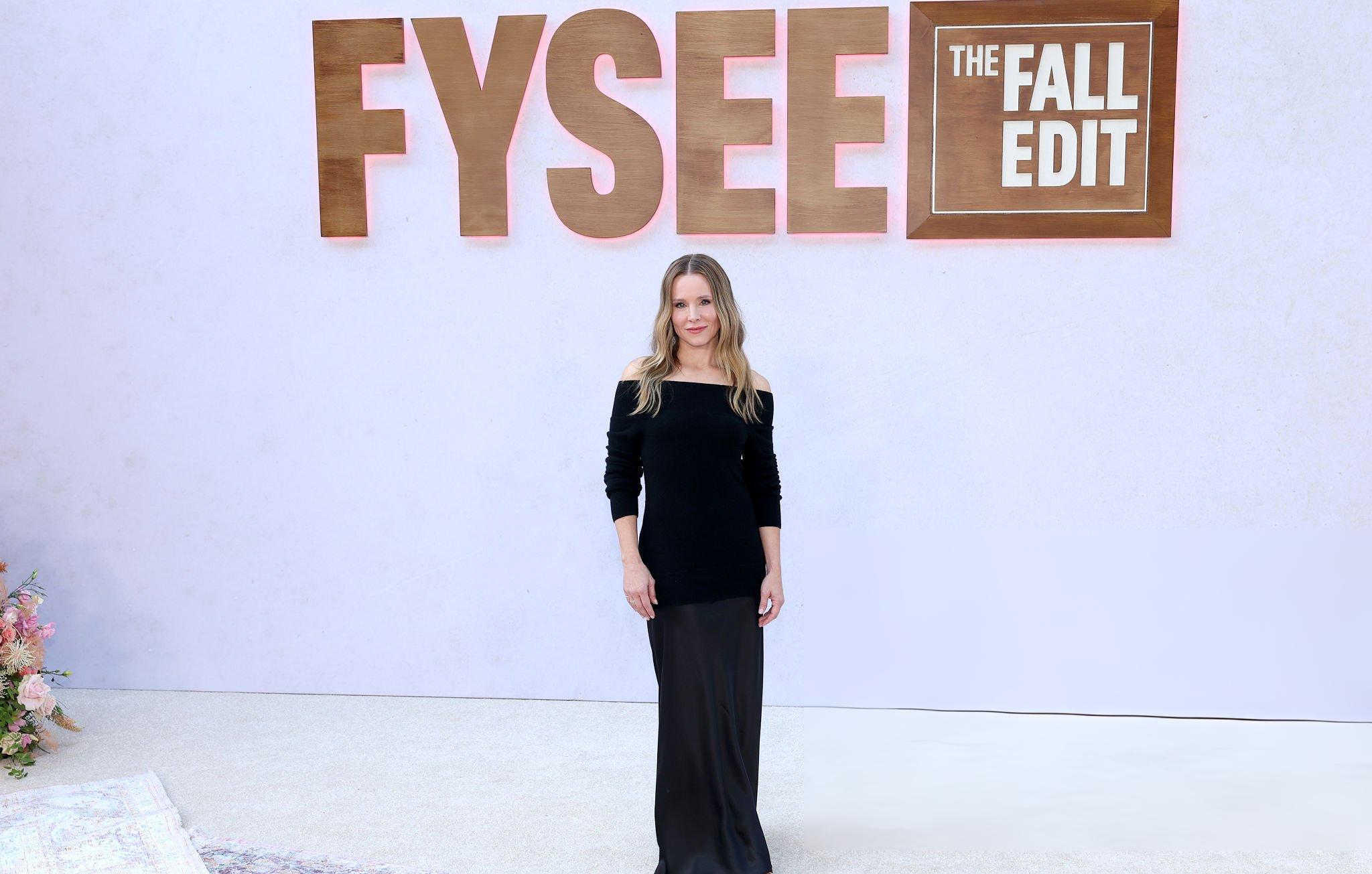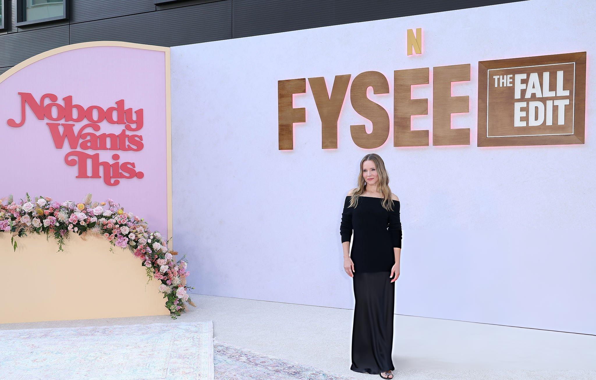 Images and photos of Kristen Bell at a Netflix Fall Edit event. Kristen appears in a long black satin section dress. She appears in silk and satin in Los Angeles on the 7th November 2025.