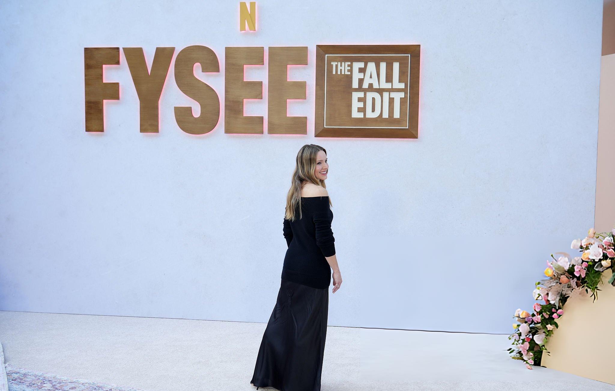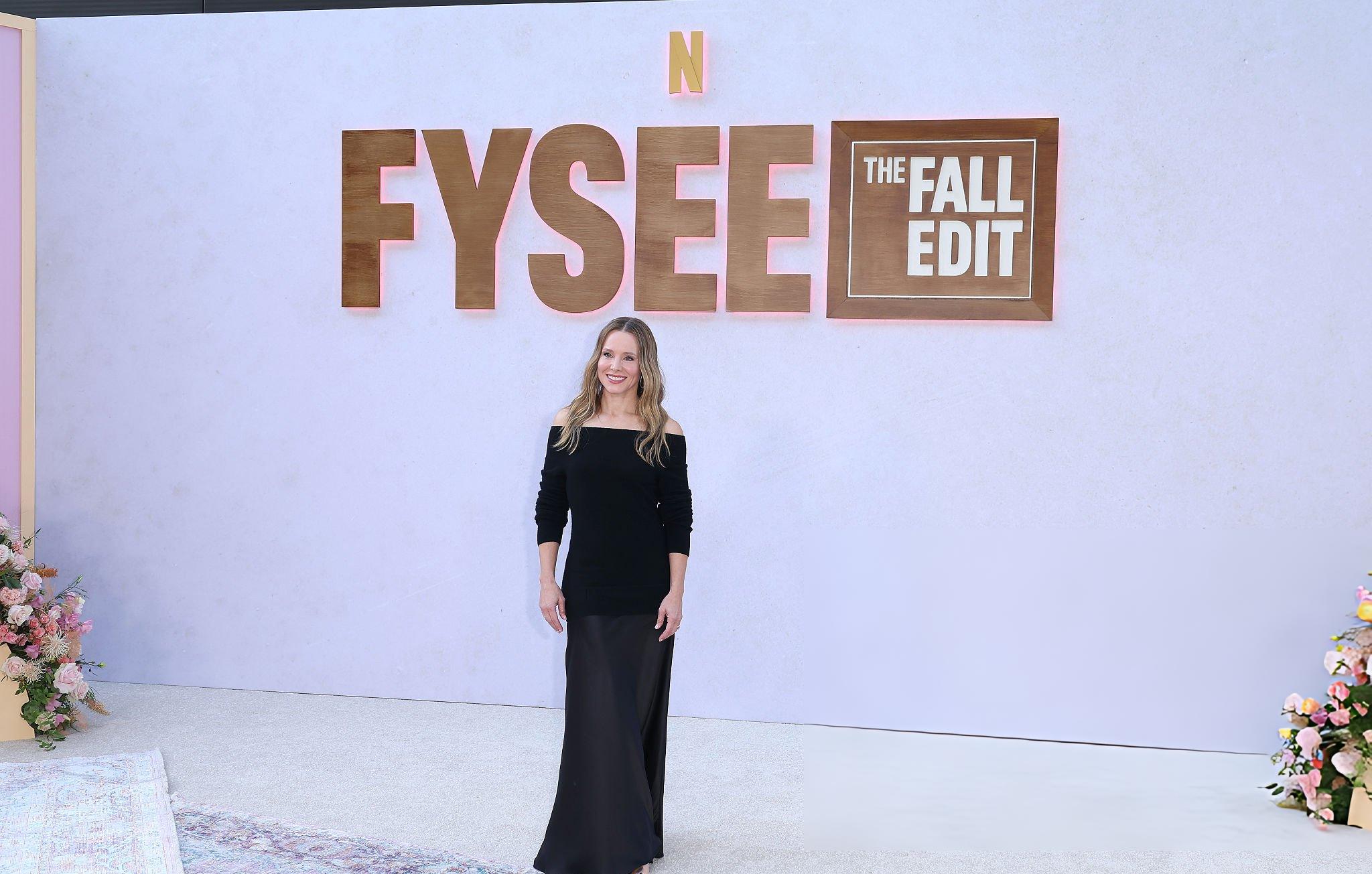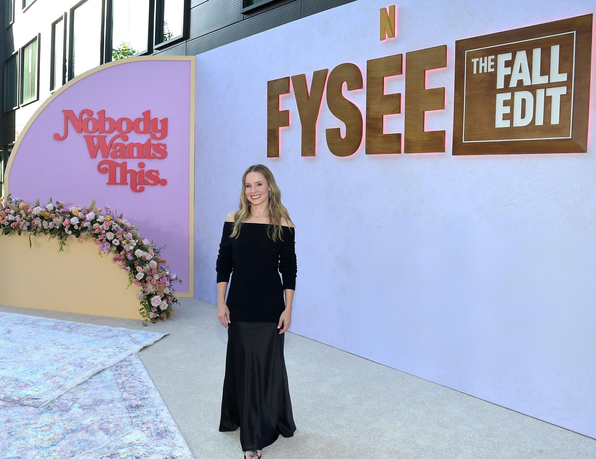 Images and photos of Kristen Bell at a Netflix Fall Edit event. Kristen appears in a long black satin section dress. She appears in silk and satin in Los Angeles on the 7th November 2025.