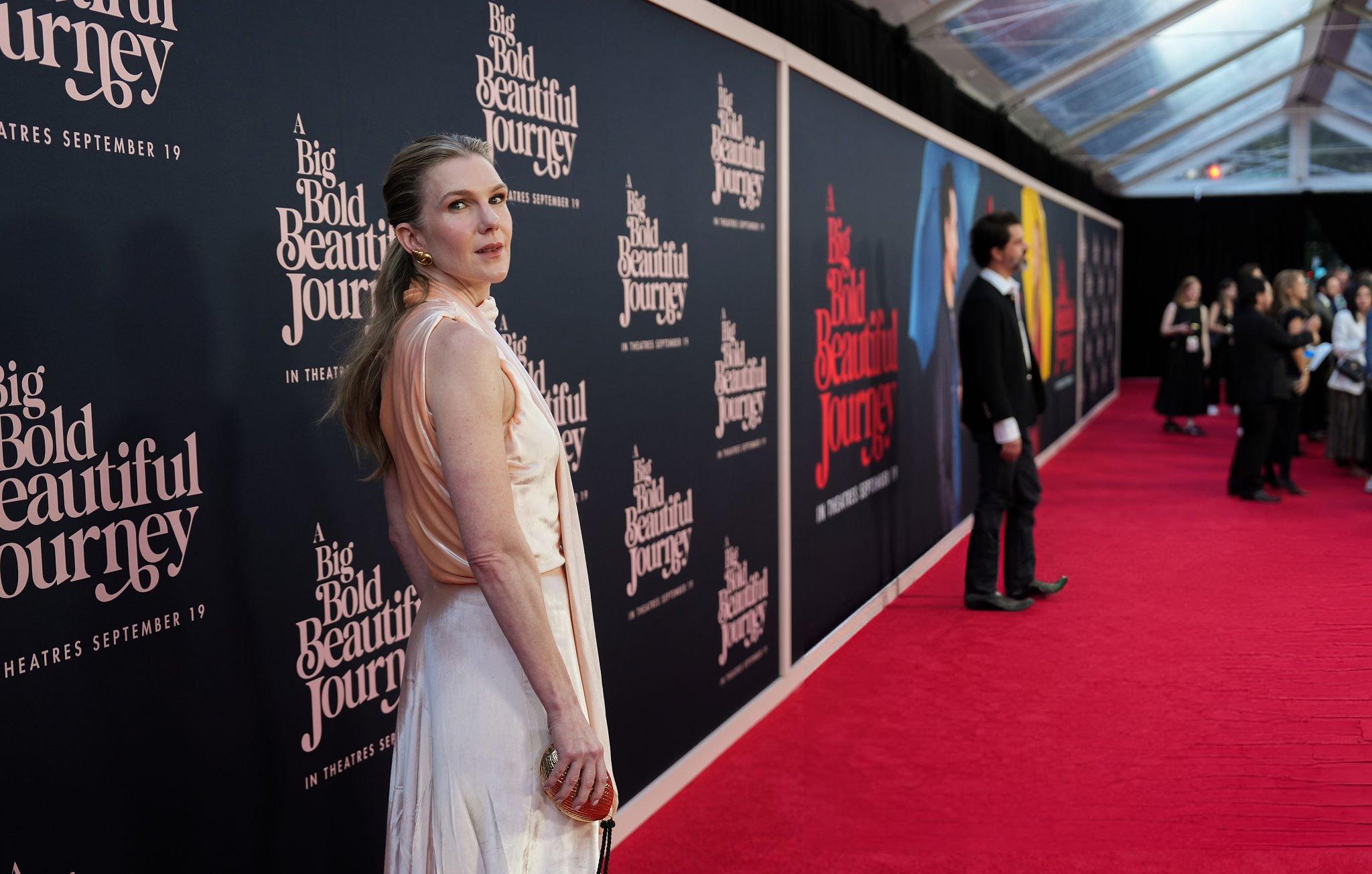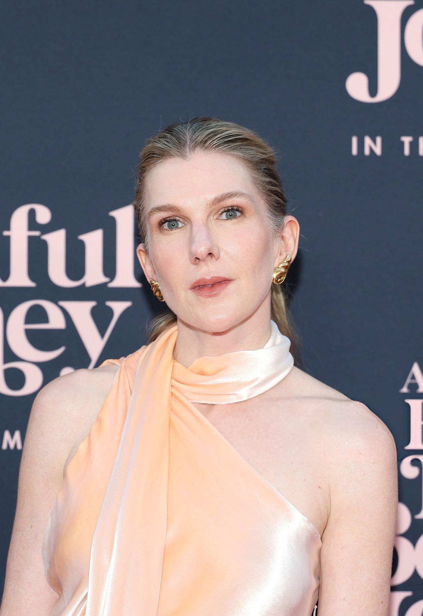 Pictures and photos of Lily Rabe at the premiere of A Big Bold Beautiful Journey. Lily wears a light peach satin dress. She stars in satin at AMC Lincoln Square Theater on the 15th September 2025.
