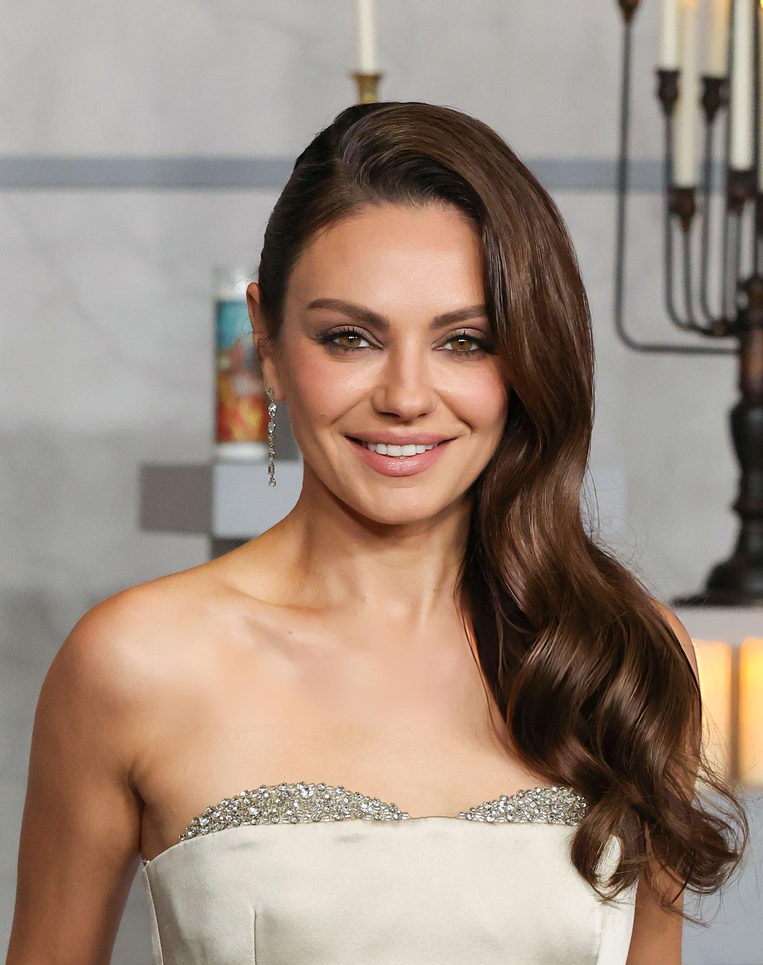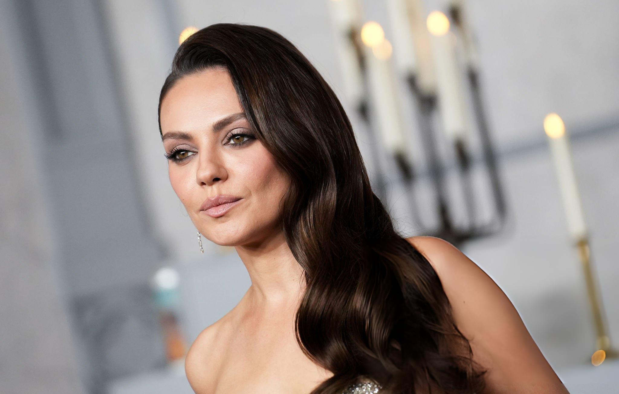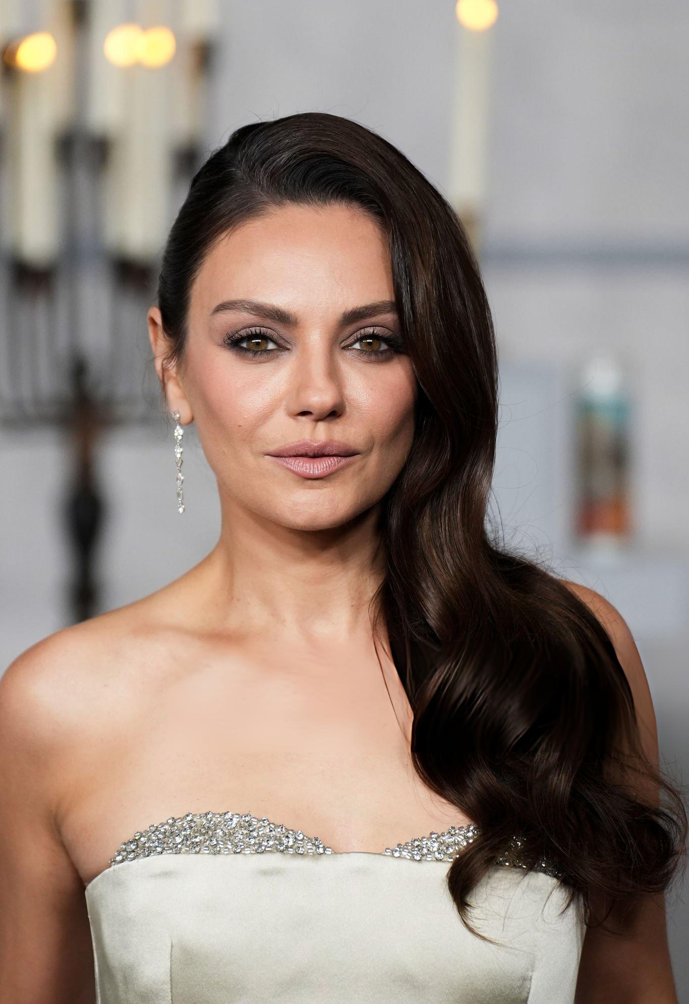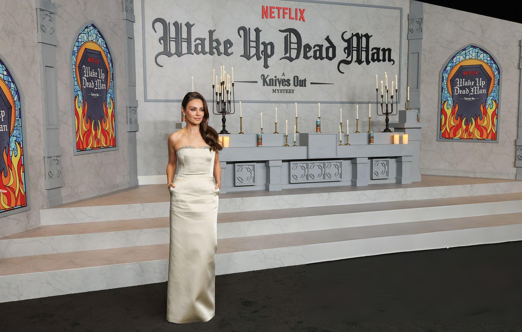 Mila Kunis photos and images from the premiere of Wake Up Dead Man. Mila appears in a light silver satin and silk gown. She wears satin in Los Angeles on the 17th November 2025.