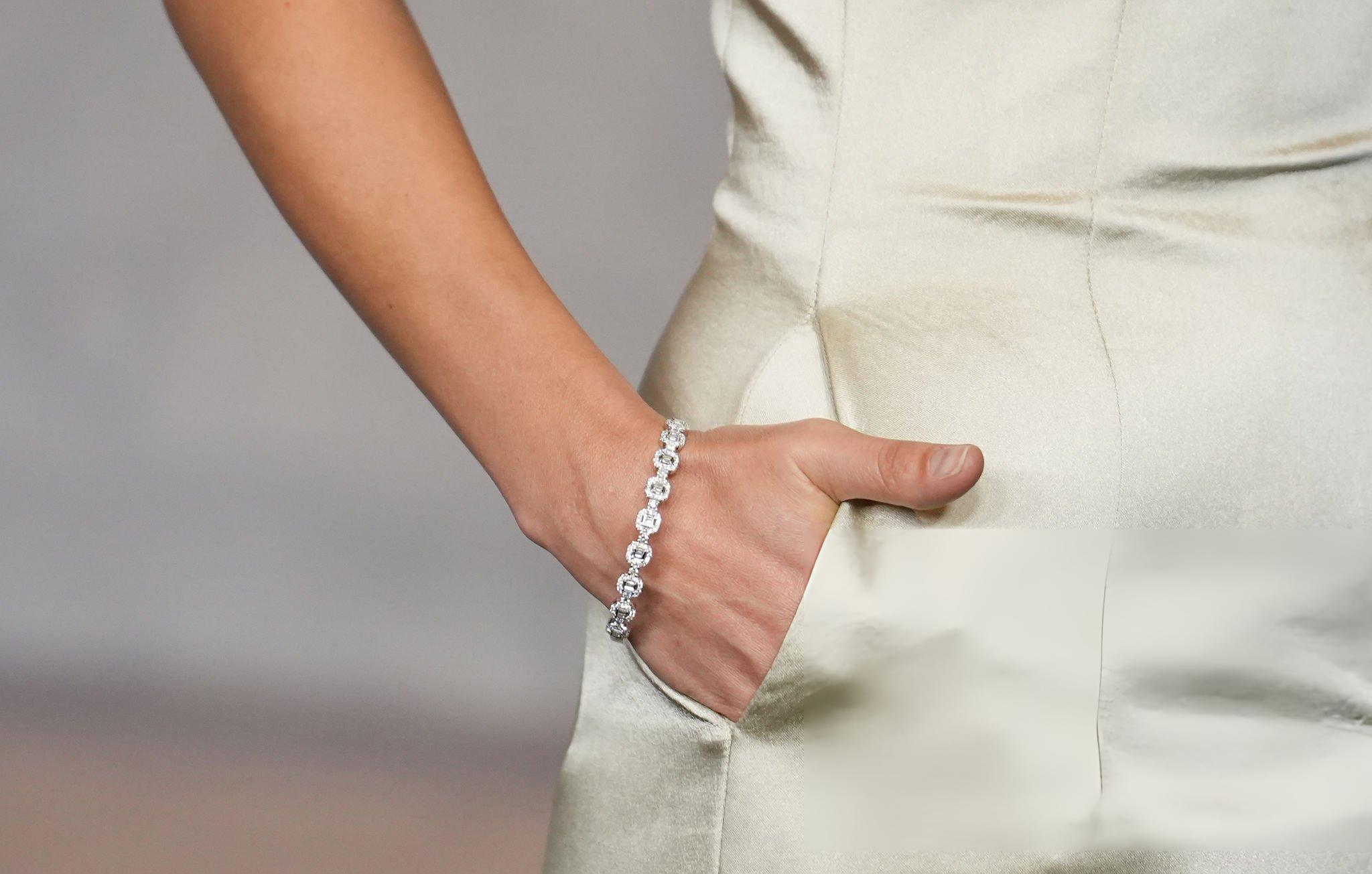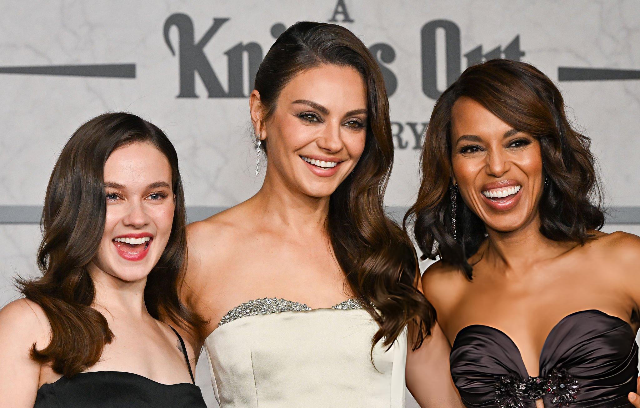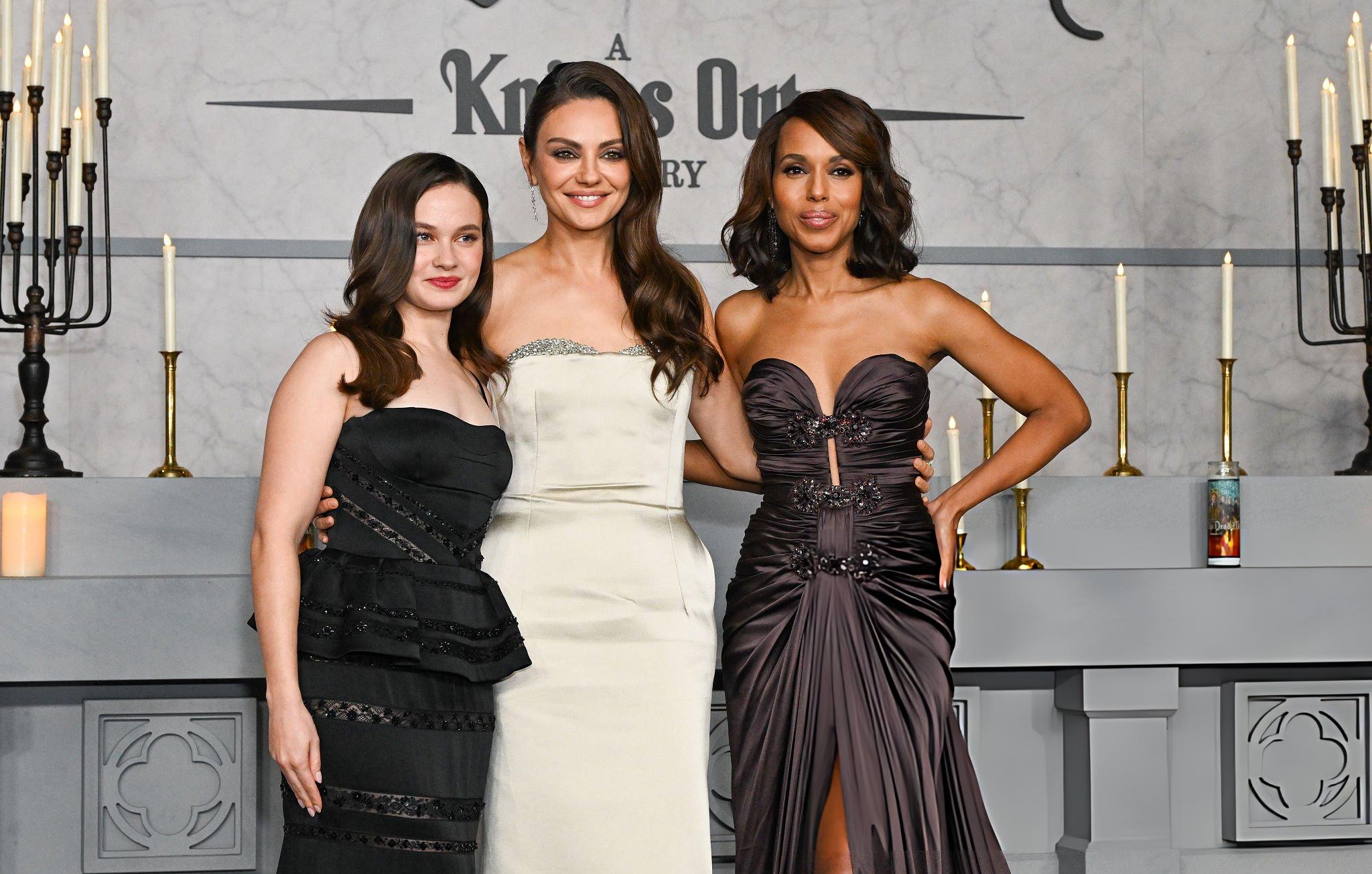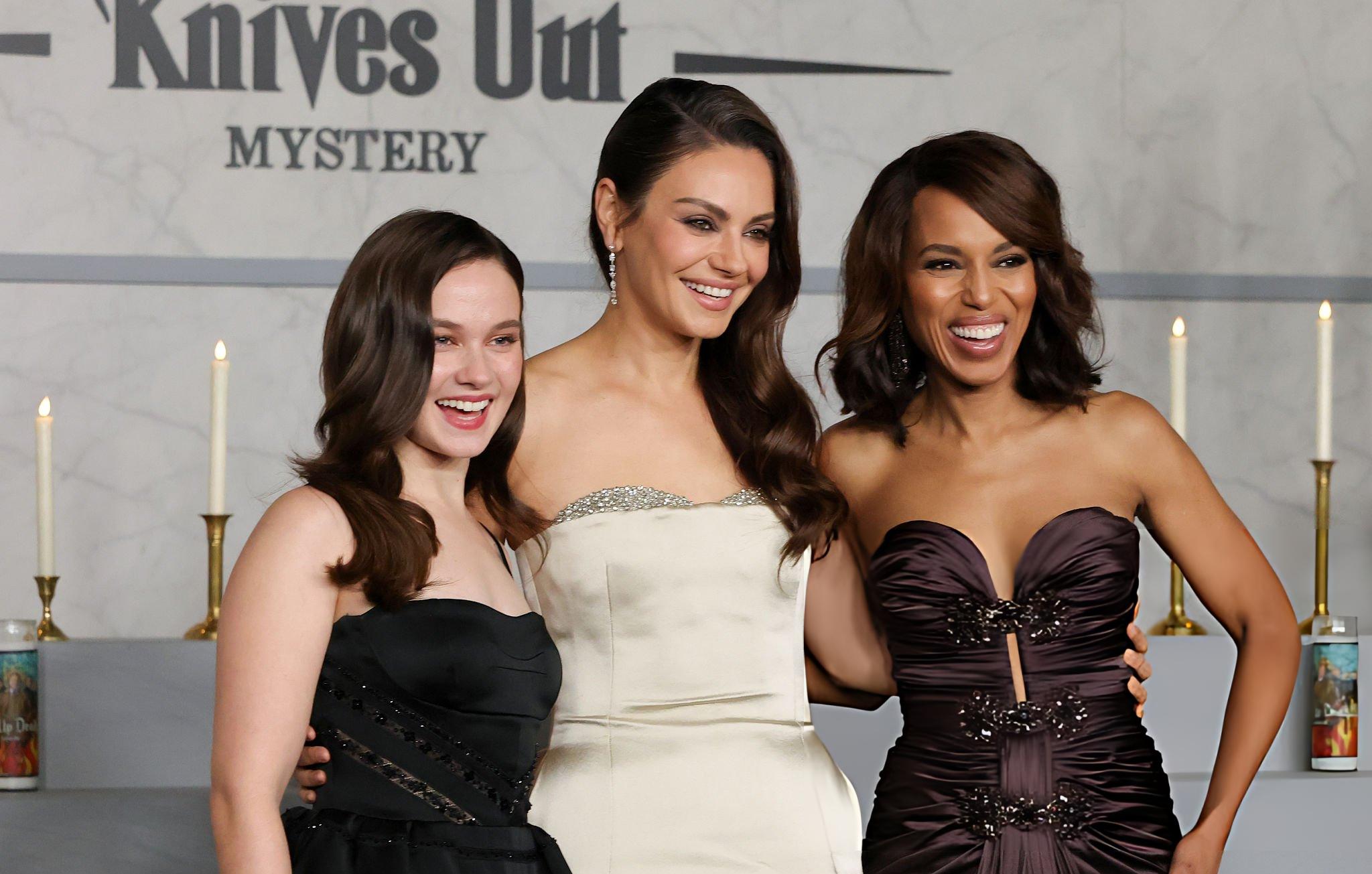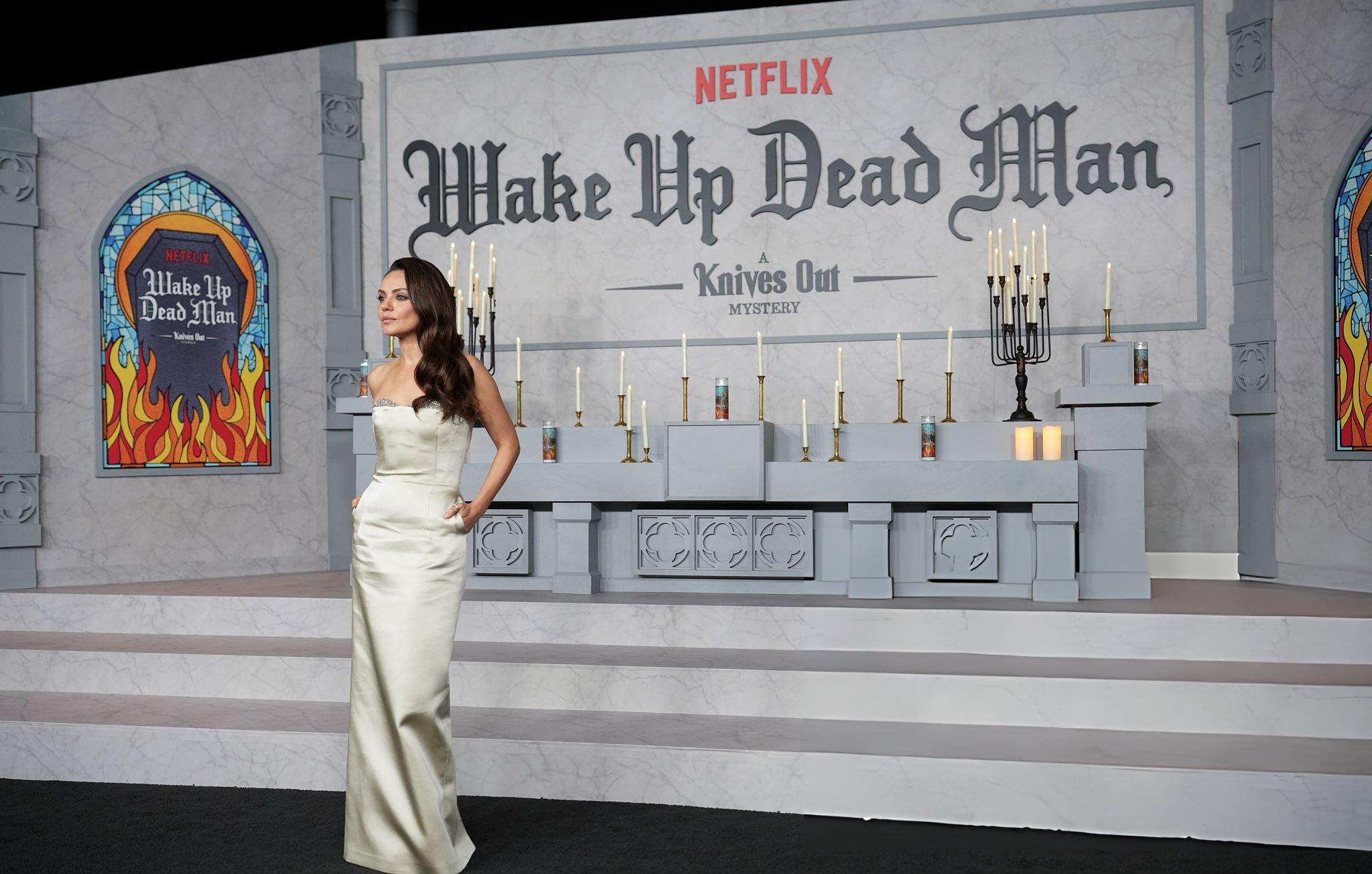 Mila Kunis photos and images from the premiere of Wake Up Dead Man. Mila appears in a light silver satin and silk gown. She wears satin in Los Angeles on the 17th November 2025.