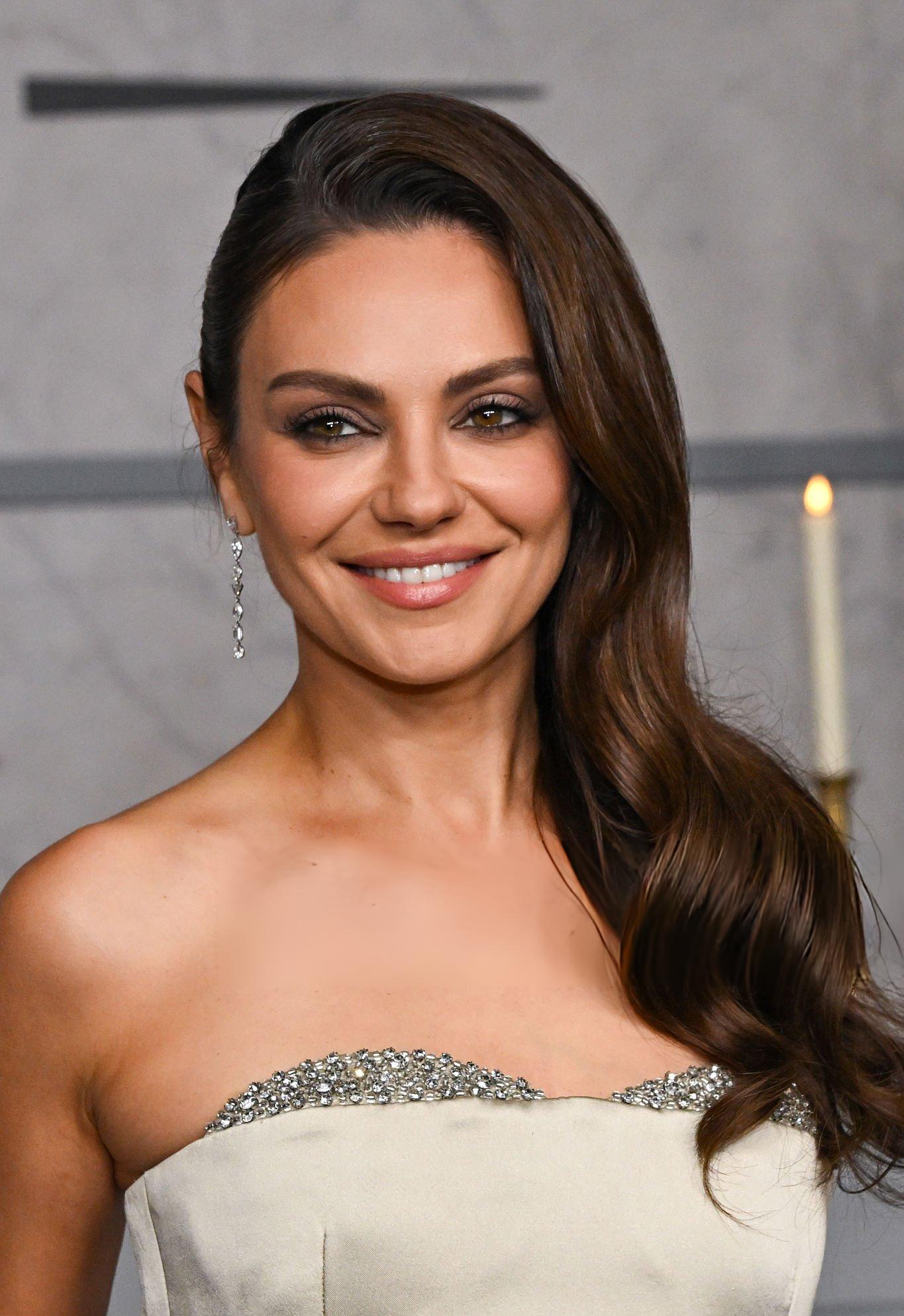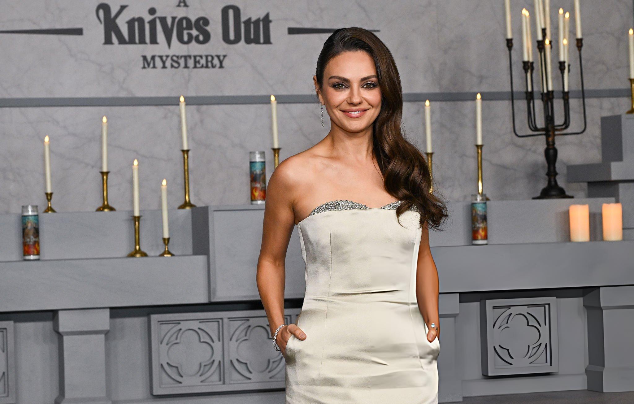 Mila Kunis photos and images from the premiere of Wake Up Dead Man. Mila appears in a light silver satin and silk gown. She wears satin in Los Angeles on the 17th November 2025.