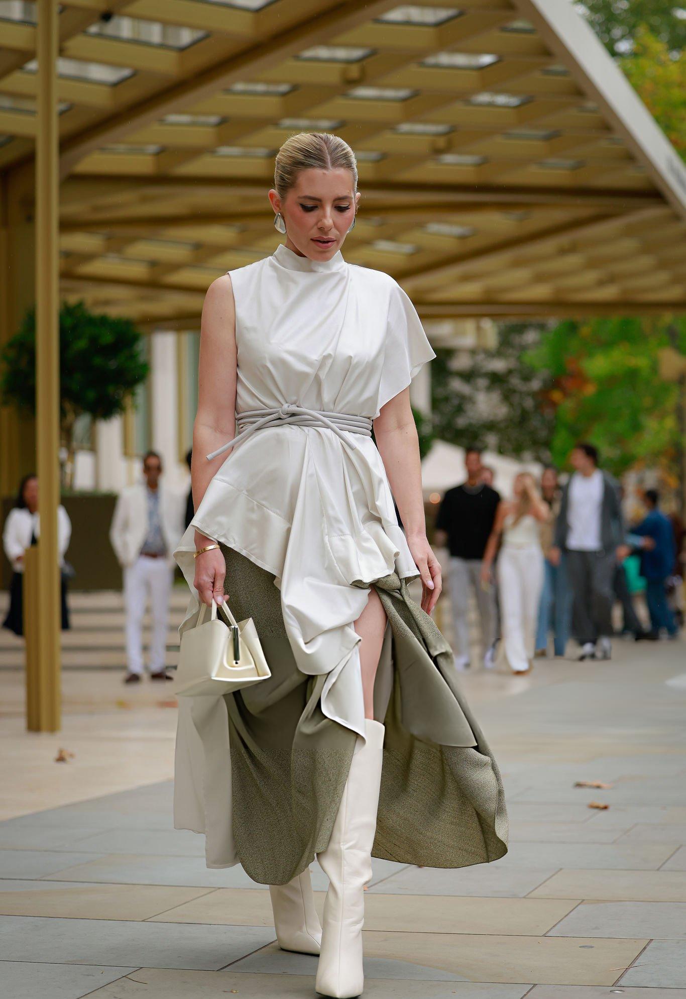 Mollie King images and photos taken during London Fashion Week 2025. Mollie appears in a white satin dress. She wears silk and satin at the Roksanda show on the 20th September 2025.