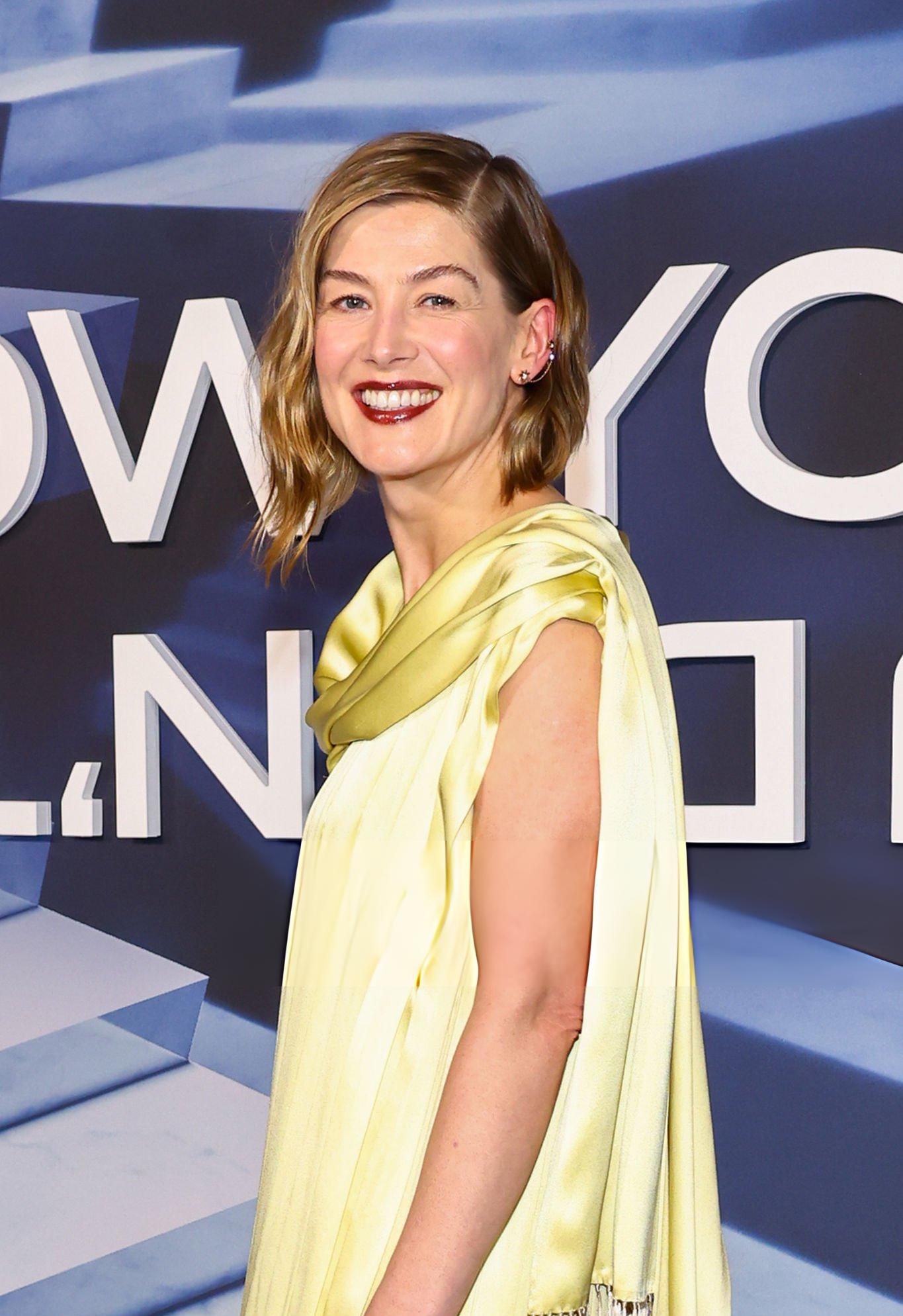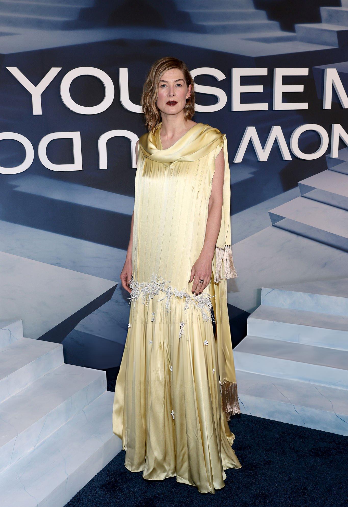 Photos and pictures of Rosamund Pike at the Now You See Me: Now You Don’t Premiere. Rosamund stars in a light gold satin dress. She wears satin in New York City on the 10th November 2025.