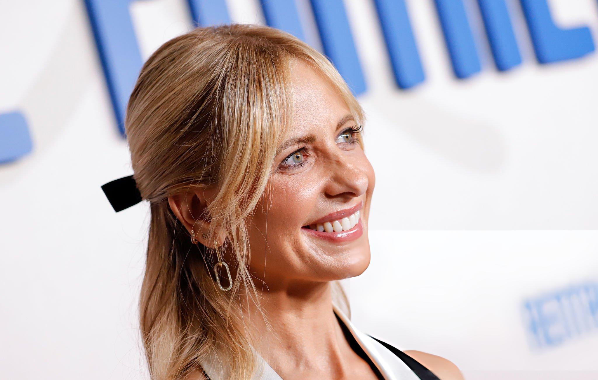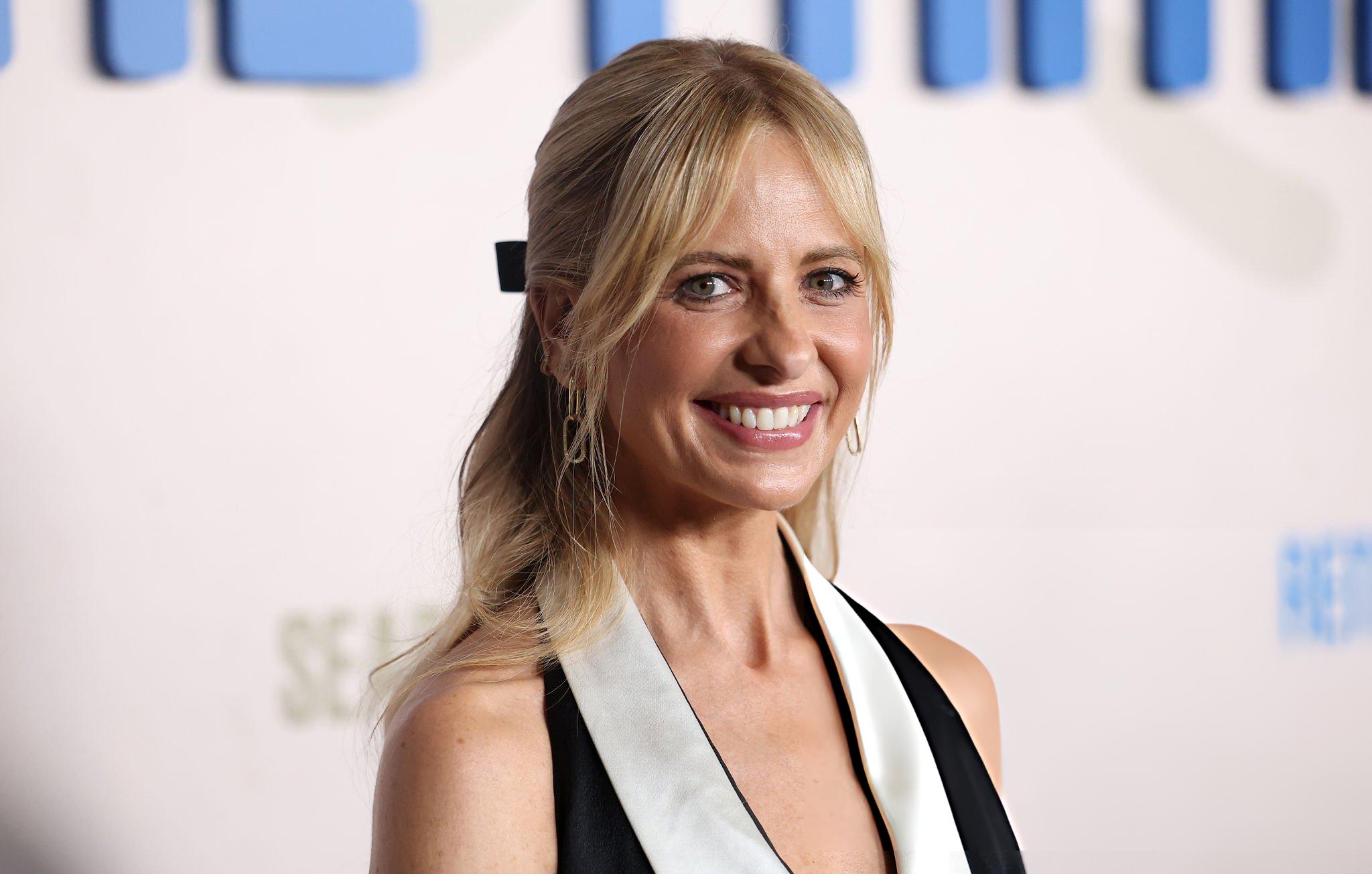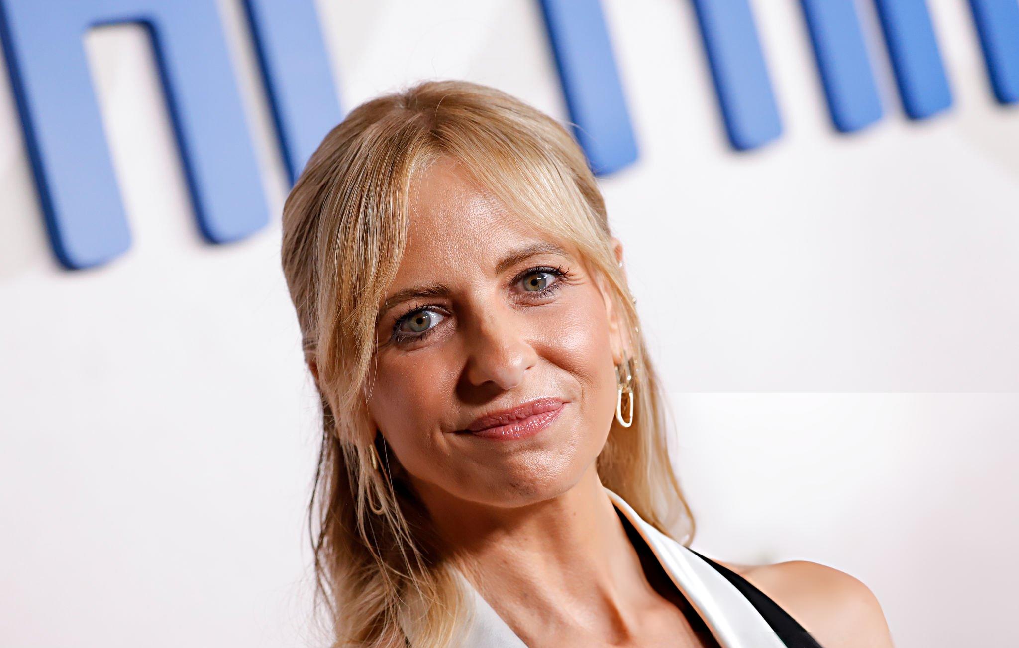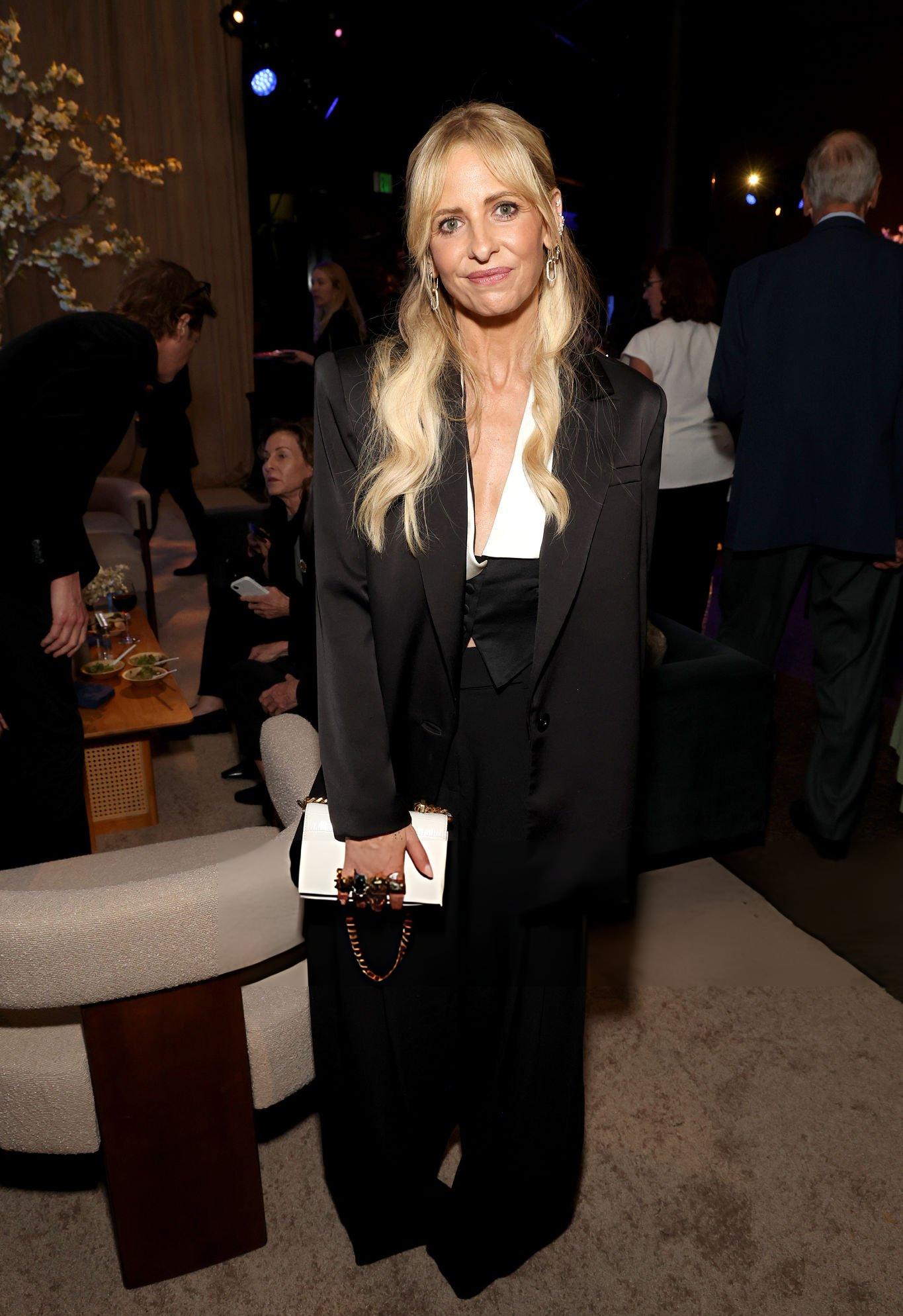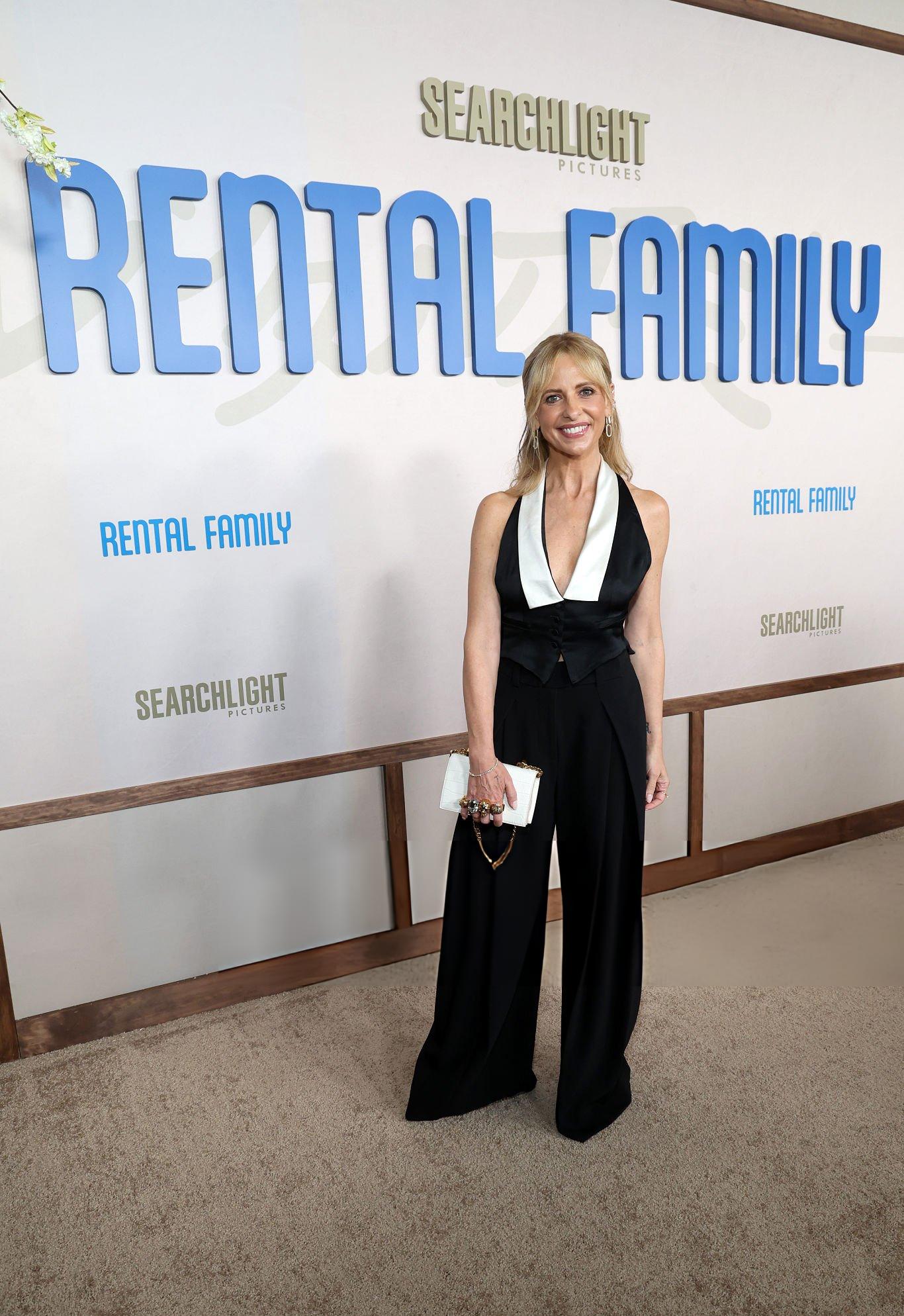 Photos and pictures of Sarah Michelle Gellar at the premiere of Rental Family. Sarah wears a black and light silver satin waistcoat. She stars in satin at DGA Theater Complex on the 12th November 2025.