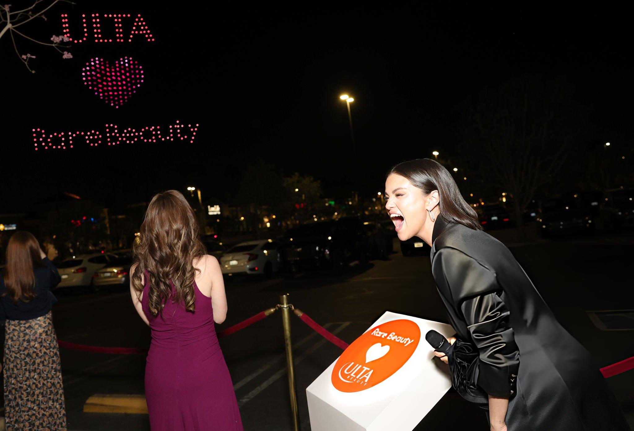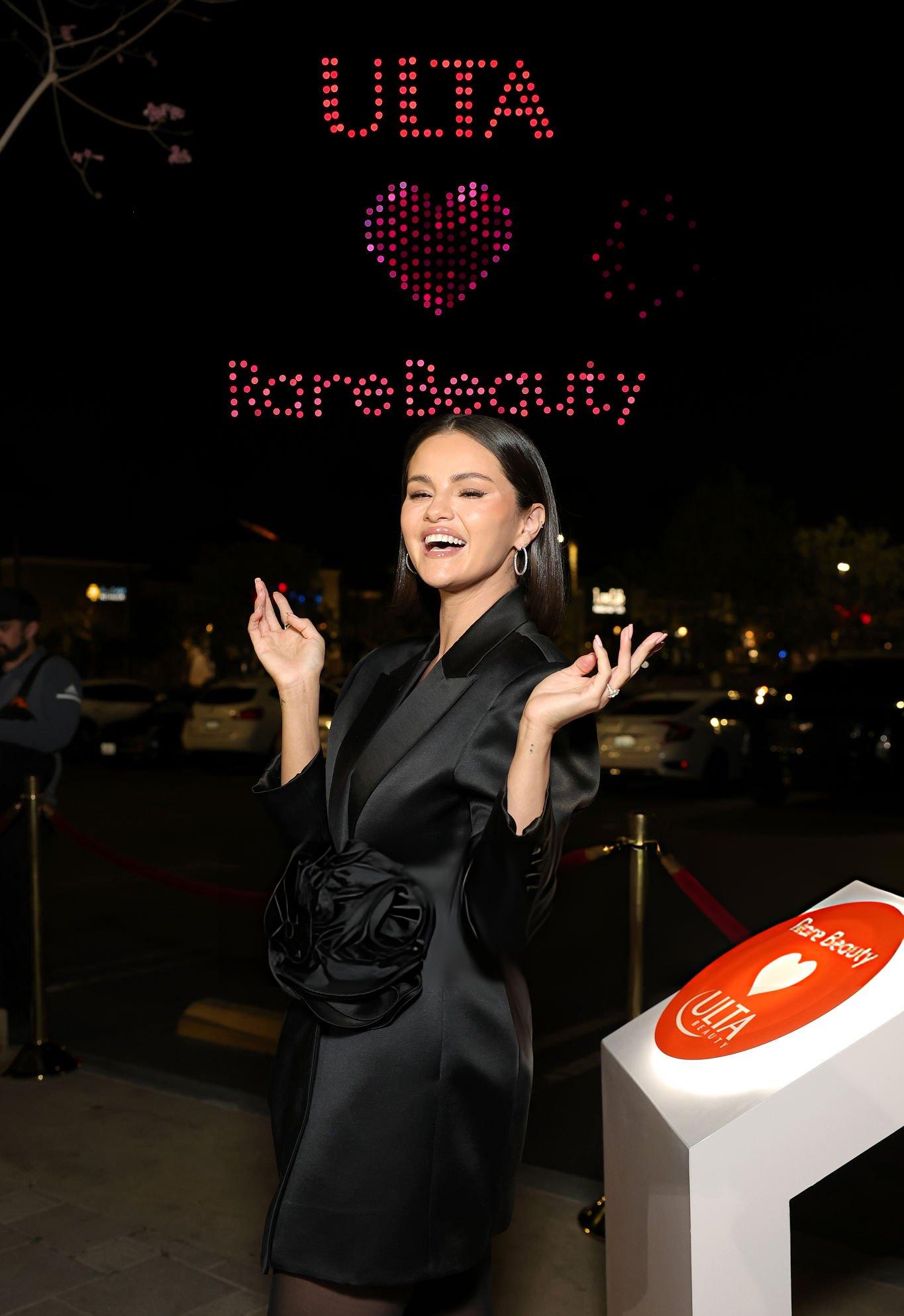 Photos and pictures of Selena Gomez Rare appearing at the Rare Beauty Launch. Selena stars in a black silk satin blazer dress. She wears satin at Ulta Beauty on the 31st January 2026.