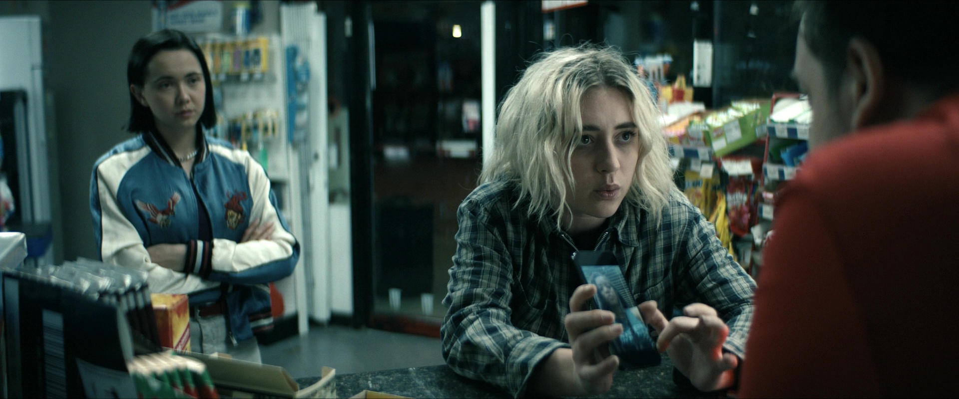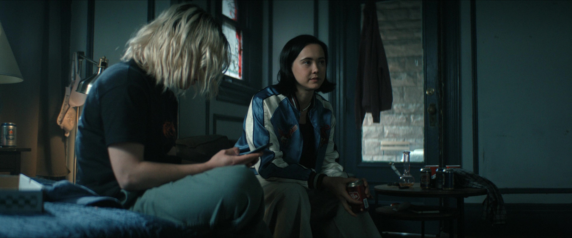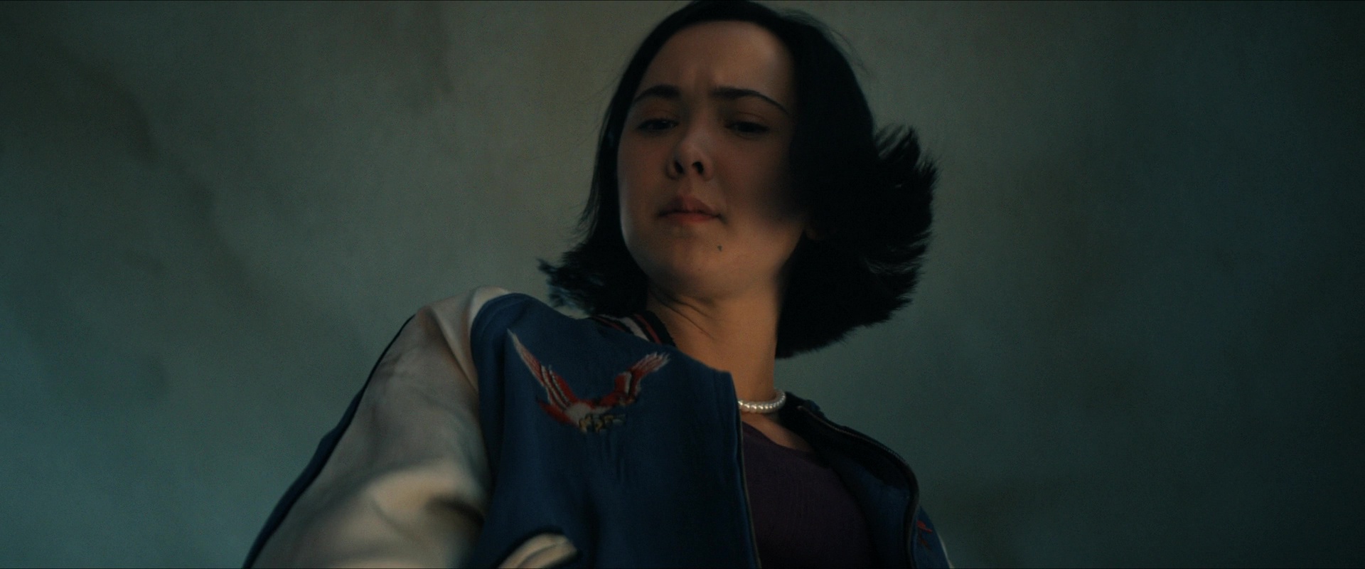 Screen captures from the season two Gen V episode “New Year, New U”. London Thor wears a silk and satin jacket in the television series. She appears as the character Jordan Li.