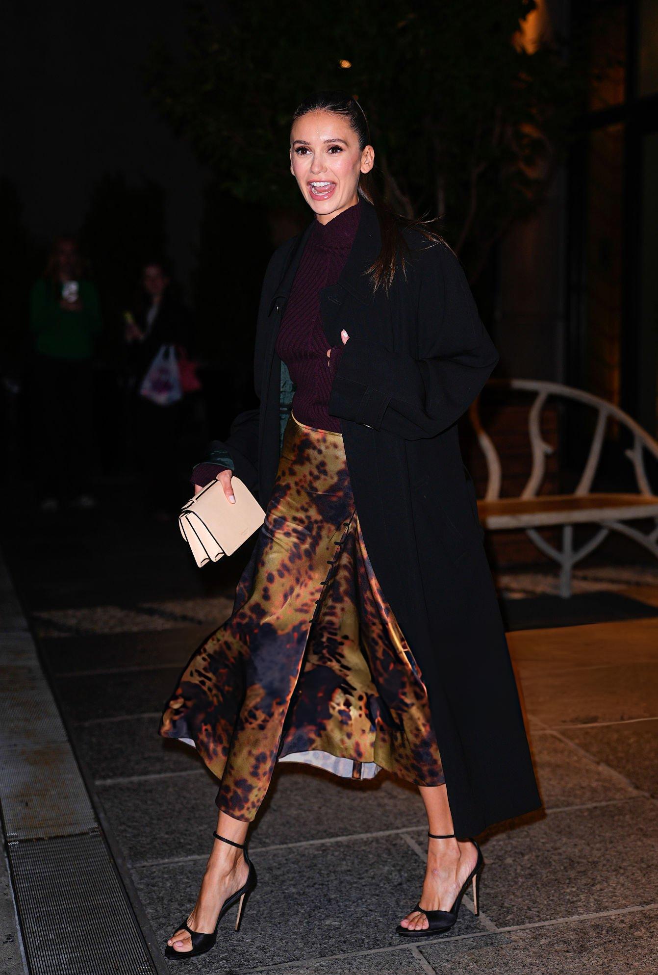 Nina Dobrev New York City images, photos and pictures. Nina is seen in satin, a long trench coat, high heels and a knitted top. She appears in a silk with satin maxi skirt at Crane Club.