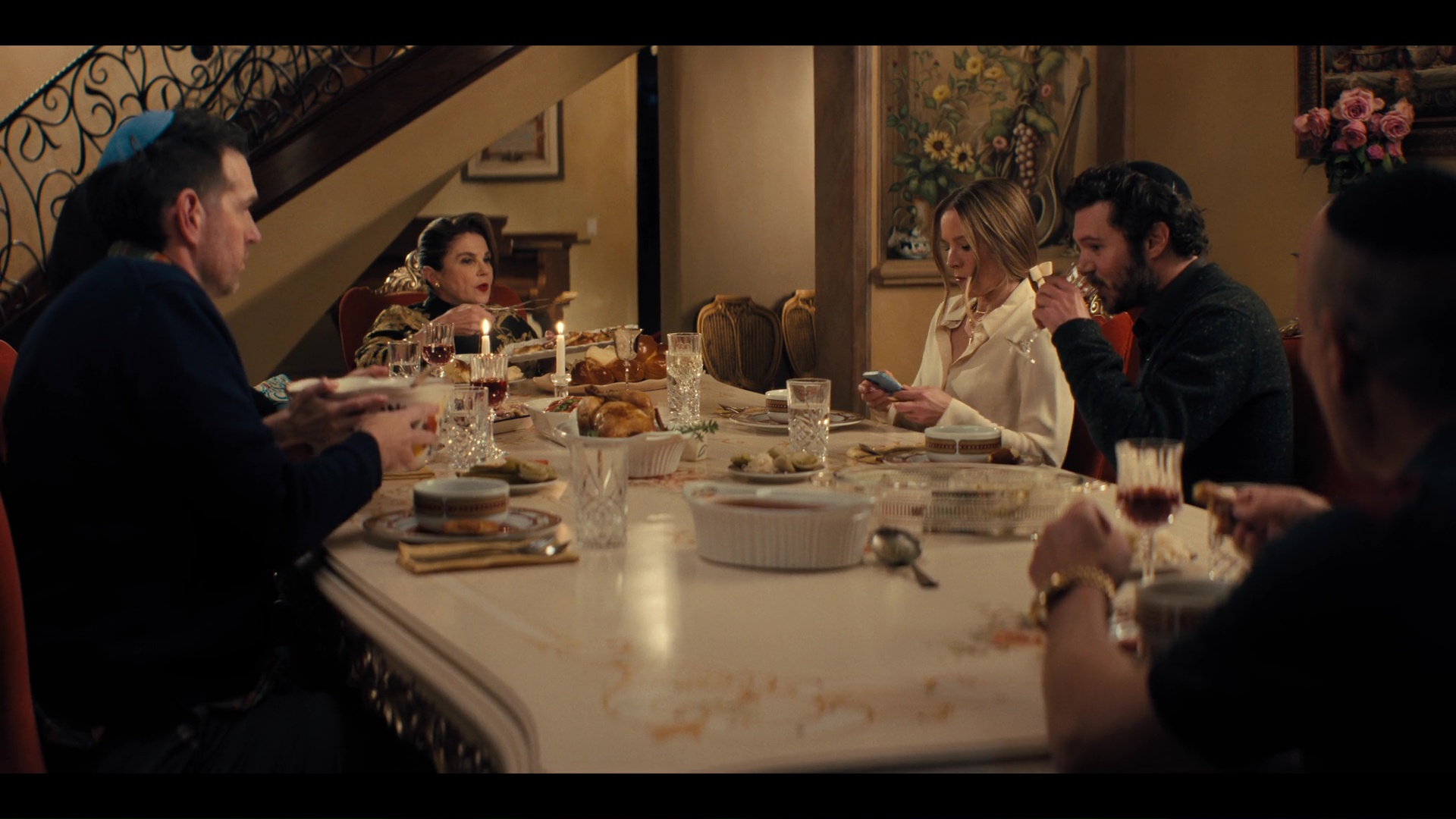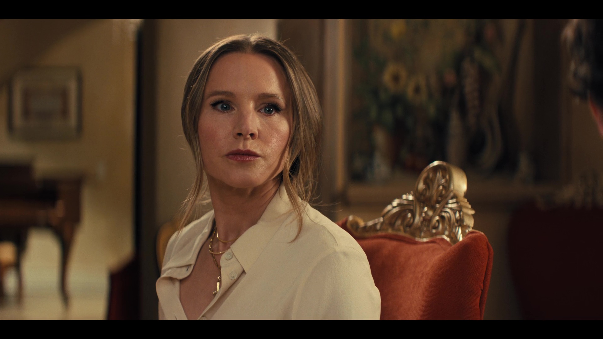 Screencaps from the Nobody Wants This season two episode “The Unethical Therapist”. Kristen Bell is seen in a sheen style blouse. She stars as the character Joanne on the Netflix series.