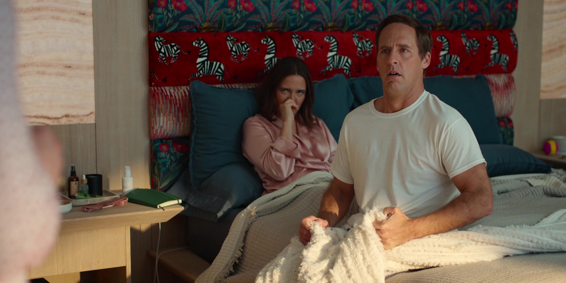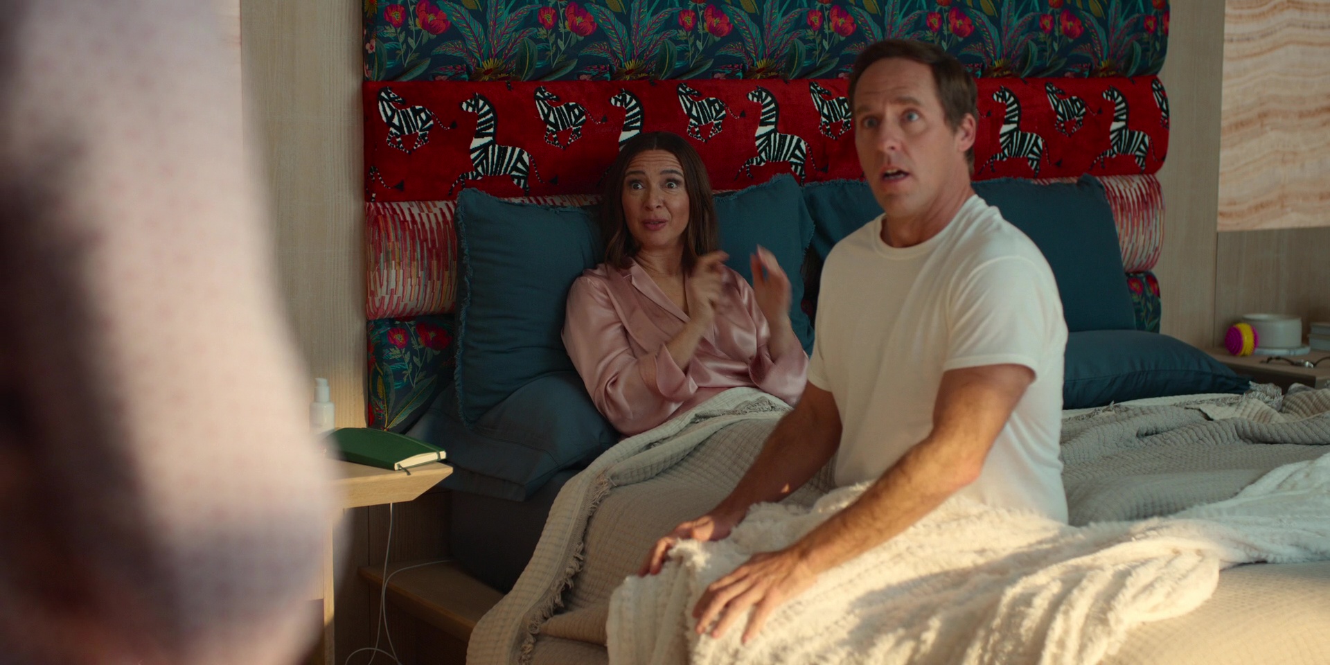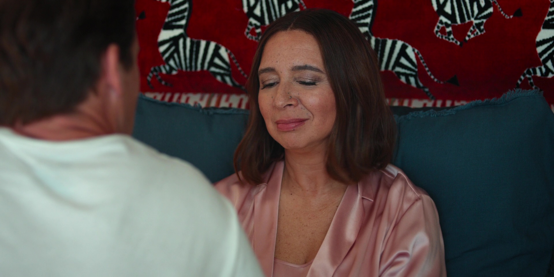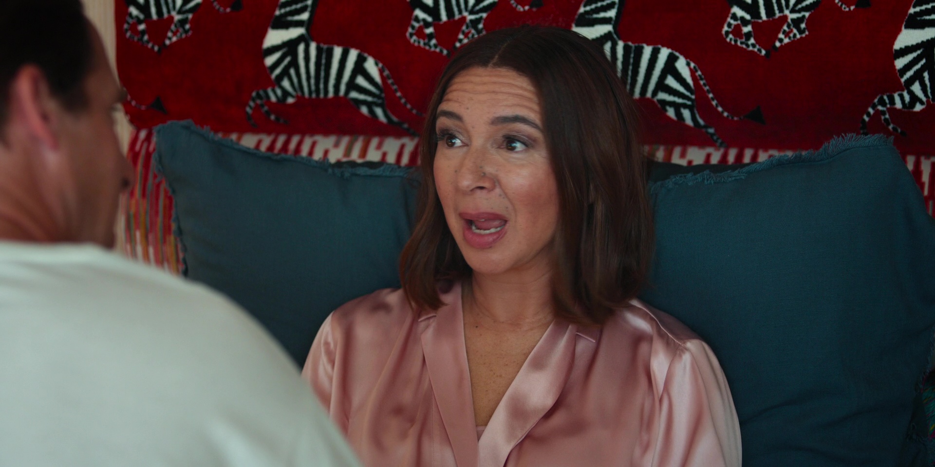 Loot screen caps from the third season of the comedy series. Maya Rudolph appears as the character Molly Wells. She wears a dark pink satin dressing gown and nightie in the episode “Would Hit”.