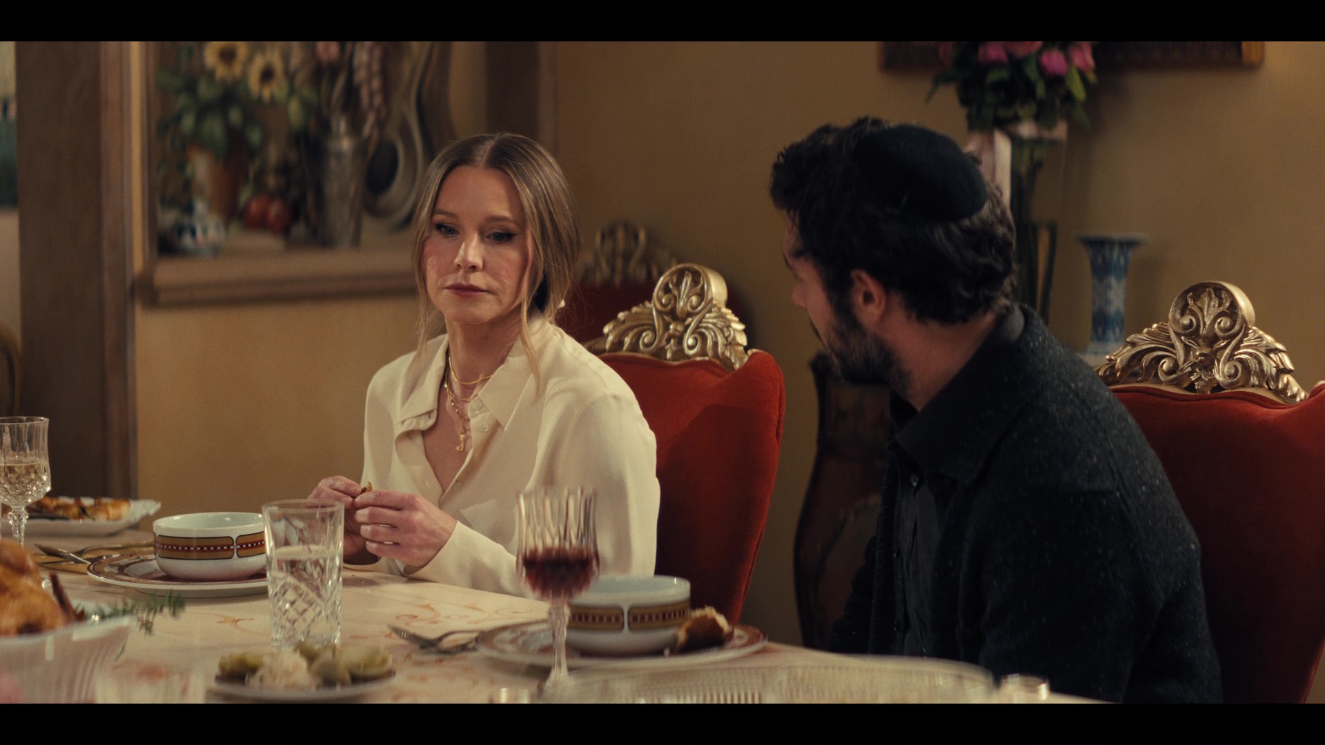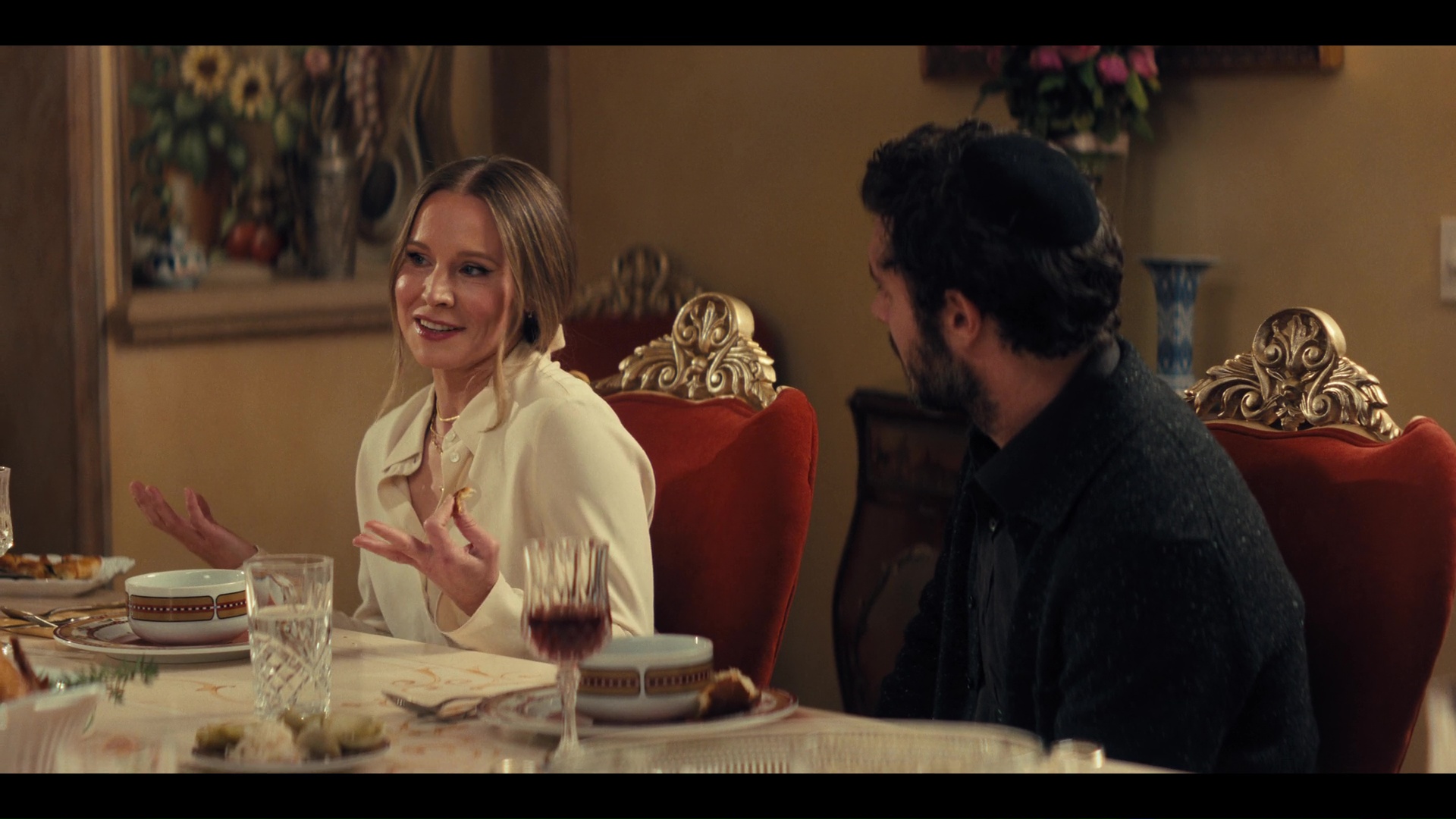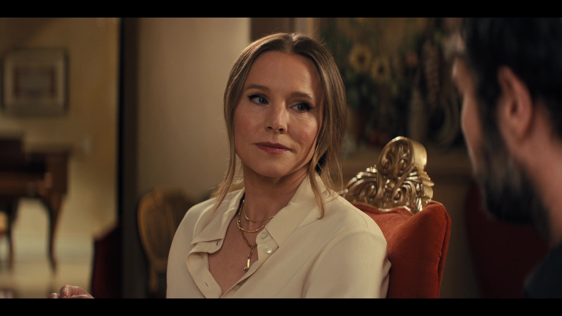 Nobody Wants This screencaps from the second season of the comedy show. Kristen Bell is seen as the character Joanne. She wears a long sleeve silk like shirt in the episode “The Unethical Therapist”.