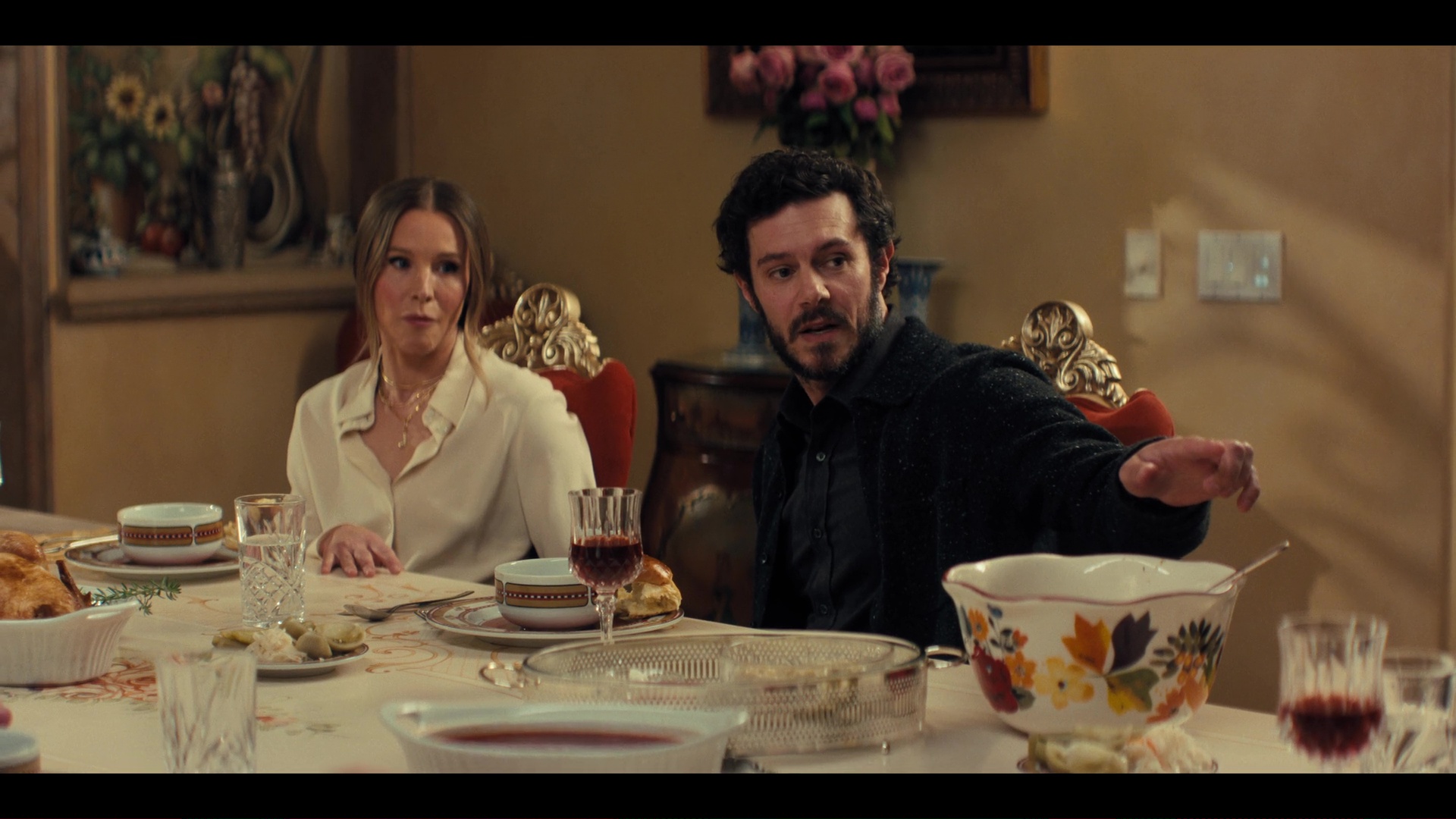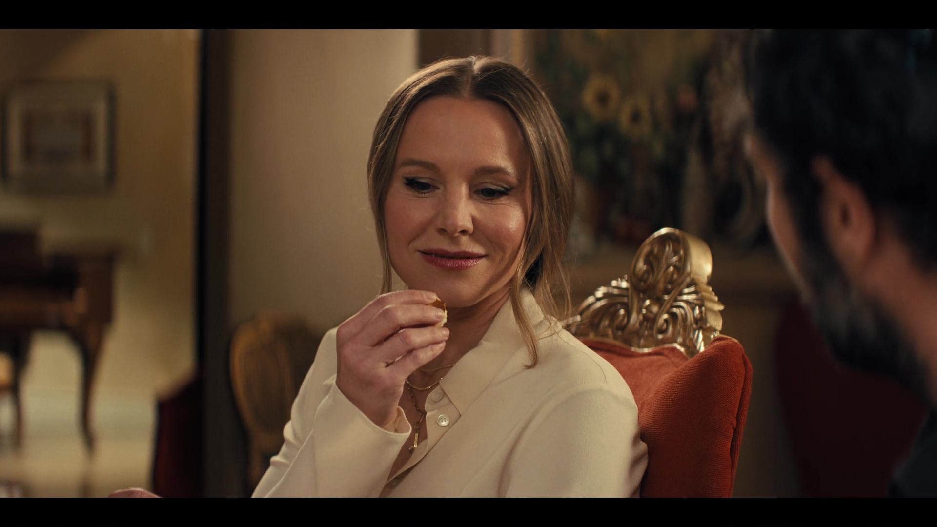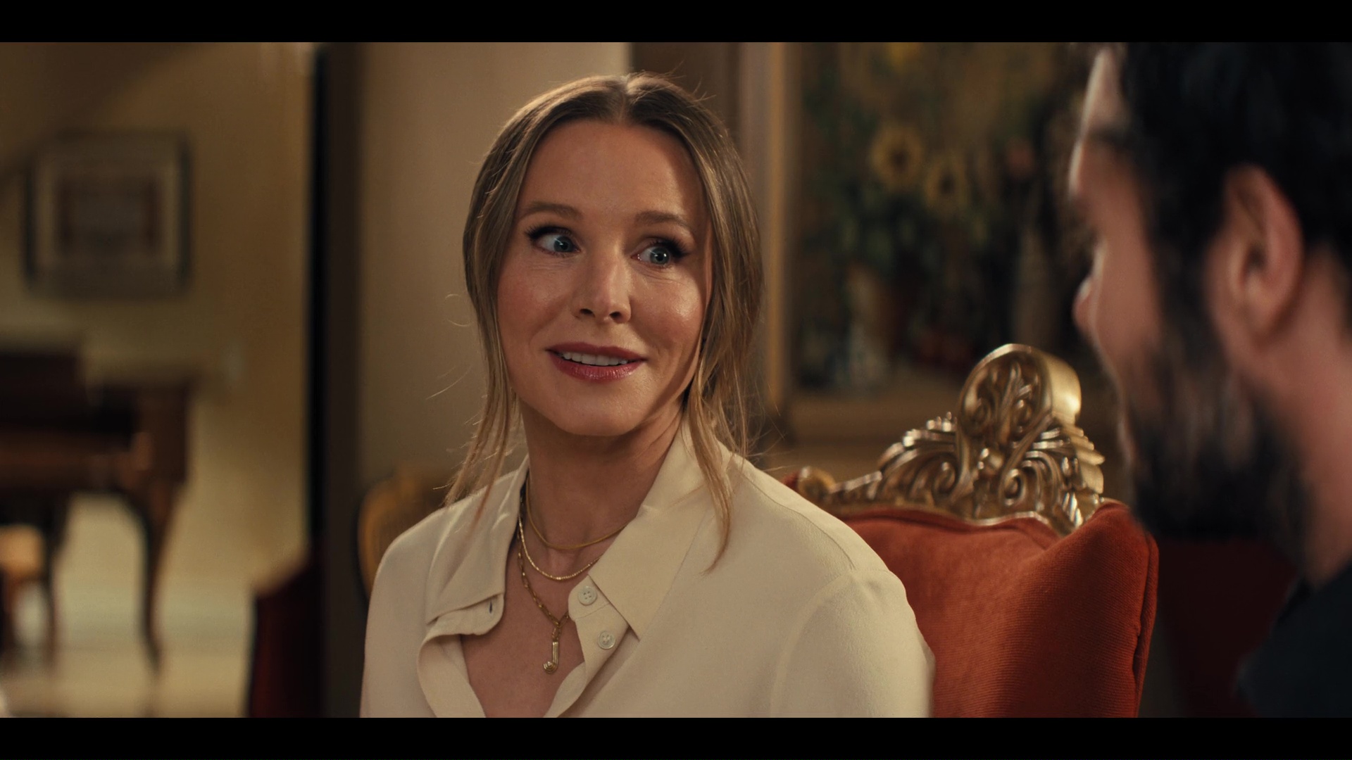 Nobody Wants This screencaps from the second season of the comedy show. Kristen Bell is seen as the character Joanne. She wears a long sleeve silk like shirt in the episode “The Unethical Therapist”.