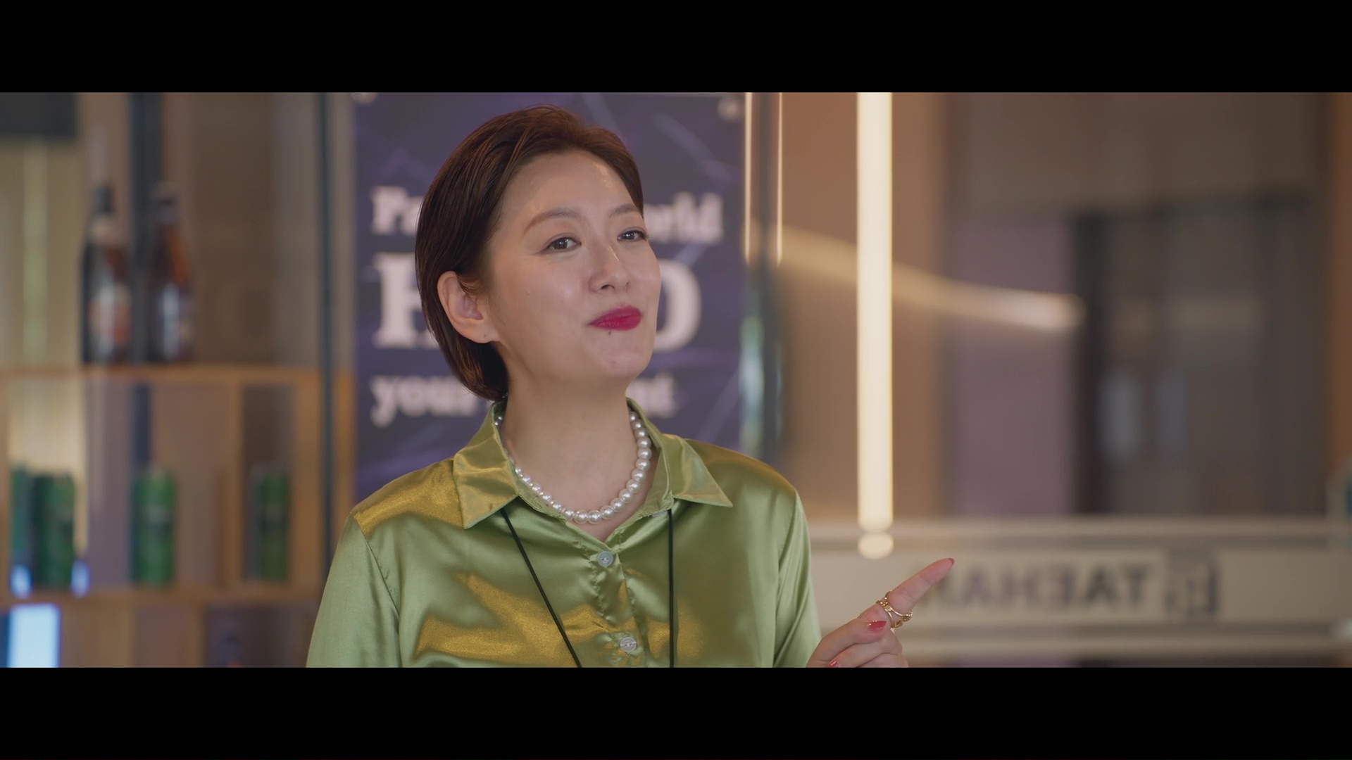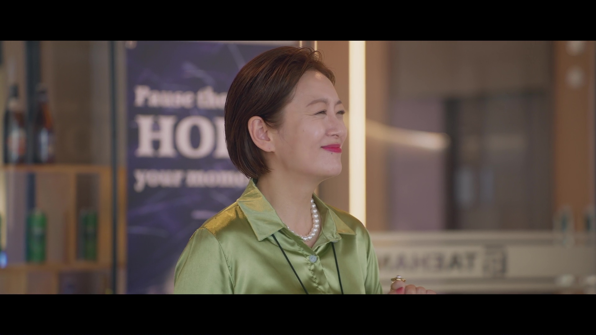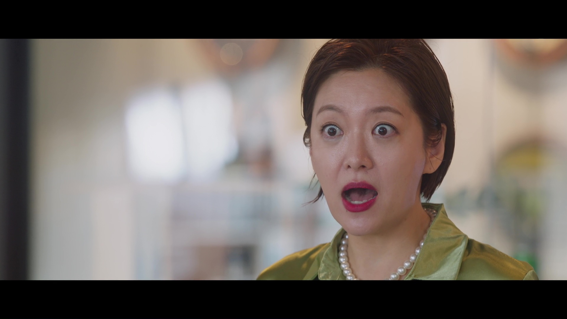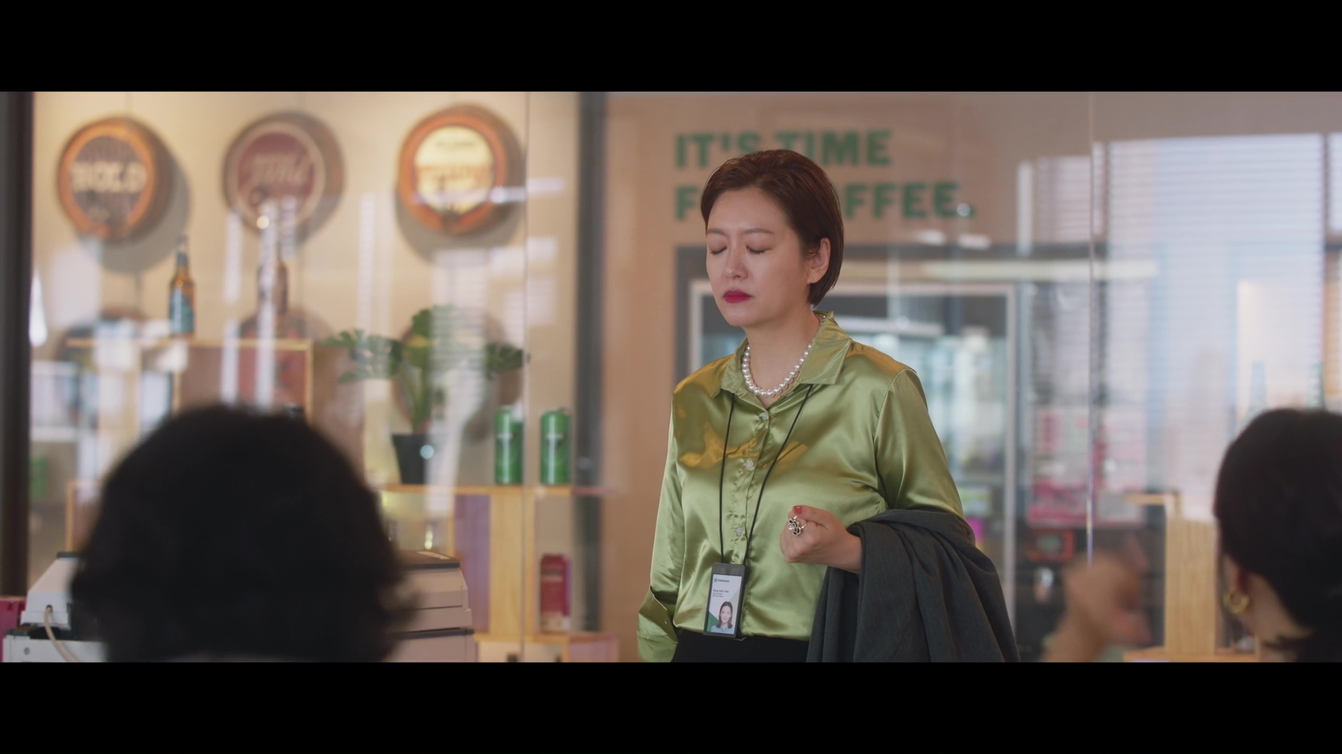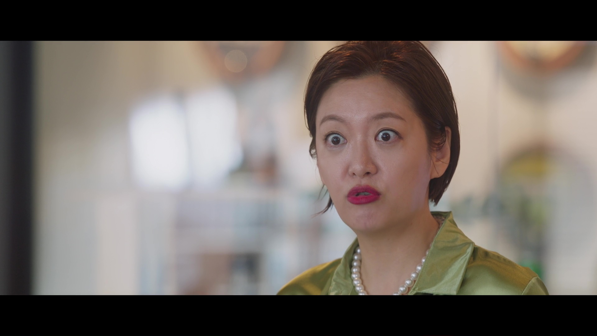 Screencaps from the sixth episode of Positively Yours. Jung Soo-young wears a lime green silk and satin blouse. An actress is seen in a forest green satin shirt and a matching pair of green silk trousers.