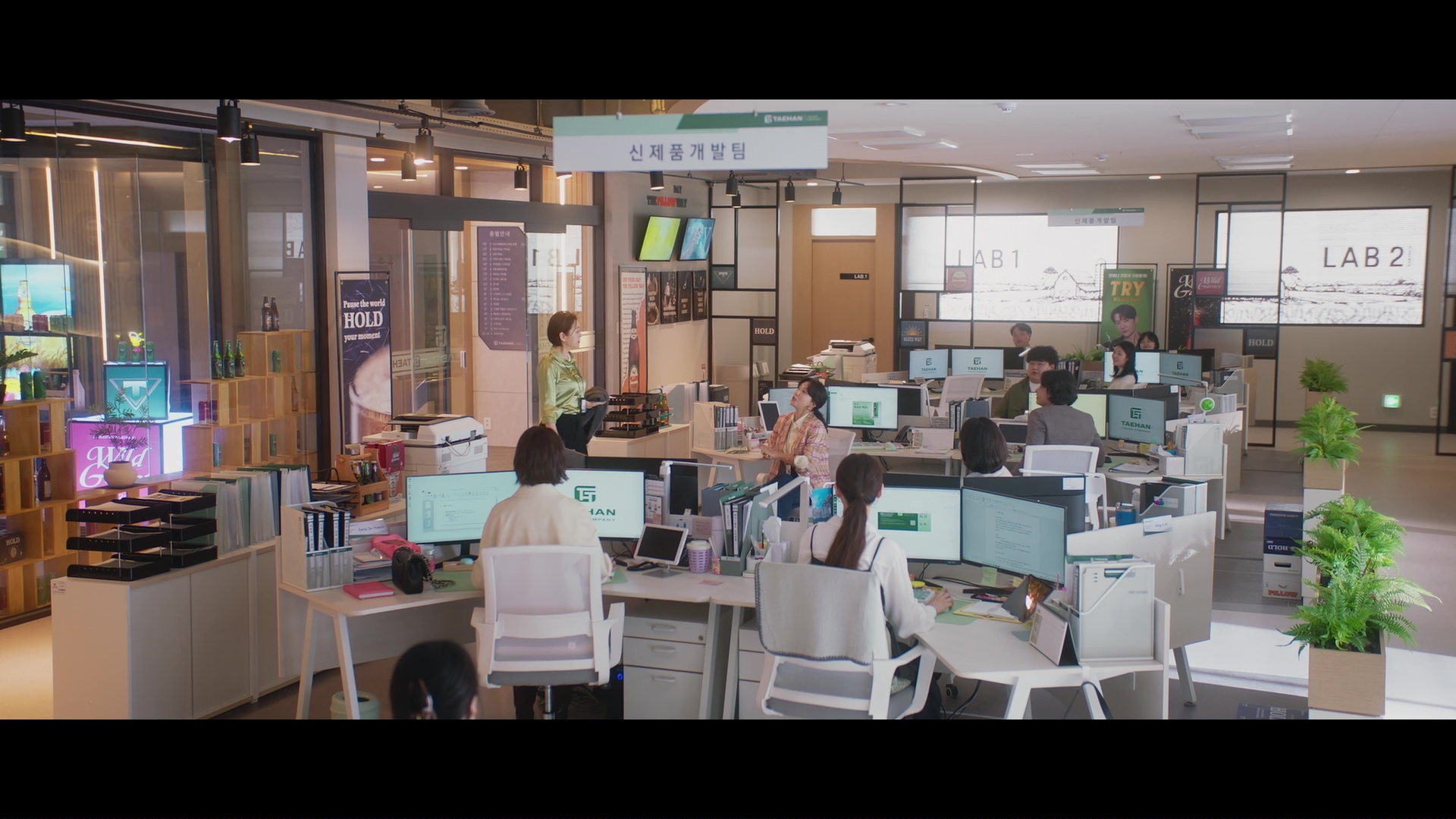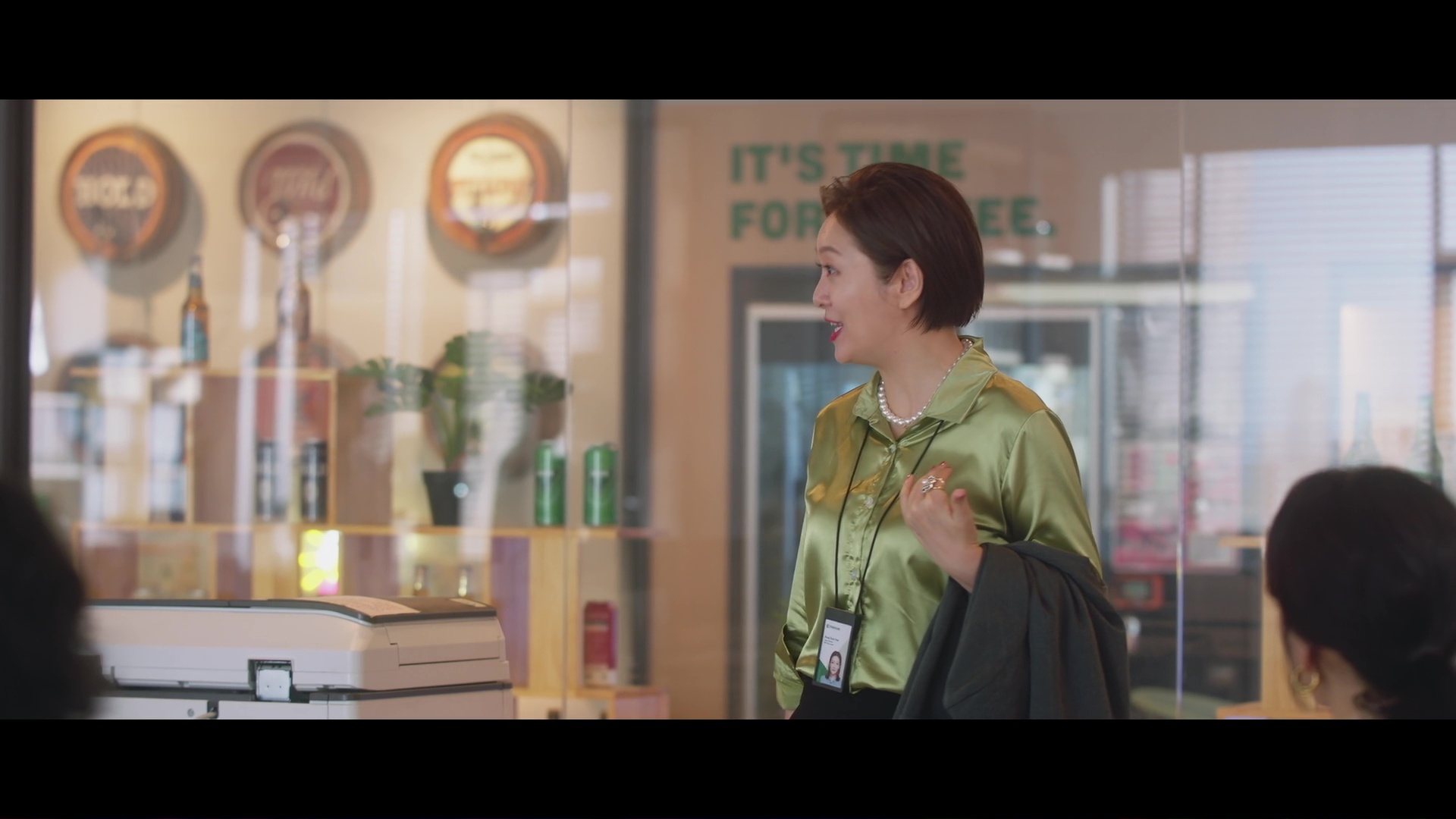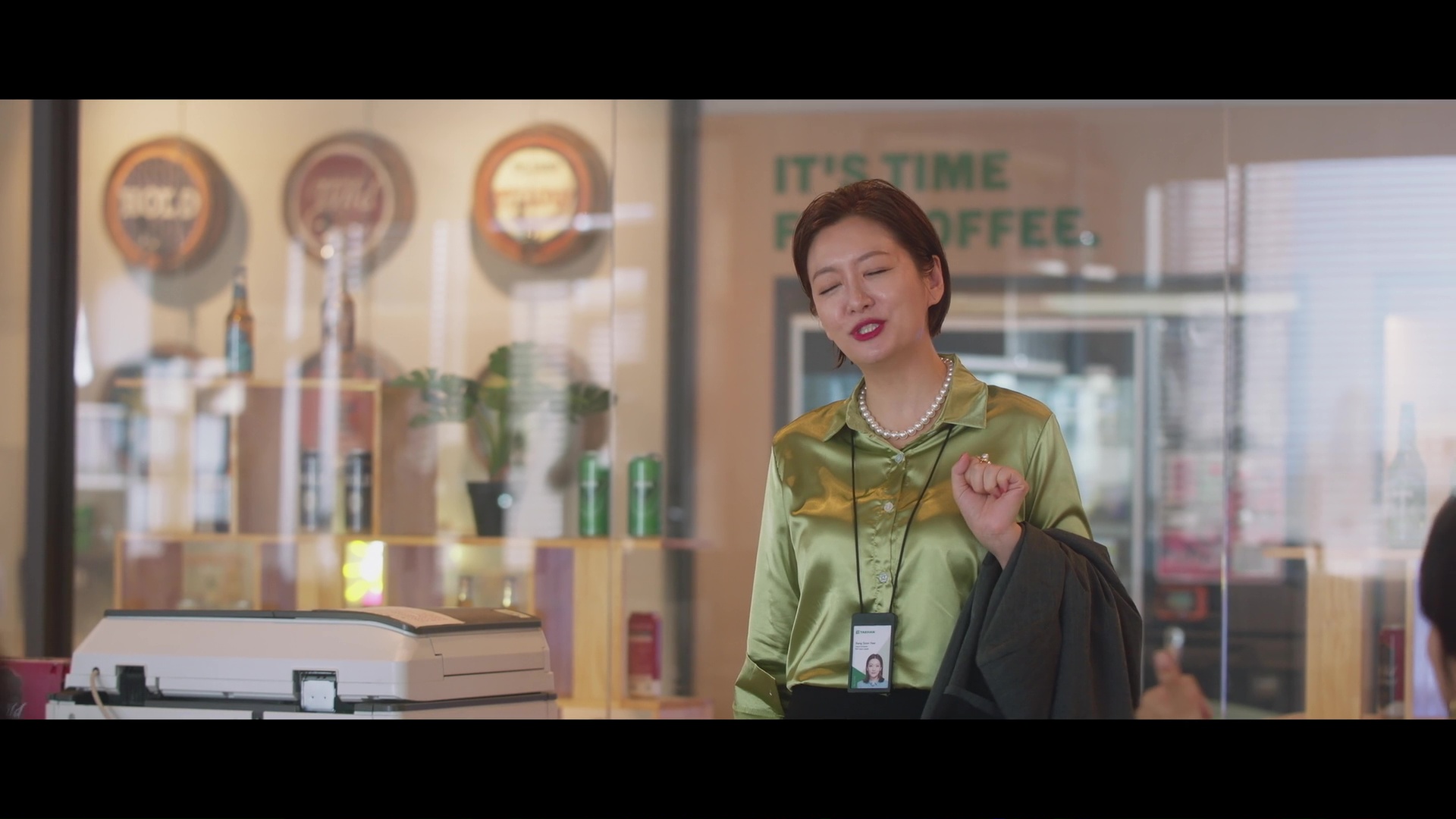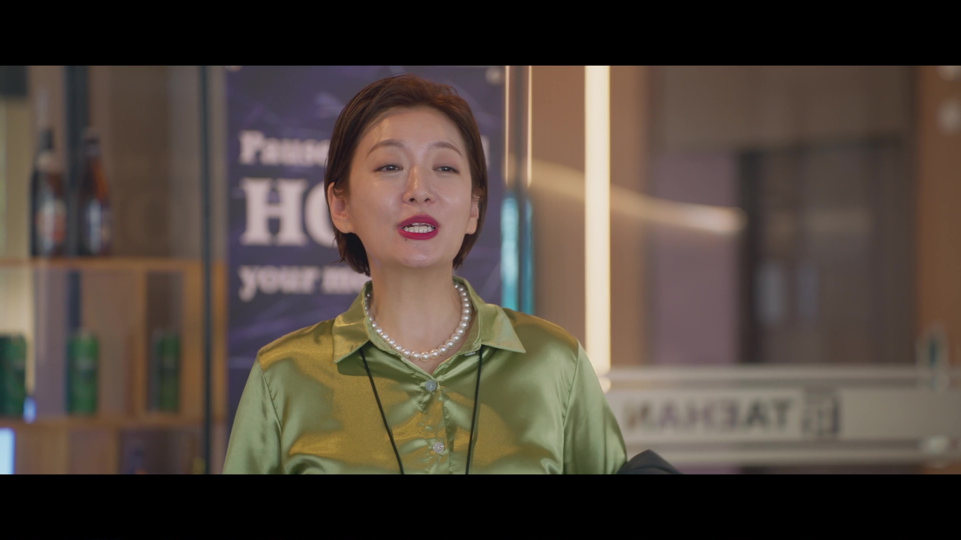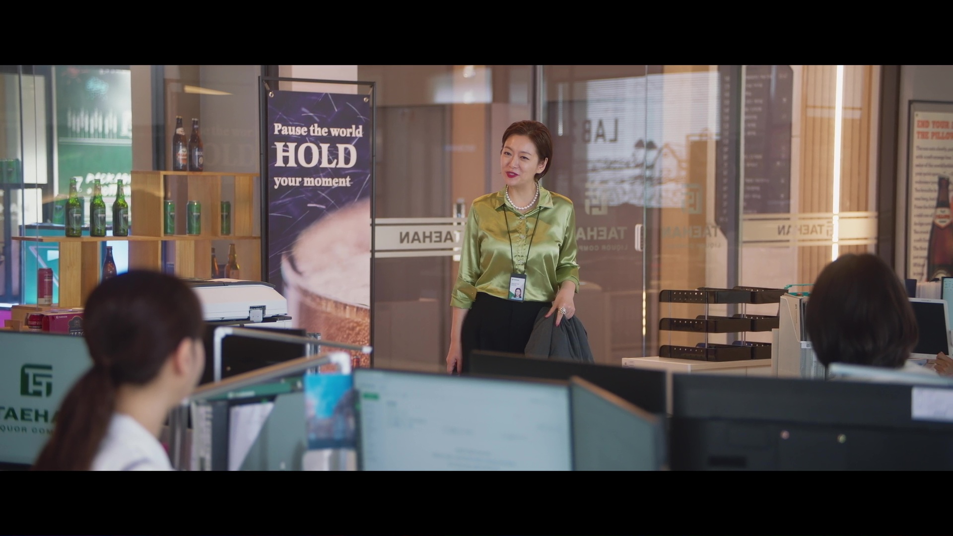 Screencaps from the sixth episode of Positively Yours. Jung Soo-young wears a lime green silk and satin blouse. An actress is seen in a forest green satin shirt and a matching pair of green silk trousers.