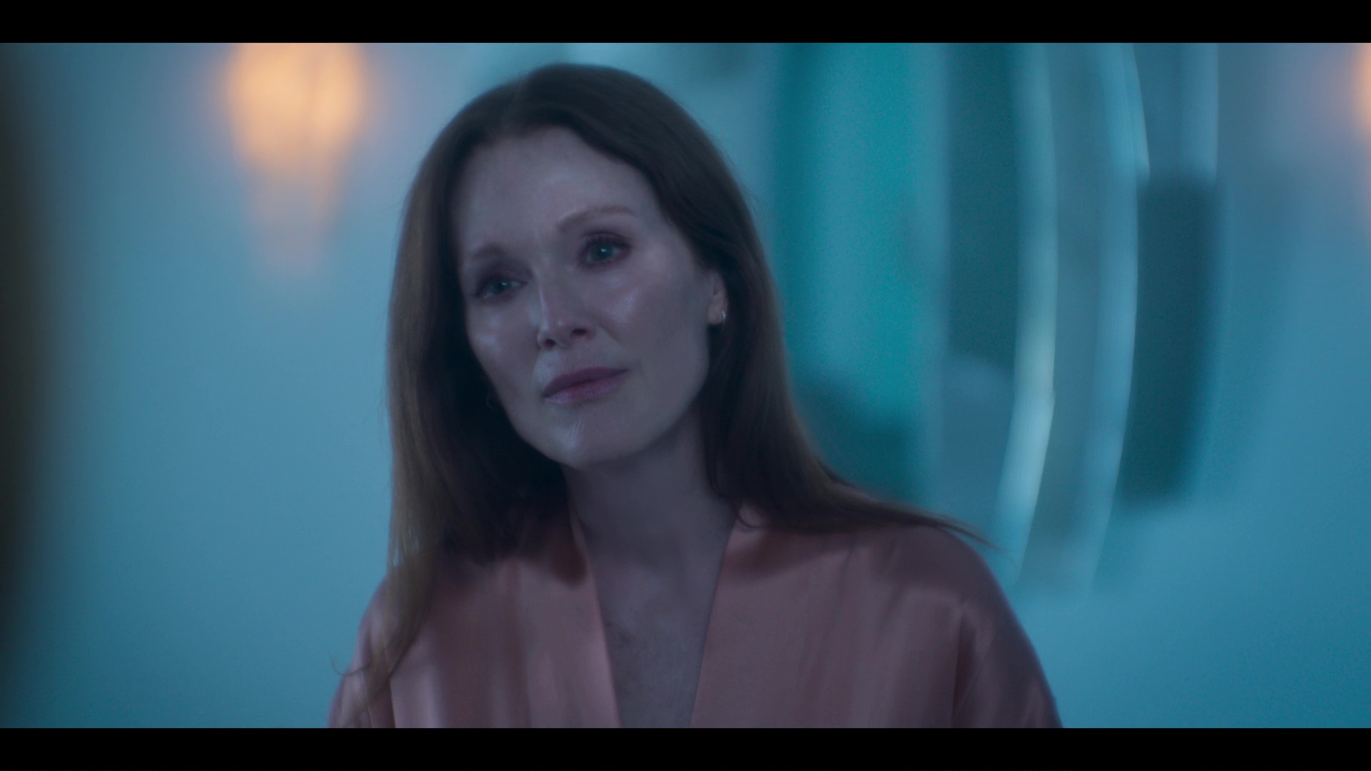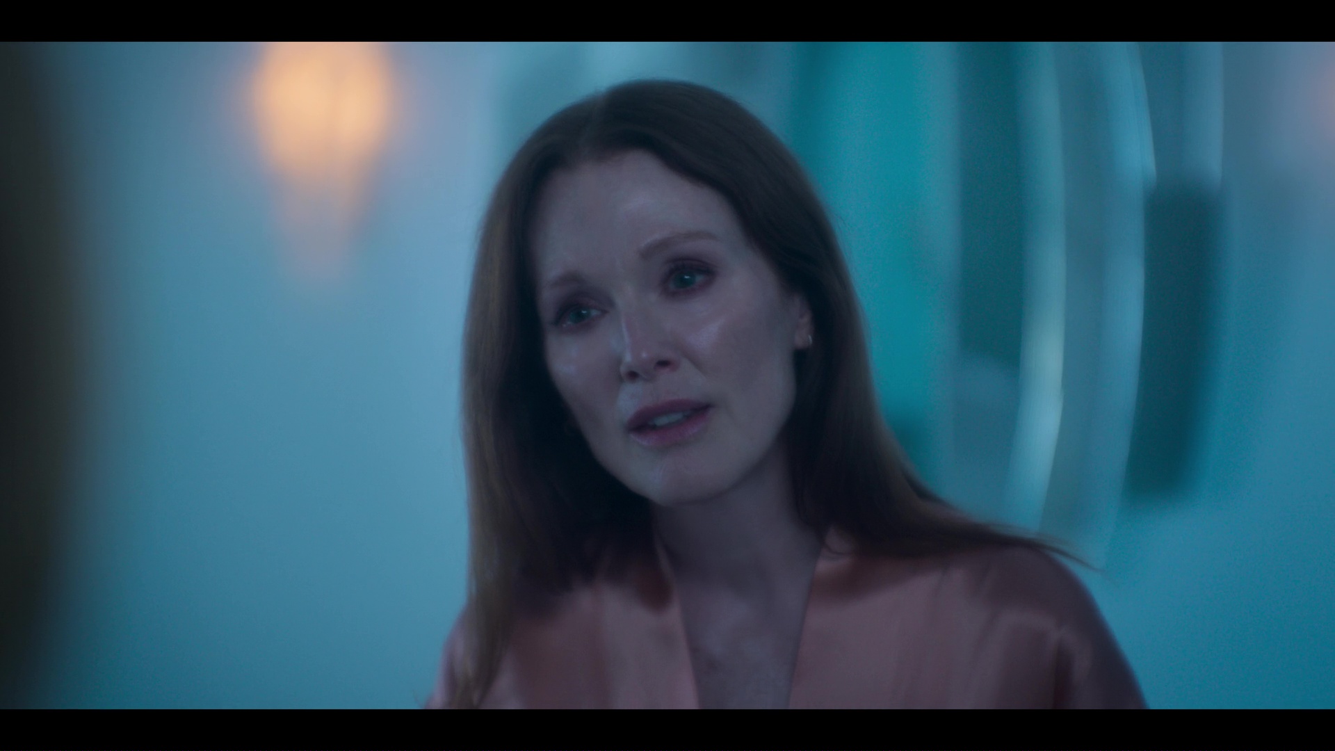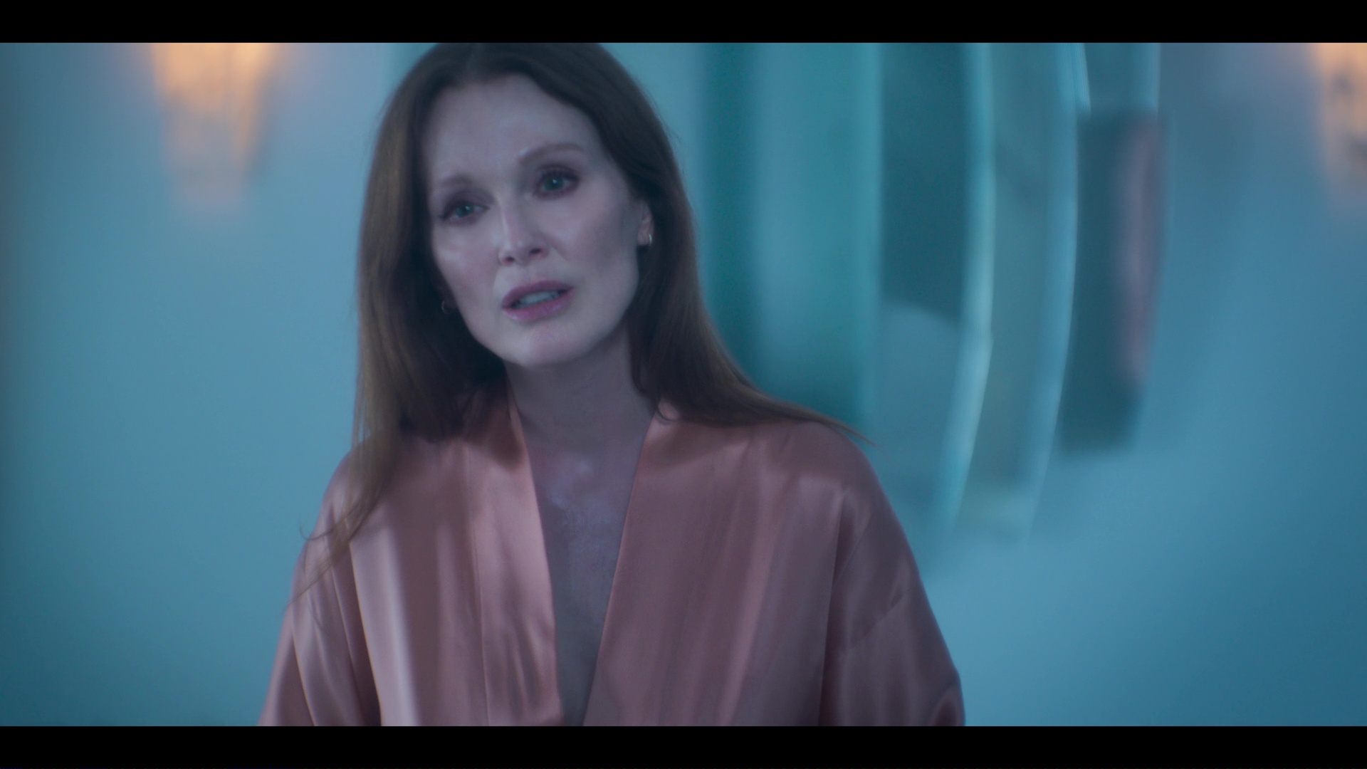 Sirens Monster 2Sirens screencaps from the episode “Monster”. Julianne Moore stars as the character Michaela Kell in the Netflix television series. She wears a long dark peach satin dressing gown.Satiny – Television – Sirens – Monster 1Page 1 2
