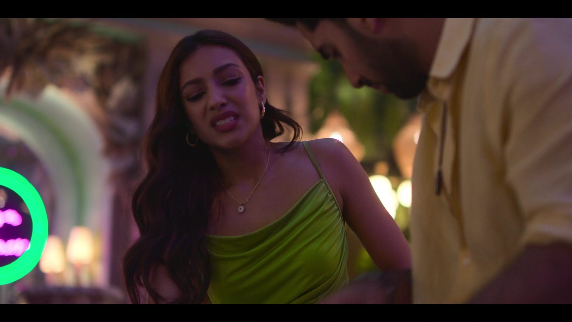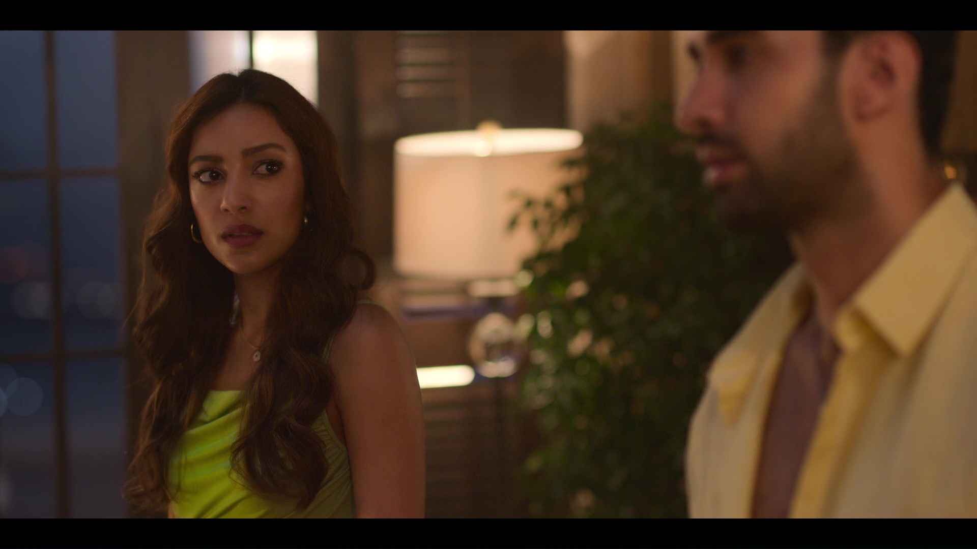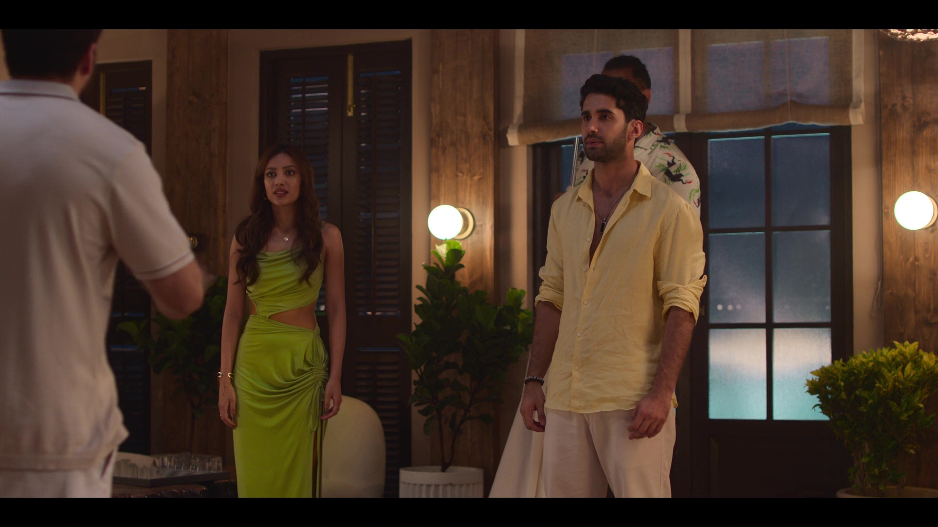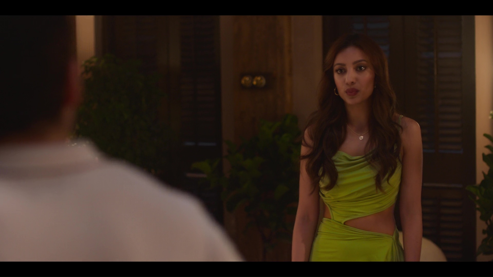 The Ba***ds Of Bollywood screencaps from the epsidoe “Barbaad Mohabbat”. Sahher Bambba is seen as the character Karishma Talwar in the show. She wears a ruched light green silk like dress.