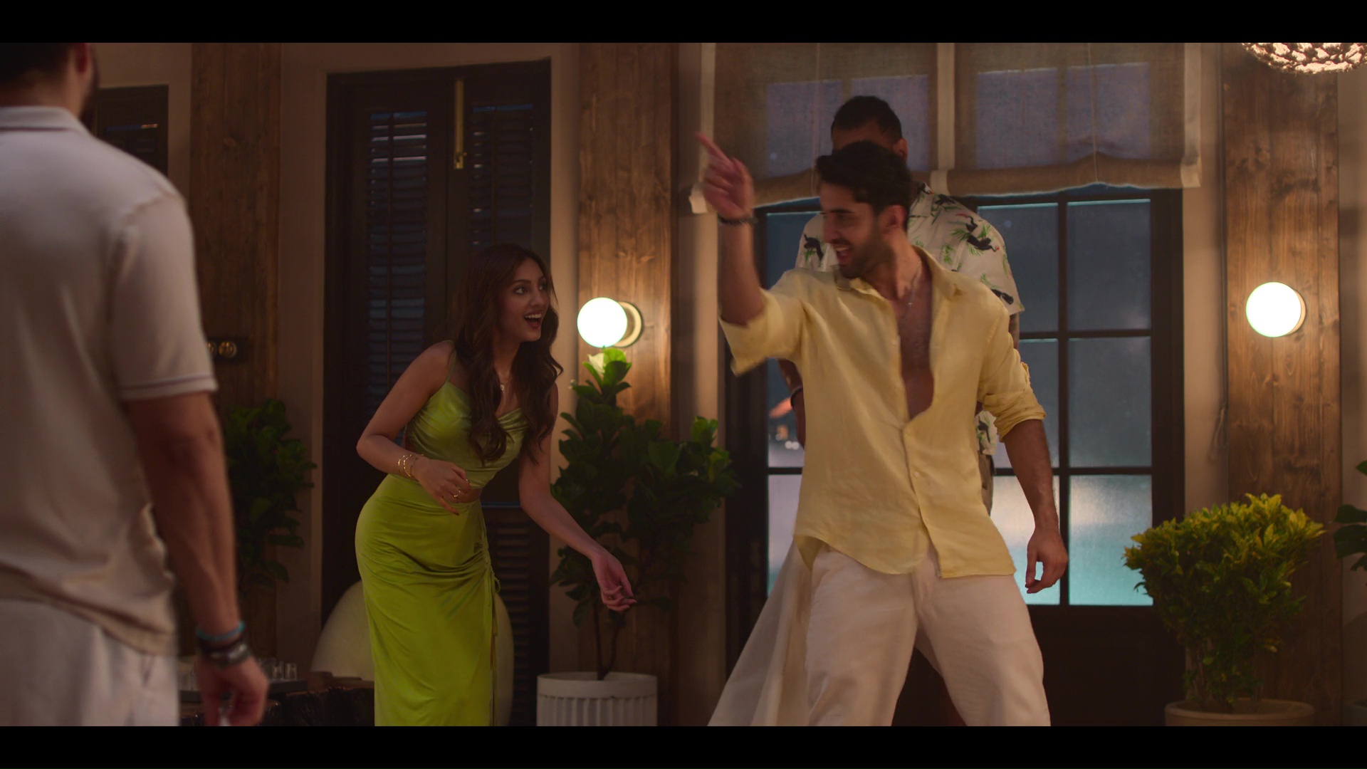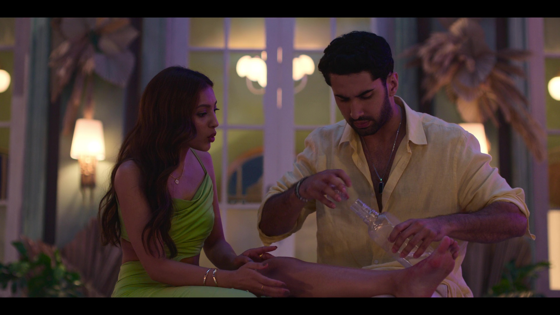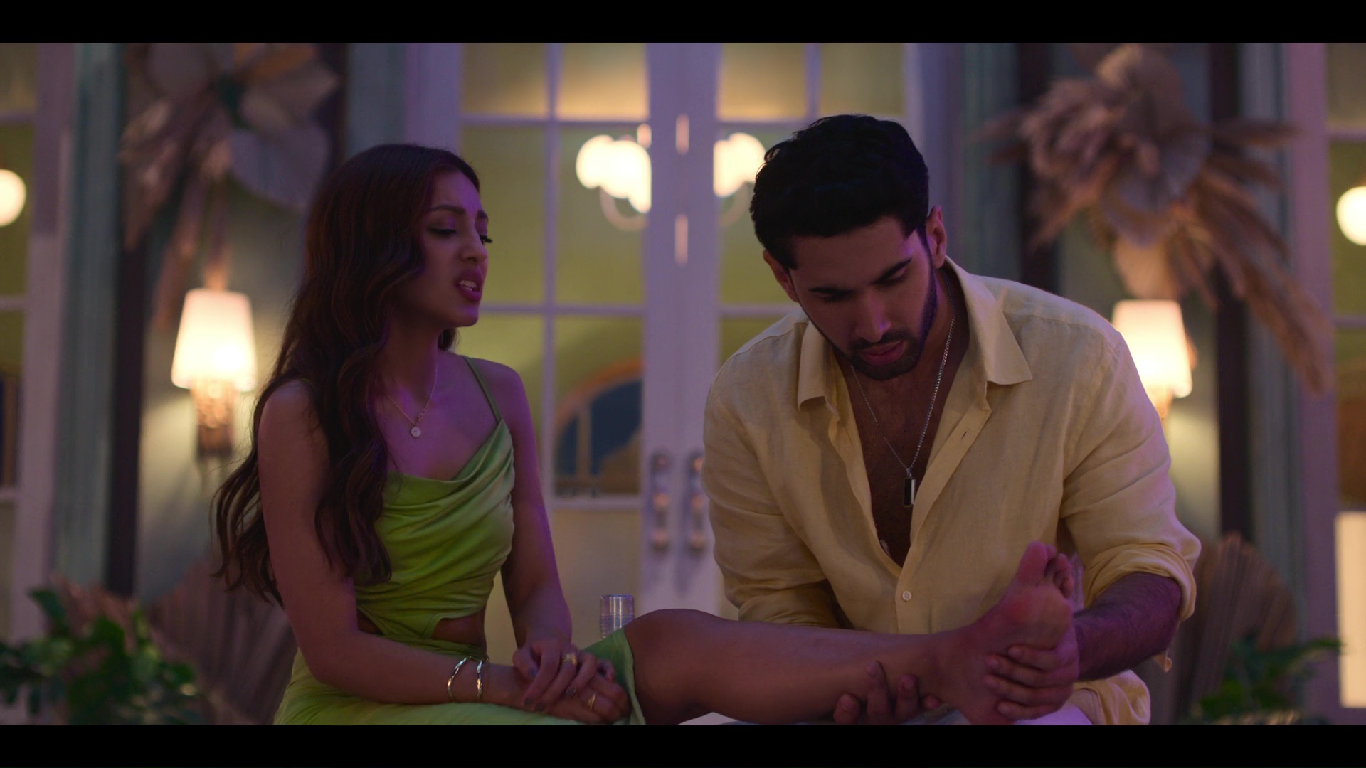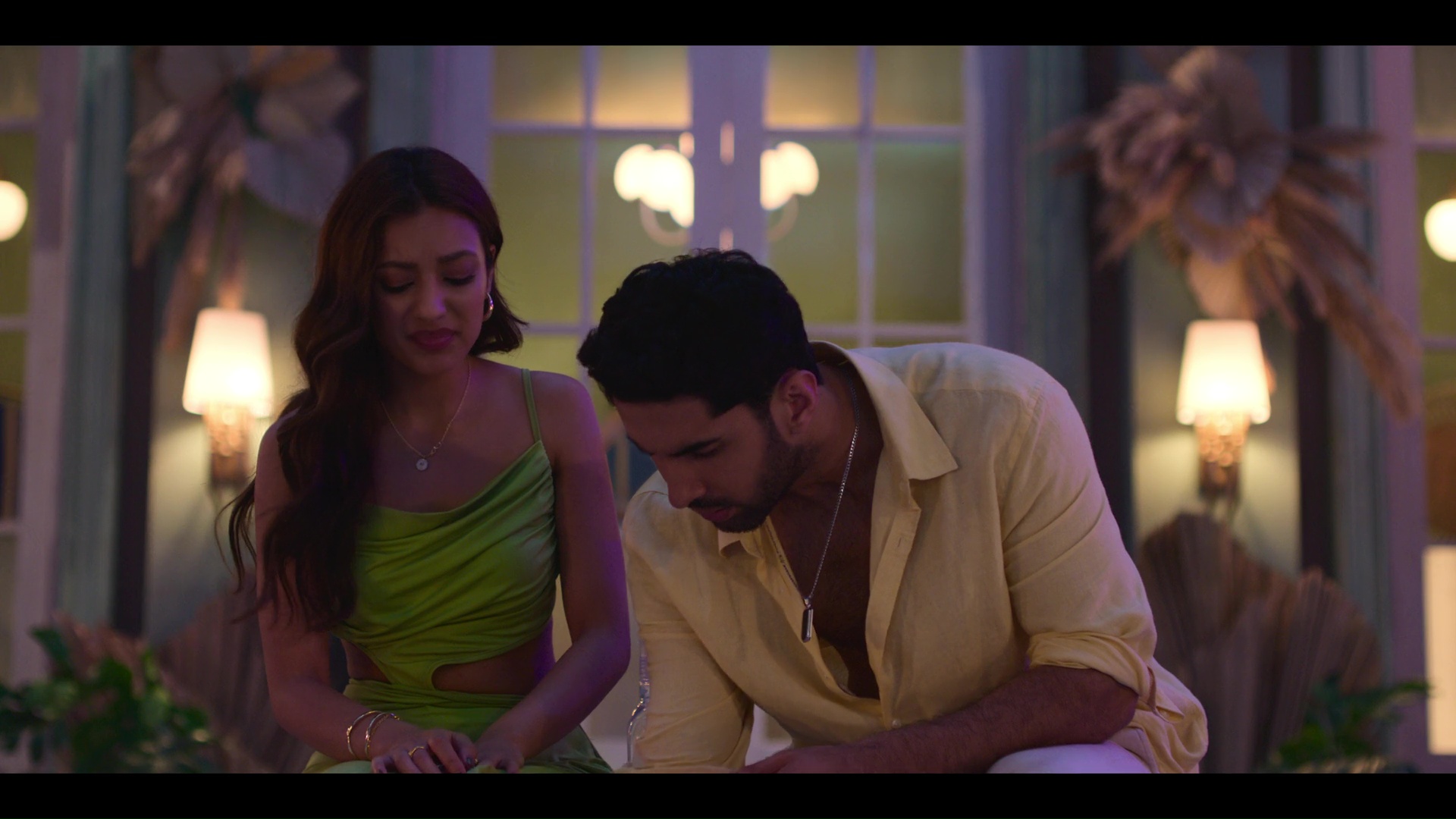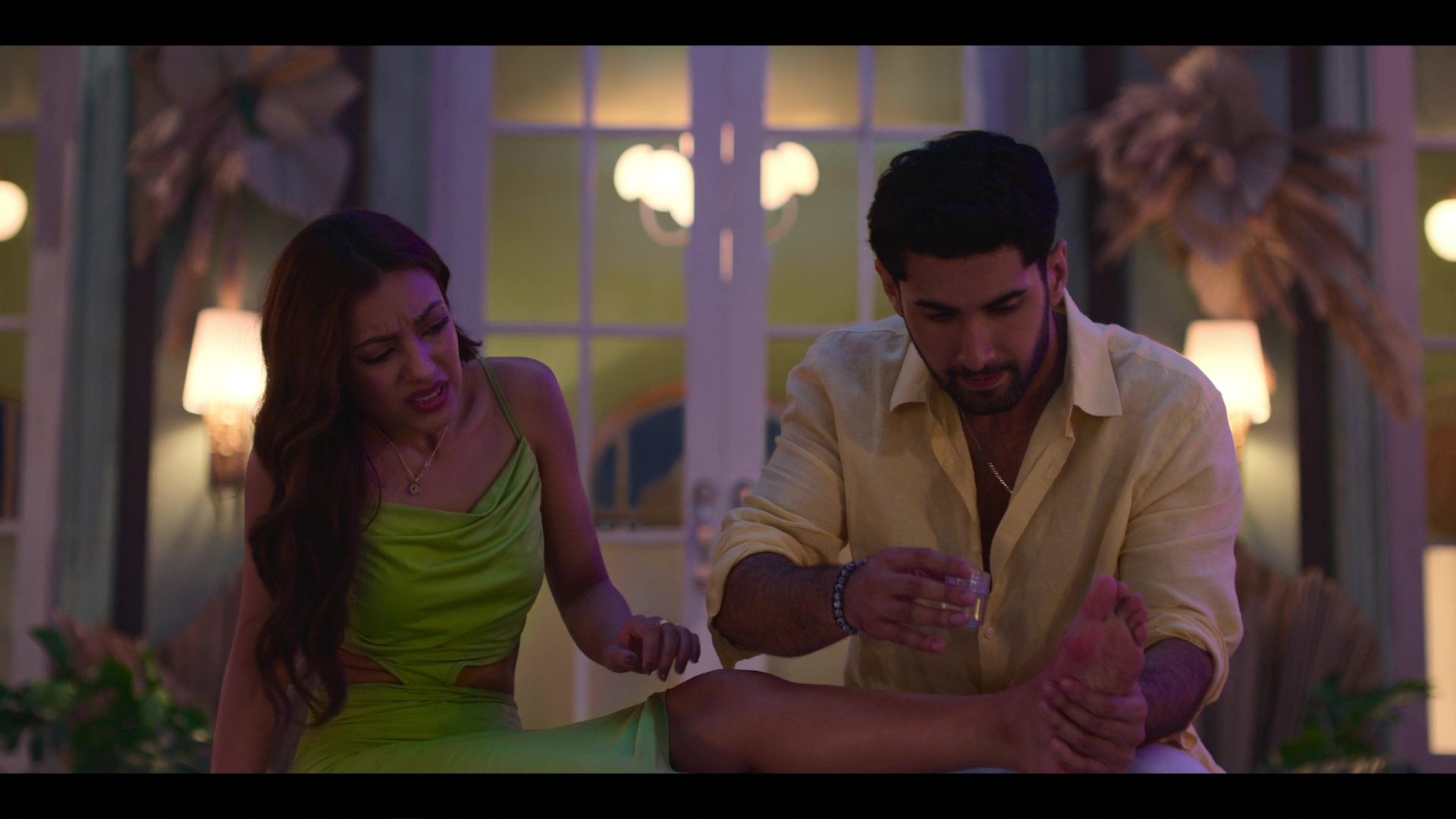 The Ba***ds Of Bollywood screencaps from the epsidoe “Barbaad Mohabbat”. Sahher Bambba is seen as the character Karishma Talwar in the show. She wears a ruched light green silk like dress.