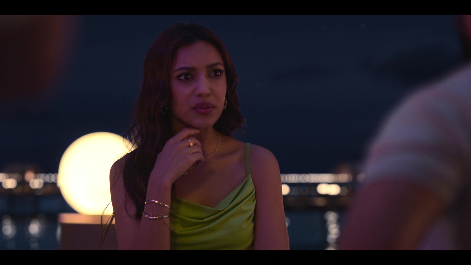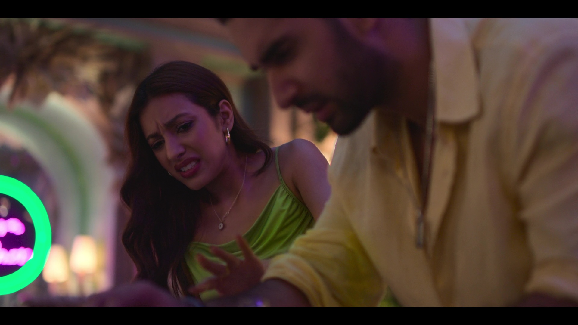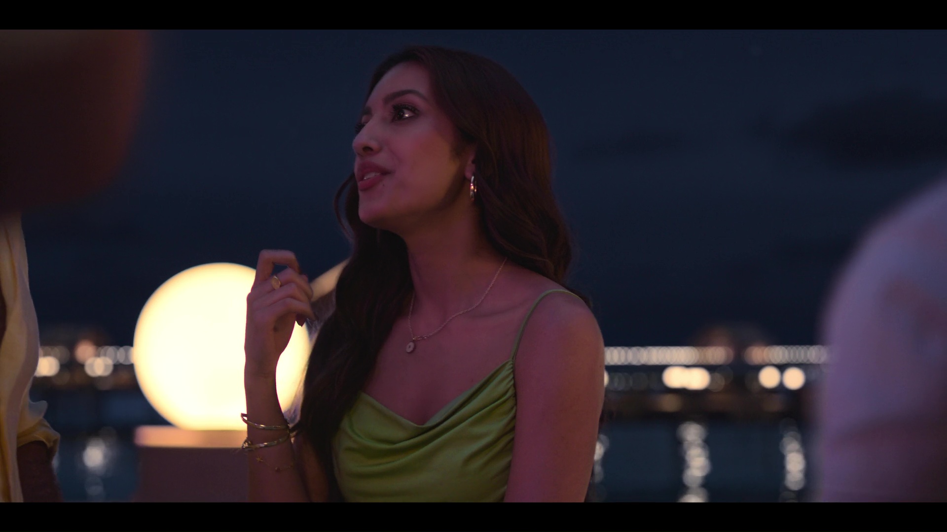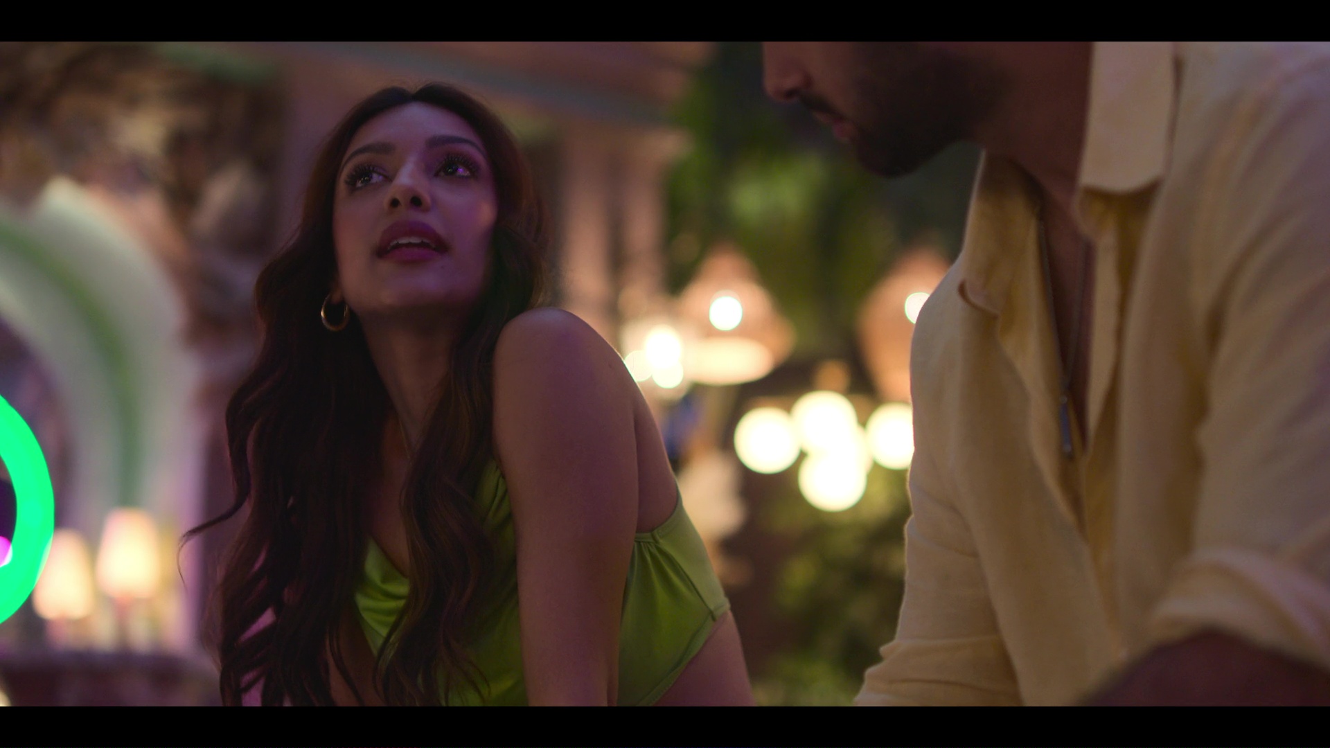 The Ba***ds Of Bollywood screencaps from the epsidoe “Barbaad Mohabbat”. Sahher Bambba is seen as the character Karishma Talwar in the show. She wears a ruched light green silk like dress.