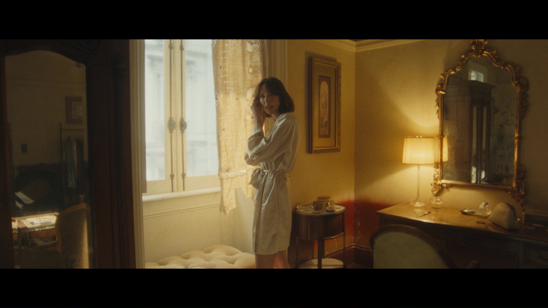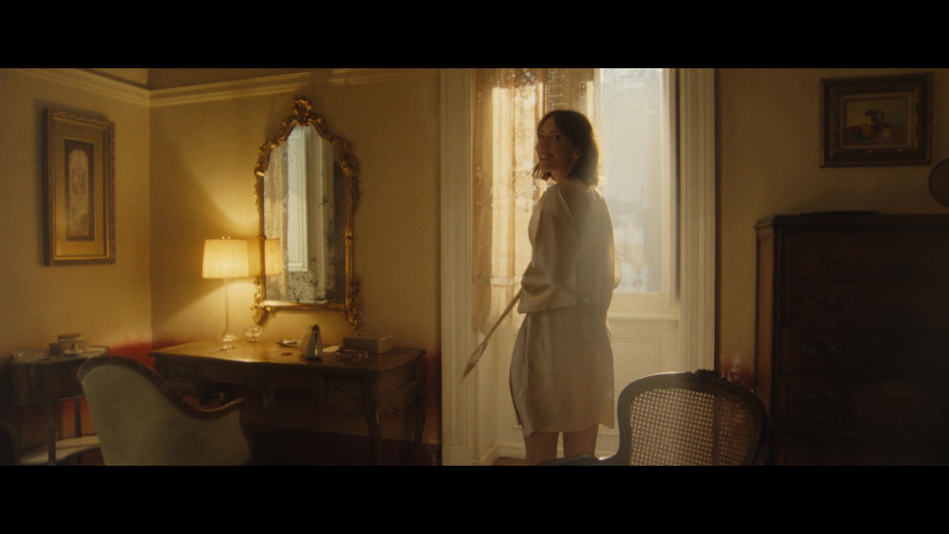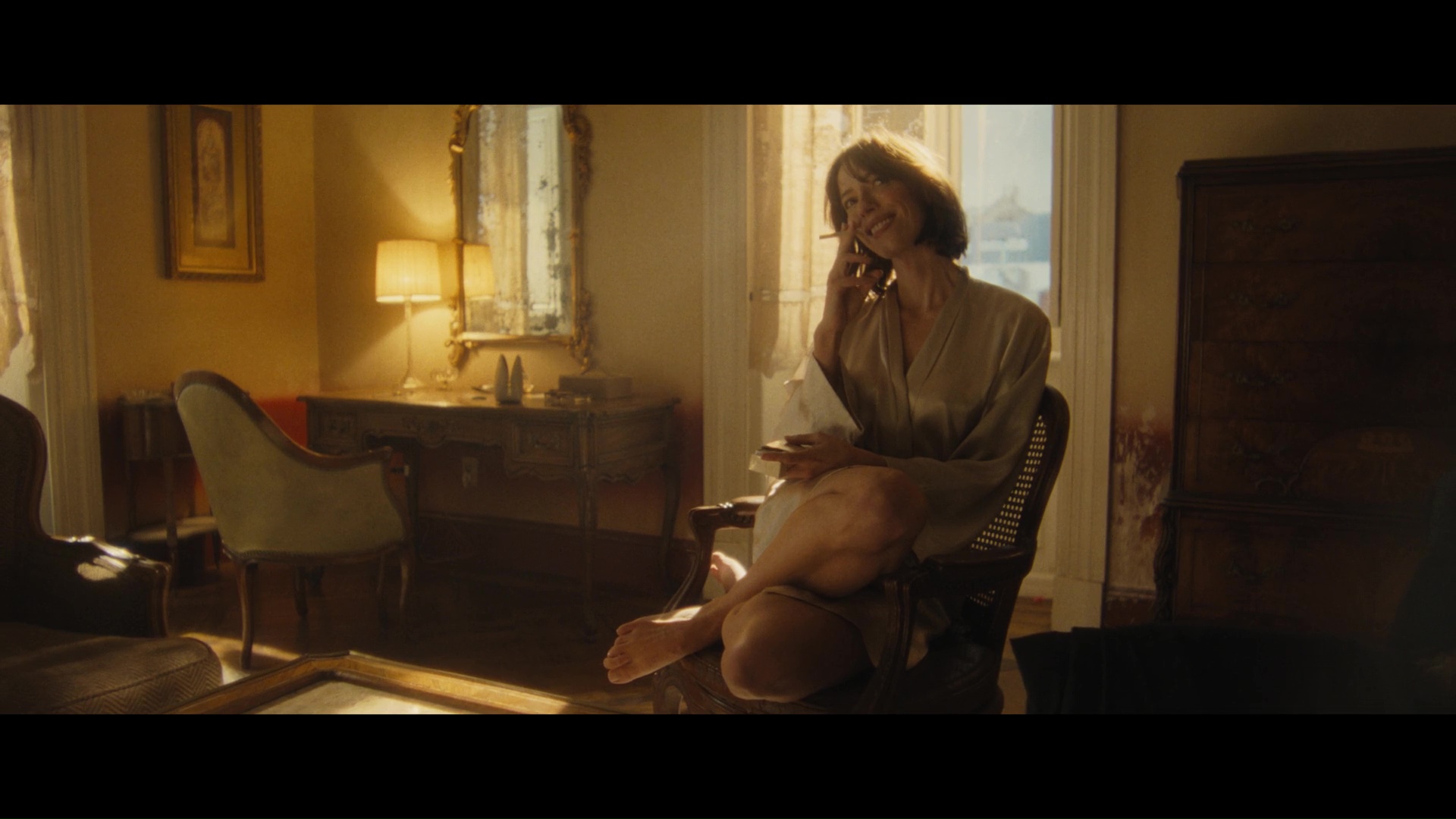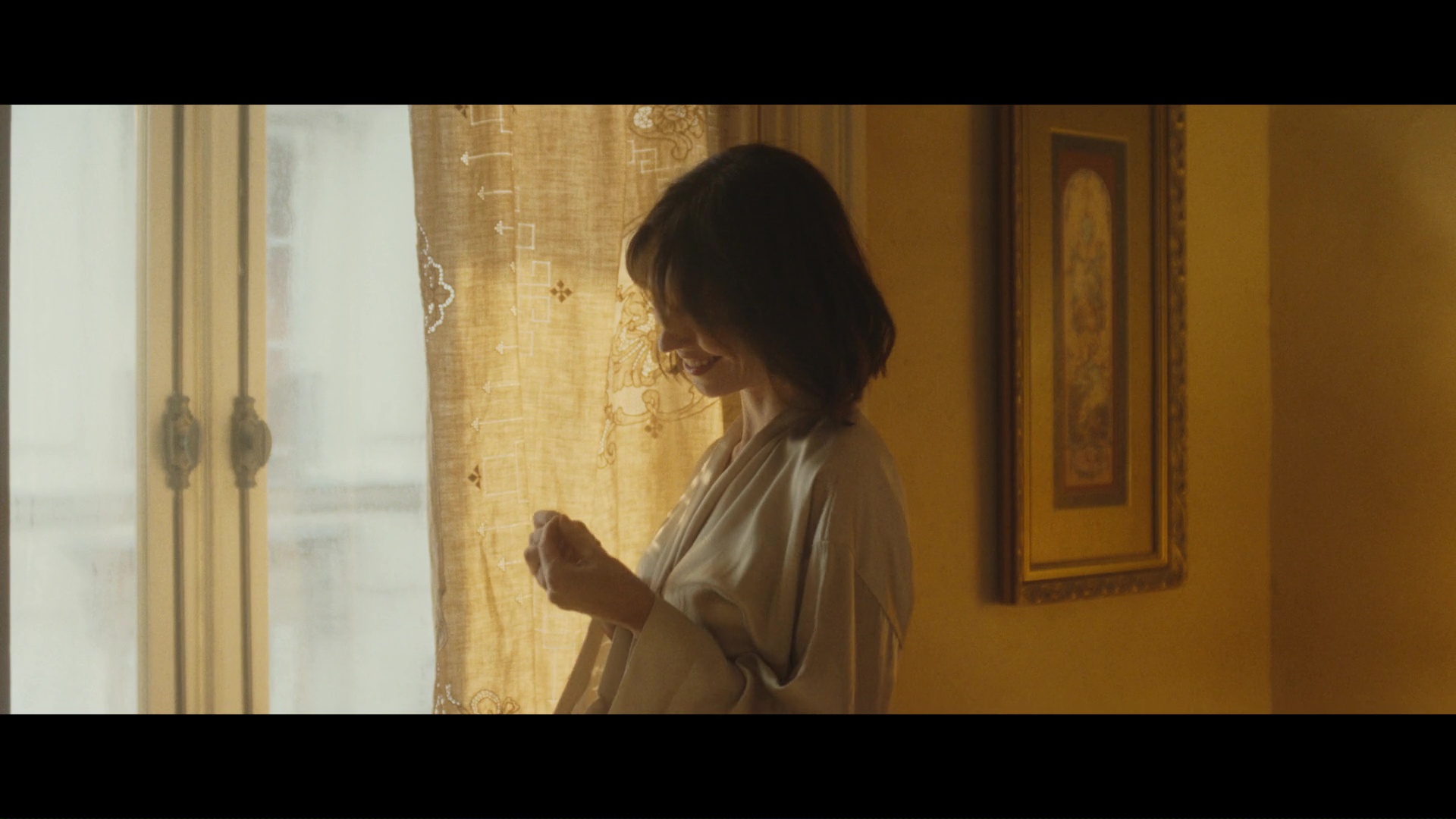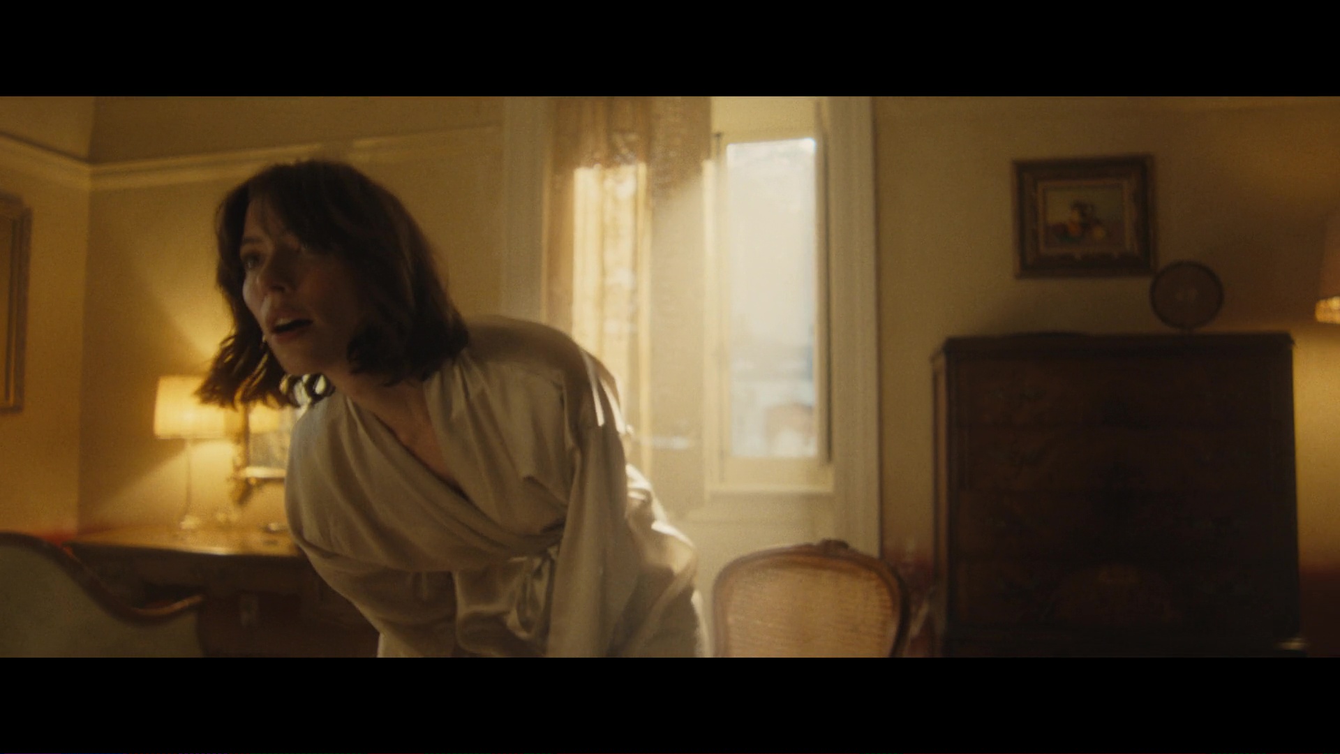 Screencaps from The Beauty episode “Beautiful Pilot”. Rebecca Hall is seen as the character Jordan Bennett in the science fiction series. She wears a light gold satin dressing gown.