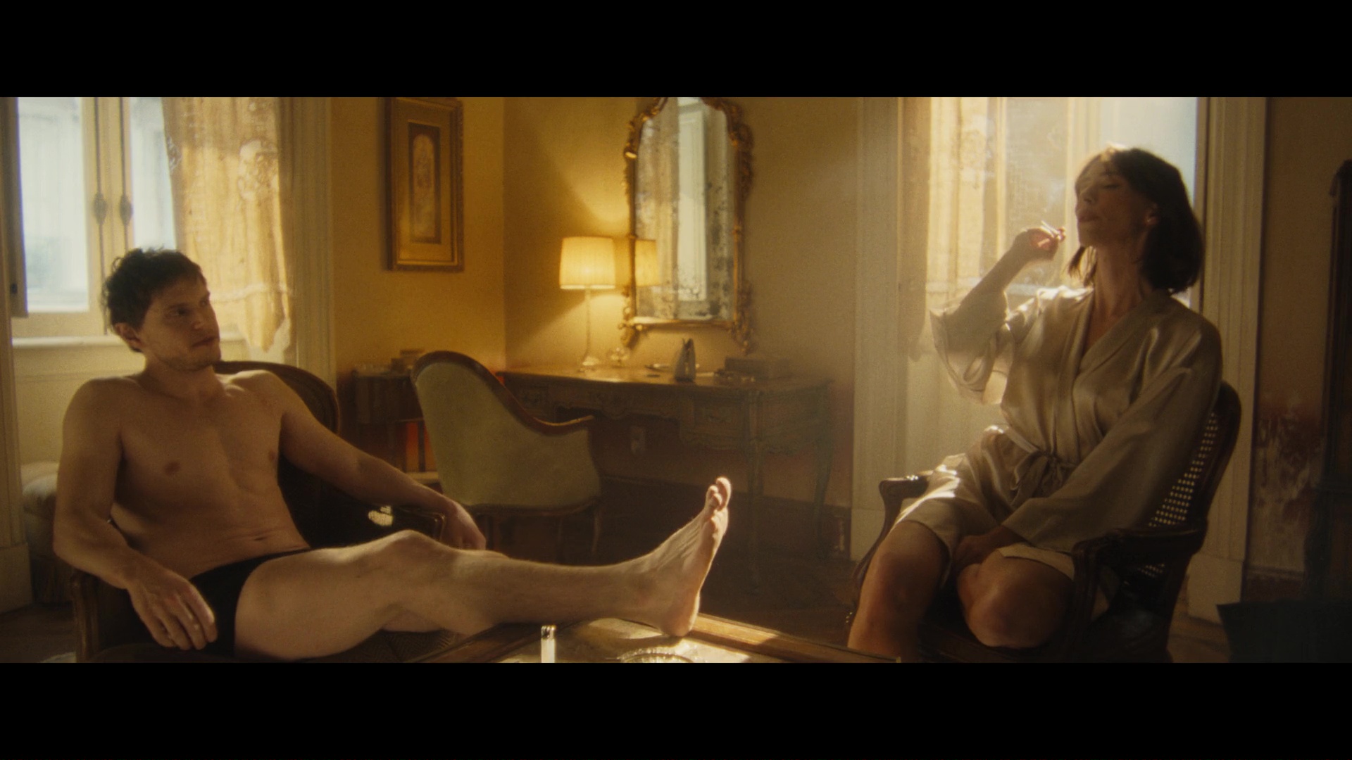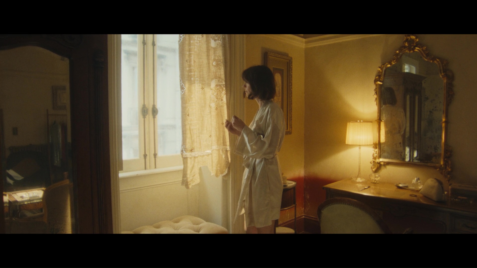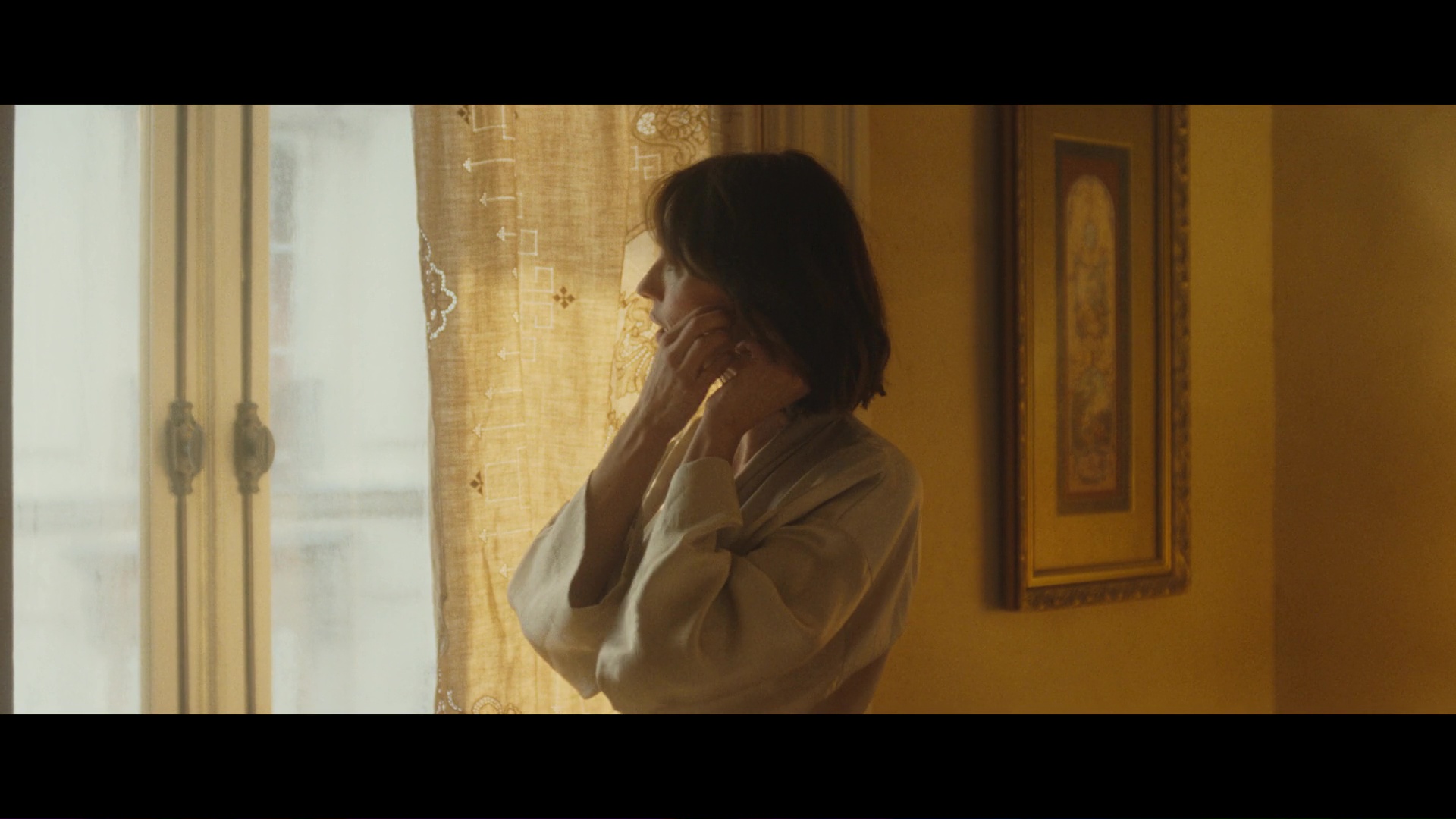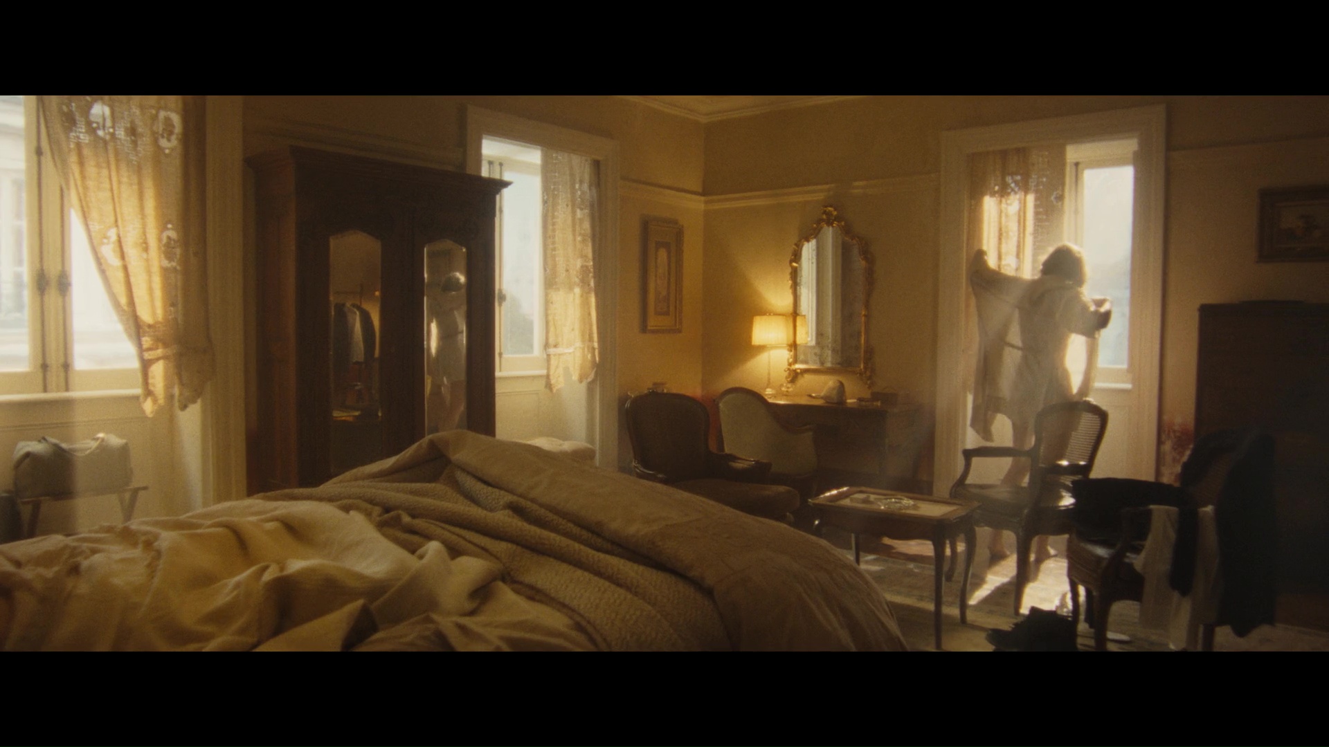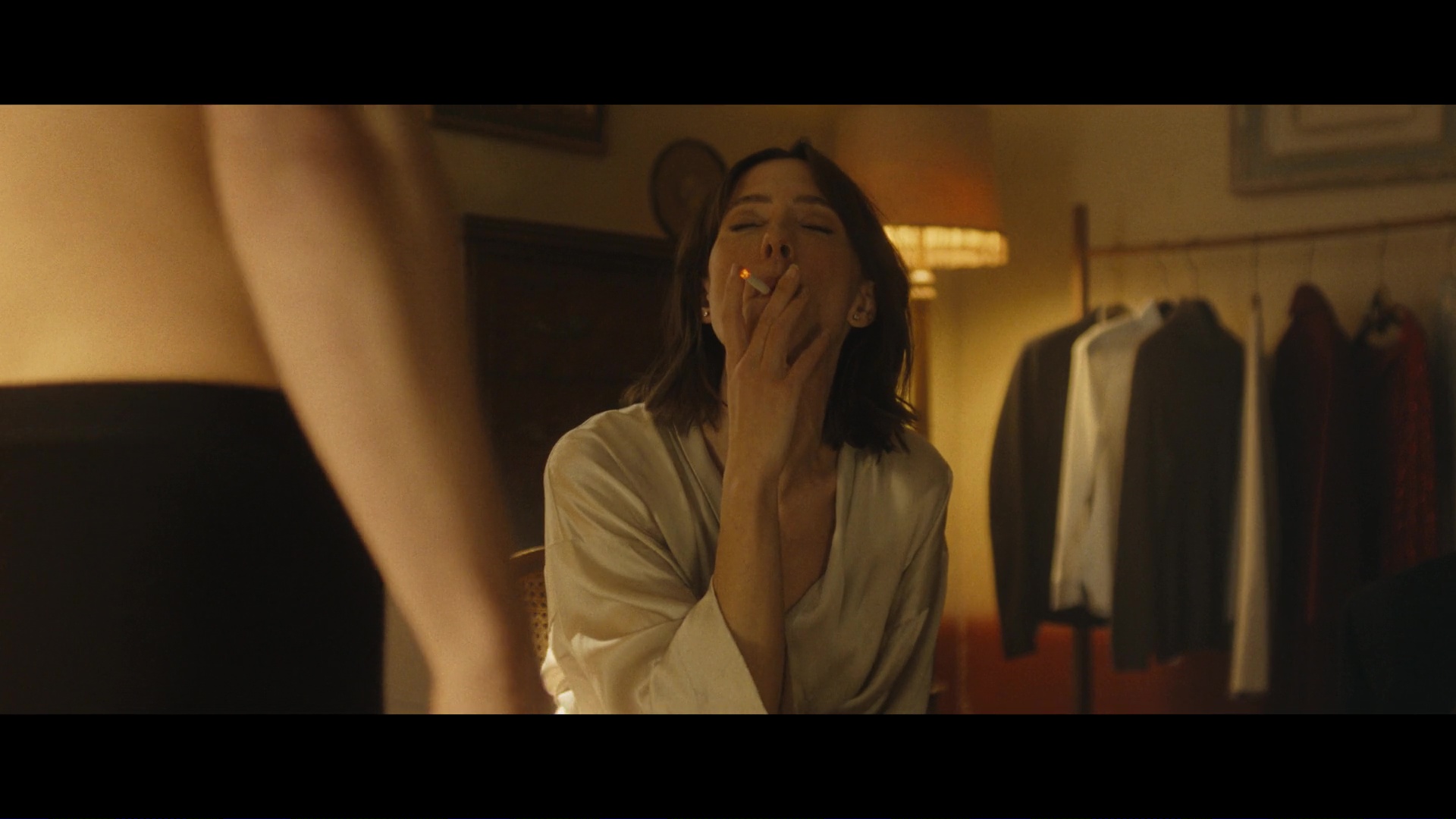 Screencaps from The Beauty episode “Beautiful Pilot”. Rebecca Hall is seen as the character Jordan Bennett in the science fiction series. She wears a light gold satin dressing gown.