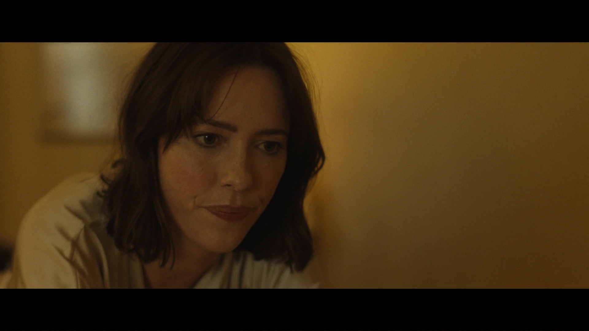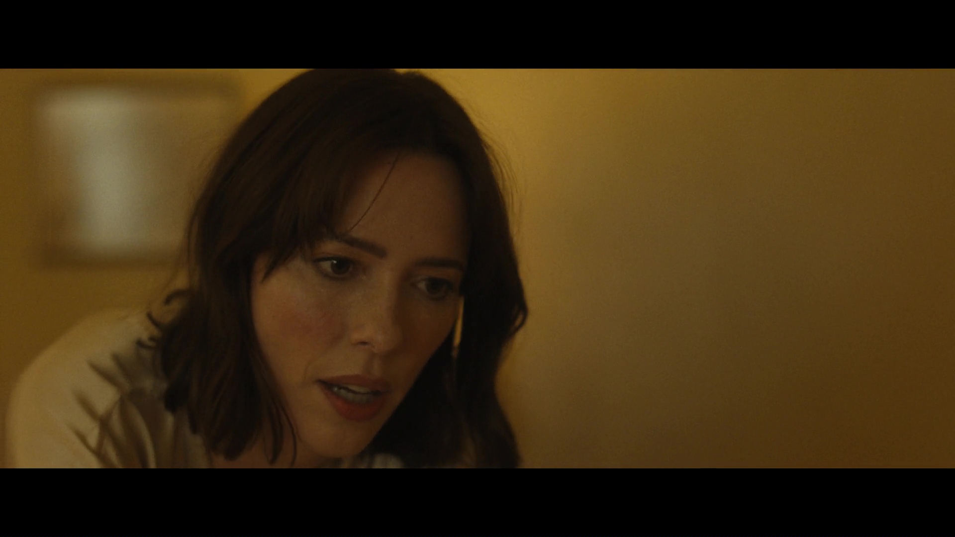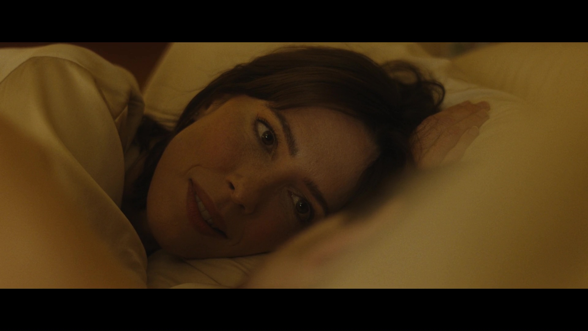 Screencaps from The Beauty episode “Beautiful Pilot”. Rebecca Hall is seen as the character Jordan Bennett in the science fiction series. She wears a light gold satin dressing gown.