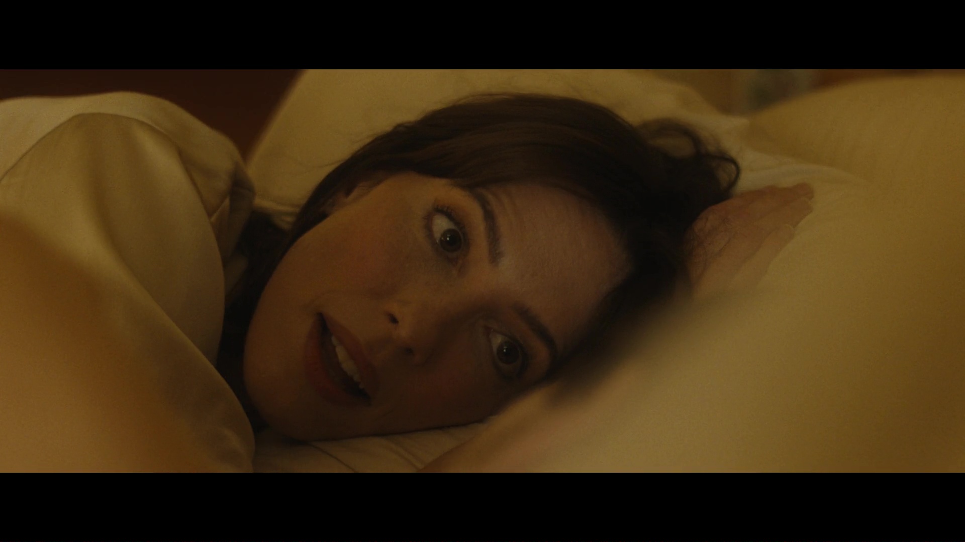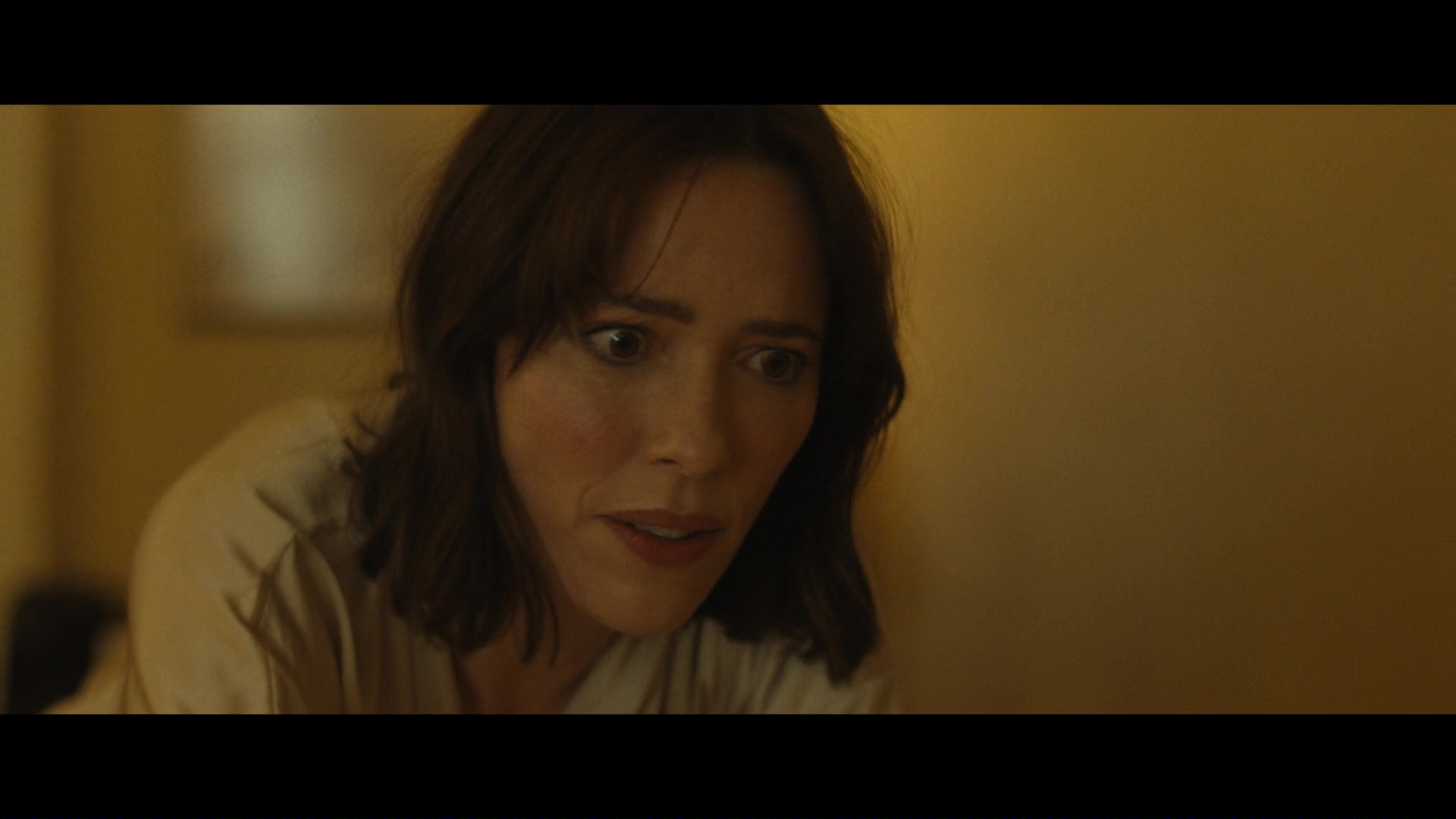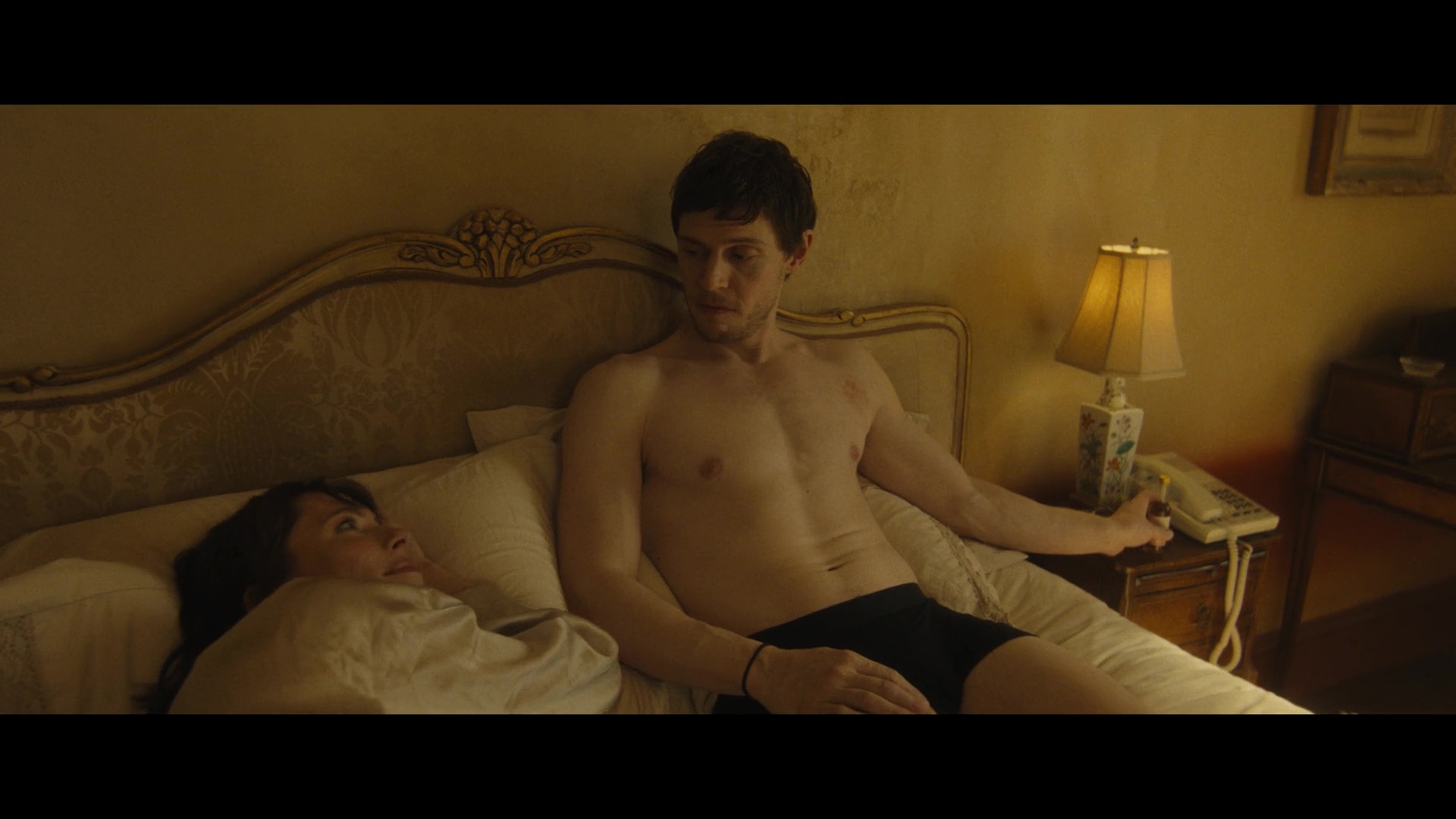 Screencaps from The Beauty episode “Beautiful Pilot”. Rebecca Hall is seen as the character Jordan Bennett in the science fiction series. She wears a light gold satin dressing gown.
