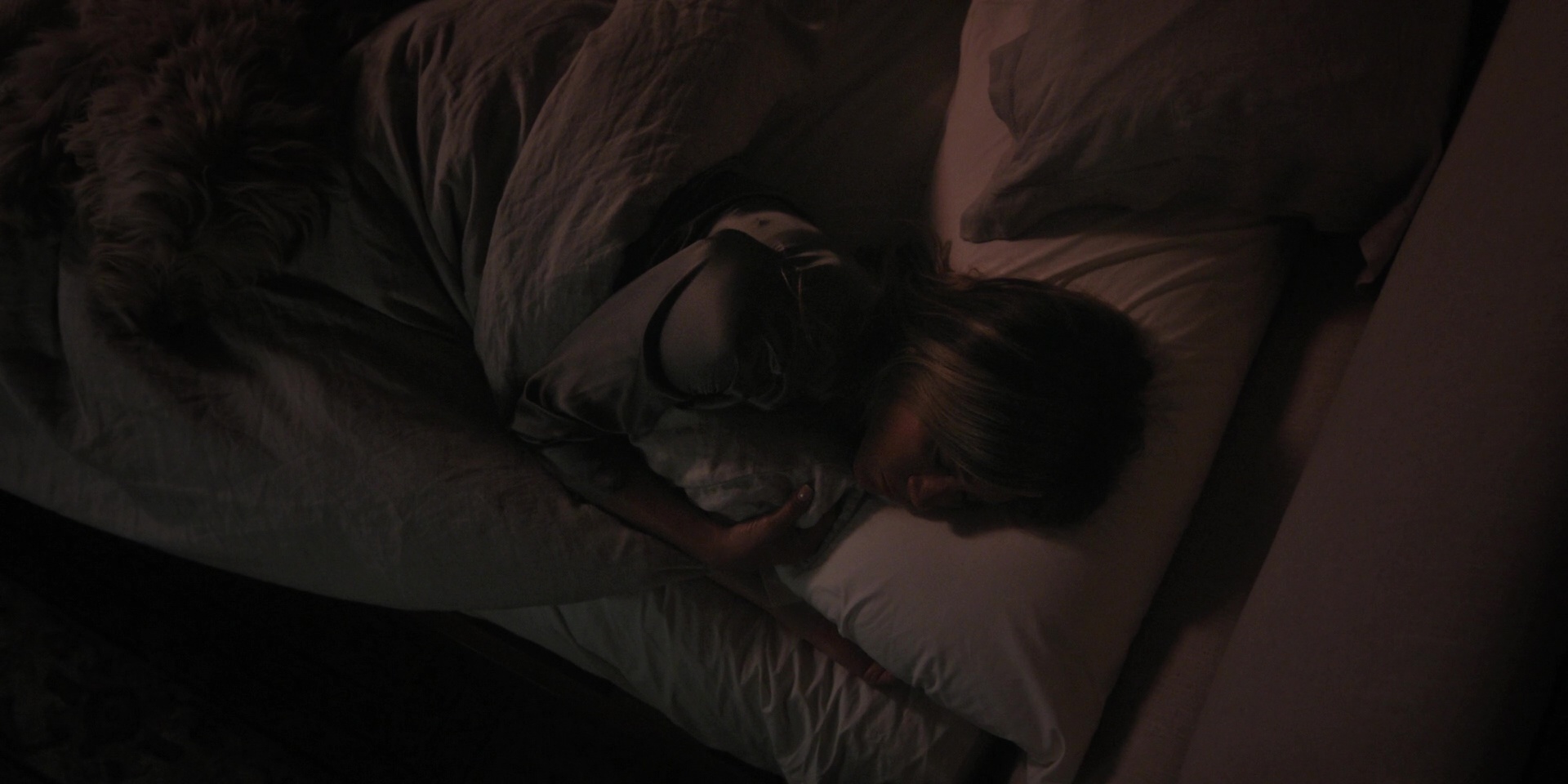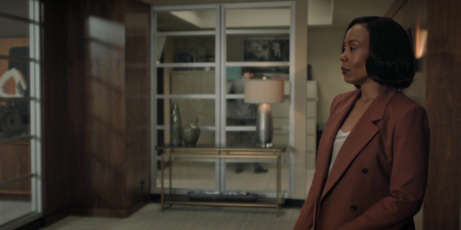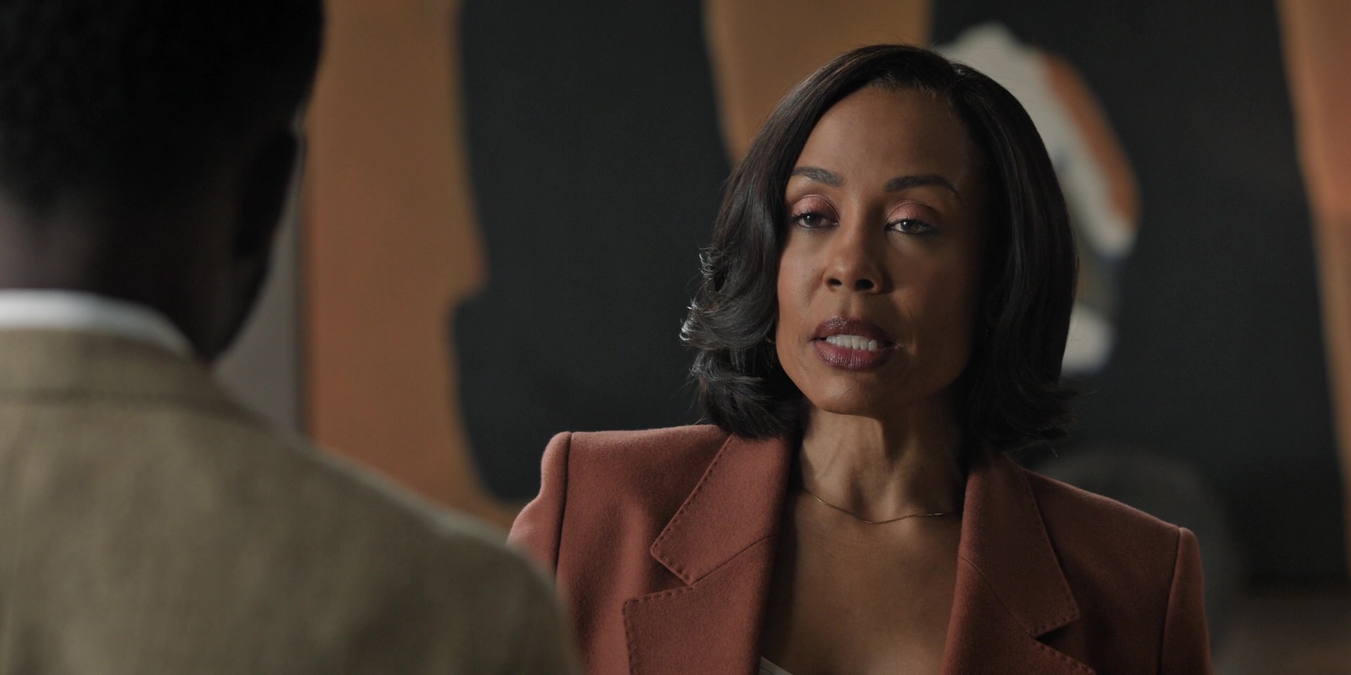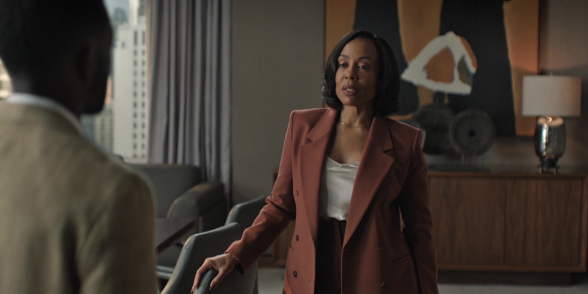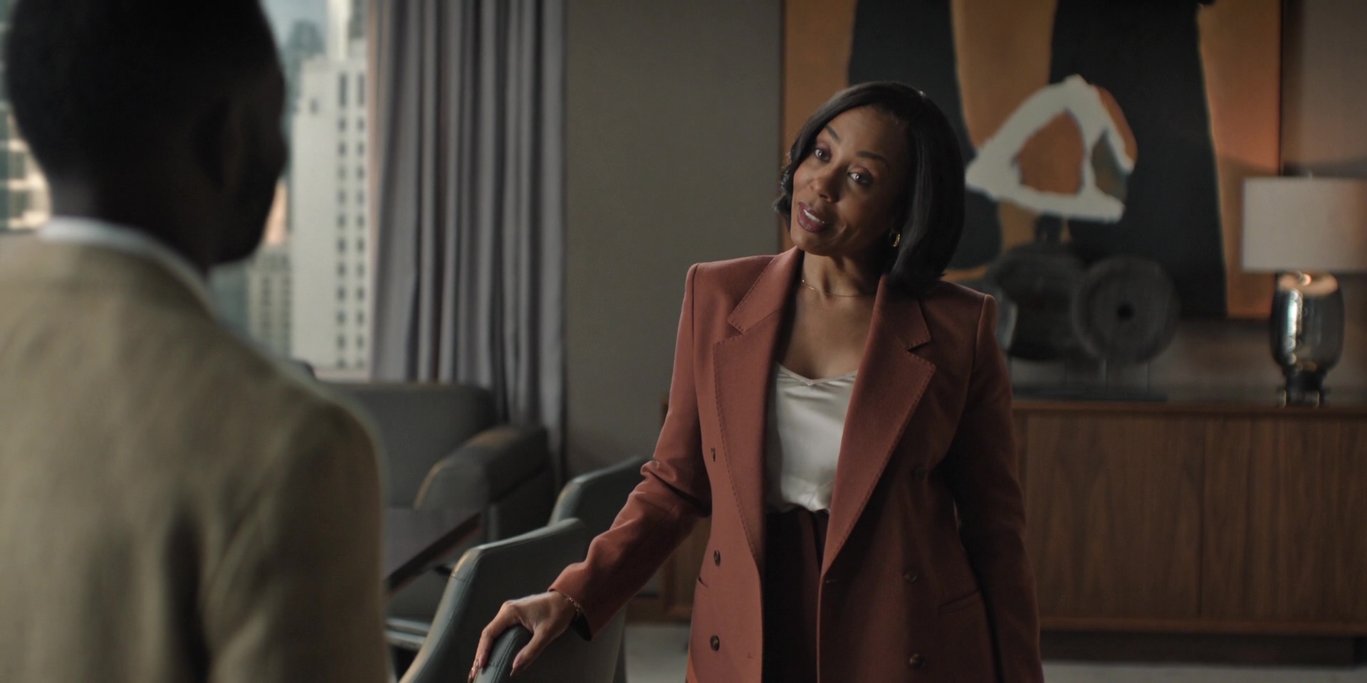 The Morning Show screencaps from the season four episode “Knowing Violation”. Jennifer Aniston wears a pair of gold satin pyjamas. Karen Pittman appears in a white satin camisole top.